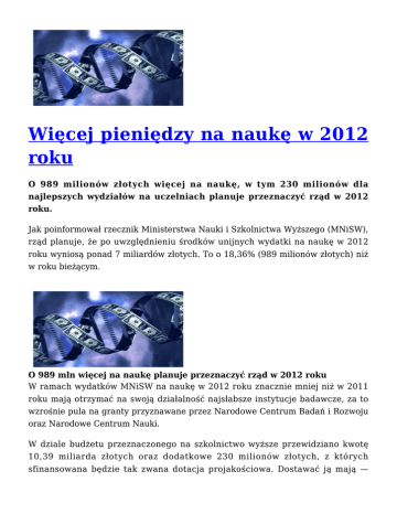 Więcej pieniędzy na naukę w 2012 roku O 989 milionów złotych więcej na naukę, w tym 230 milionów dla najlepszych wydziałów na uczelniach planuje przeznaczyć rząd w 2012 roku. Jak poinformował rzecznik Ministerstwa Nauki i Szkolnictwa Wyższego (MNiSW), rząd planuje, że po uwzględnieniu środków unijnych wydatki na naukę w 2012 roku wyniosą ponad 7 miliardów złotych. To o 18,36% (989 milionów złotych) niż w roku bieżącym. O 989 mln więcej na naukę planuje przeznaczyć rząd w 2012 roku W ramach wydatków MNiSW na naukę w 2012 roku znacznie mniej niż w 2011 roku mają otrzymać na swoją działalność najsłabsze instytucje badawcze, za to wzrośnie pula na granty przyznawane przez Narodowe Centrum Badań i Rozwoju oraz Narodowe Centrum Nauki. W dziale budżetu przeznaczonego na szkolnictwo wyższe przewidziano kwotę 10,39 miliarda złotych oraz dodatkowe 230 milionów złotych, z których sfinansowana będzie tak zwana dotacja projakościowa. Dostawać ją mają — zgodnie z uchwaloną niedawno nowelizacją ustawy o szkolnictwie wyższym — najlepsze wydziały uczelni, które uzyskają status Krajowych Naukowych Ośrodków Wiodących (KNOW). Status KNOW otrzyma na pięć lat wydział lub inna jednostka organizacyjna uczelni, wykazująca się szczególnymi osiągnięciami naukowymi. W tym czasie taka instytucja będzie miała prawo do dotacji, jej pracownicy otrzymają dodatki do pensji, a doktoranci wyższe stypendia. Wprowadzono opłatę za prowadzenie badań naukowych przez firmy Tysiąc złotych — tyle zapłacą prywatne firmy Ministerstwu Zdrowia za zgodę na prowadzenie badań naukowych. Taką kwotę ustalono w rozporządzeniu Ministra Zdrowia w sprawie wysokości opłat za czynności związane z wydawaniem zgody na przeprowadzanie badań naukowych i rozwojowych przez firmy. Nowe przepisy weszły w życie 7 maja 2011 roku. O wydanie zgody na przeprowadzanie prac badawczych przedsiębiorca musi wystąpić do Urzędu Rejestracji Produktów Leczniczych, Wyrobów Medycznych i Produktów Biobójczych. Podstawa prawna: rozporządzenie Ministra Zdrowia z dnia 8 kwietnia 2011 roku. O 989 mln więcej na naukę planuje przeznaczyć rząd w 2012 roku Oskarżony o plagiat rektor złożył dymisję Minister zdrowia Ewa Kopacz przyjęła dymisję oskarżanego o plagiat rektora Wrocławskiej Akademii Medycznej, profesora Ryszarda Andrzejaka. „Rektor Andrzejak zdecydował się na dymisję, ponieważ chce zakończyć zamieszanie na uczelni związane z oskarżeniami wysuwanymi m.in. przez związki zawodowe” – powiedział PAP rzecznik uczelni Arkadiusz Foerster. W listopadzie 2008 roku uczelniany związek Solidarność ’80 oskarżył prof. Andrzejaka, że w swojej pracy habilitacyjnej dopuścił się plagiatu. Miał on według osób stawiających zarzuty przepisać około 90 fragmentów z prac prof. Witolda Zatońskiego i prof. Jolanty Antonowicz-Juchniewicz. Prof. Andrzejak został zawieszony przez minister zdrowia Ewę Kopacz w październiku 2010 roku, w związku z oskarżeniami o plagiat, o czym pisaliśmy jesienią ubiegłego roku. O 989 mln więcej na naukę planuje przeznaczyć rząd w 2012 roku Już w lipcu 2010 roku sprawą zajął się zespół ds. etyki w nauce przy Ministerstwie Nauki i Szkolnictwa Wyższego. Jego członkowie po trzymiesięcznym badaniu sprawy orzekli, że praca habilitacyjna prof. Andrzejaka jest plagiatem. Zespół nie mógł jednak pozbawić rektora stanowiska ani tytułu naukowego. Co ciekawe, wcześniej sprawą plagiatu zajął się powołany przez Ministerstwo Zdrowia rzecznik dyscyplinarny, który nie dopatrzył się nadużyć w pracy prof. Andrzejaka. Sam rektor Andrzejak zaprzecza, jakoby miał popełnić plagiat. Jesienią 2010 roku rozpoczęła się głosowań na wrocławskiej uczelni nad odwołaniem prof. Andrzejaka z funkcji rektora. Pierwsze głosowanie odbyło się pod koniec listopada. Wówczas do odwołania rektora zabrakło siedmiu głosów elektorów. Mimo tego, decyzję Kolegium Elektorów zakwestionowała minister zdrowia. Do drugiego głosowania doszło na początku marca 2011 roku. Wówczas do odwołania rektora zabrakło czterech głosów. Jeszcze jesienią 2010 roku, w konsekwencji przeciągającego się postępowania w sprawie plagiatu rektora na uczelni Centralna Komisja do spraw Stopni i Tytułów 30 września zawiesiła Wydziałowi Lekarskiemu wrocławskiej Akademii Medycznej uprawnienia do nadawania habilitacji i prowadzenia procedur profesorskich. Akademia odwołała się od tej decyzji. Prof. Andrzejak poinformował o zamiarze podania się do dymisji dwa tygodnie temu. Dymisję minister Kopacz przyjęła 29 kwietnia. Meeting EMBO W dniach od 10 do 13 września 2011 roku w Wiedniu odbędzie się kolejny meeting EMBO. EMBO (European Molecular Biology Organization), które promuje najwyższą jakość w biologii molekularnej i biotechnologii, serdecznie zaprasza do uczestnictwa w tej konferencji. Termin nadsyłania abstraktów upływa 22 maja. Do 15 maja obowiązują też niższe ceny dla uczestników. Koszt uczestnictwa wynosi wtedy od 200 do 500 euro, w zależności od pozycji naukowej uczestnika. W ramach bogatego pakietu dla osób towarzyszących, w tym roku EMBO zapewnia między innymi profesjonalną opiekę dla dzieci. Więcej o zjeździe można przeczytać tutaj. Zachęcamy do zapoznania się także z wstępnym, niezwykle ciekawym programem zjazdu. O 989 mln więcej na naukę planuje przeznaczyć rząd w 2012 roku Co z tą nauką? Ministerstwo Nauki i Szkolnictwa Wyższego wydało broszurę, która prezentuje główne założenia wchodzącej właśnie w życie reformy nauki. Wydawnictwo powstało z myślą o przybliżeniu środowisku naukowemu i akademickiemu idei reformy. Jak podaje Ministerstwo, nadrzędnym celem publikacji jest ukazanie szans, jakie otwierają się przed uczonymi, uczelniami i instytucjami dzięki przygotowanym przez Ministerstwo Nauki i Szkolnictwa Wyższego zmianom systemowy