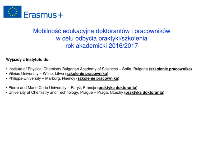 Mobilność edukacyjna doktorantów i pracowników w celu odbycia praktyki/szkolenia rok akademicki 2016/2017 Wyjazdy z Instytutu do: • Institute of Physical Chemistry Bulgarian Academy of Sciences – Sofia, Bułgaria (szkolenie pracownika) • Vilnius University – Wilno, Litwa (szkolenie pracownika) • Philipps-University – Marburg, Niemcy (szkolenie pracownika) • Pierre and Marie Curie University – ParyŜ, Francja (praktyka doktoranta) • University of Chemistry and Technology, Prague – Praga, Czechy (praktyka doktoranta)