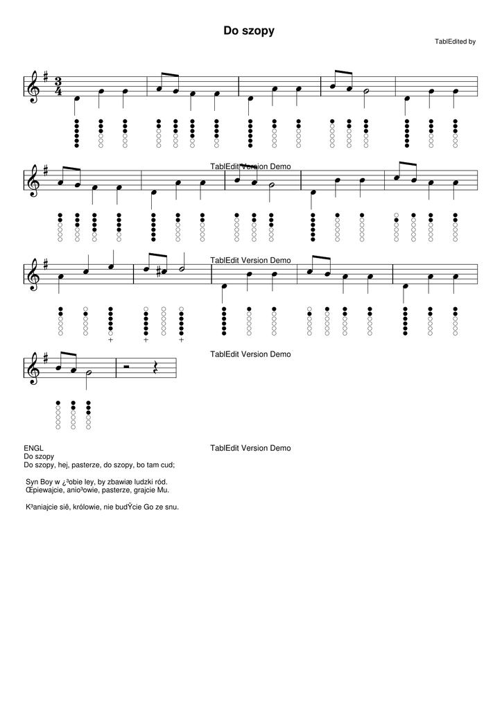 Do szopy TablEdited by # 3 F 4 U F F F # # # U U U U U U U U U V U U U U U U U U #U V -R Q ENGL Do szopy Do szopy, hej, pasterze, do szopy, bo tam cud; Syn Boy w ¿³obie ley, by zbawiæ ludzki ród. Œpiewajcie, anio³owie, pasterze, grajcie Mu. K³aniajcie siê, królowie, nie budŸcie Go ze snu. U U U U U U V TablEdit Version Demo U U TablEdit Version Demo U TablEdit Version Demo TablEdit Version Demo U U V U U U U U U U U U U U U U U U U U U