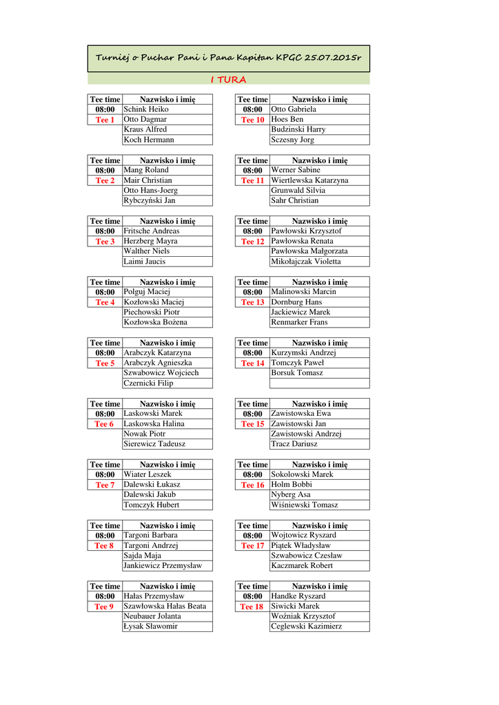 Turniej o Puchar Pani i Pana Kapitan KPGC 25.07.2015r I TURA Tee time Nazwisko i imię 08:00 Schink Heiko Tee 1 Otto Dagmar Kraus Alfred Koch Hermann Tee time Nazwisko i imię 08:00 Otto Gabriela Tee 10 Hoes Ben Budzinski Harry Sczesny Jorg Tee time Nazwisko i imię 08:00 Mang Roland Tee 2 Mair Christian Otto Hans-Joerg Rybczyński Jan Tee time Nazwisko i imię 08:00 Werner Sabine Tee 11 Wiertlewska Katarzyna Grunwald Silvia Sahr Christian Tee time Nazwisko i imię 08:00 Fritsche Andreas Tee 3 Herzberg Mayra Walther Niels Laimi Jaucis Tee time Nazwisko i imię 08:00 Pawłowski Krzysztof Tee 12 Pawłowska Renata Pawłowska Małgorzata Mikołajczak Violetta Tee time Nazwisko i imię 08:00 Polguj Maciej Tee 4 Kozłowski Maciej Piechowski Piotr Kozłowska Bożena Tee time Nazwisko i imię 08:00 Malinowski Marcin Tee 13 Dornburg Hans Jackiewicz Marek Renmarker Frans Tee time Nazwisko i imię 08:00 Arabczyk Katarzyna Tee 5 Arabczyk Agnieszka Szwabowicz Wojciech Czernicki Filip Tee time Nazwisko i imię 08:00 Kurzymski Andrzej Tee 14 Tomczyk Paweł Borsuk Tomasz Tee time Nazwisko i imię 08:00 Laskowski Marek Tee 6 Laskowska Halina Nowak Piotr Sierewicz Tadeusz Tee time Nazwisko i imię 08:00 Zawistowska Ewa Tee 15 Zawistowski Jan Zawistowski Andrzej Tracz Dariusz Tee time Nazwisko i imię 08:00 Wiater Leszek Tee 7 Dalewski Łukasz Dalewski Jakub Tomczyk Hubert Tee time Nazwisko i imię 08:00 Sokolowski Marek Tee 16 Holm Bobbi Nyberg Asa Wiśniewski Tomasz Tee time Nazwisko i imię 08:00 Targoni Barbara Tee 8 Targoni Andrzej Sajda Maja Jankiewicz Przemysław Tee time Nazwisko i imię 08:00 Wojtowicz Ryszard Tee 17 Piątek Władysław Szwabowicz Czesław Kaczmarek Robert Tee time Nazwisko i imię Hałas Przemysław 08:00 Szawłowska Hałas Beata Tee 9 Neubauer Jolanta Łysak Sławomir Tee time Nazwisko i imię Handke Ryszard 08:00 Siwicki Marek Tee 18 Woźniak Krzysztof Ceglewski Kazimierz