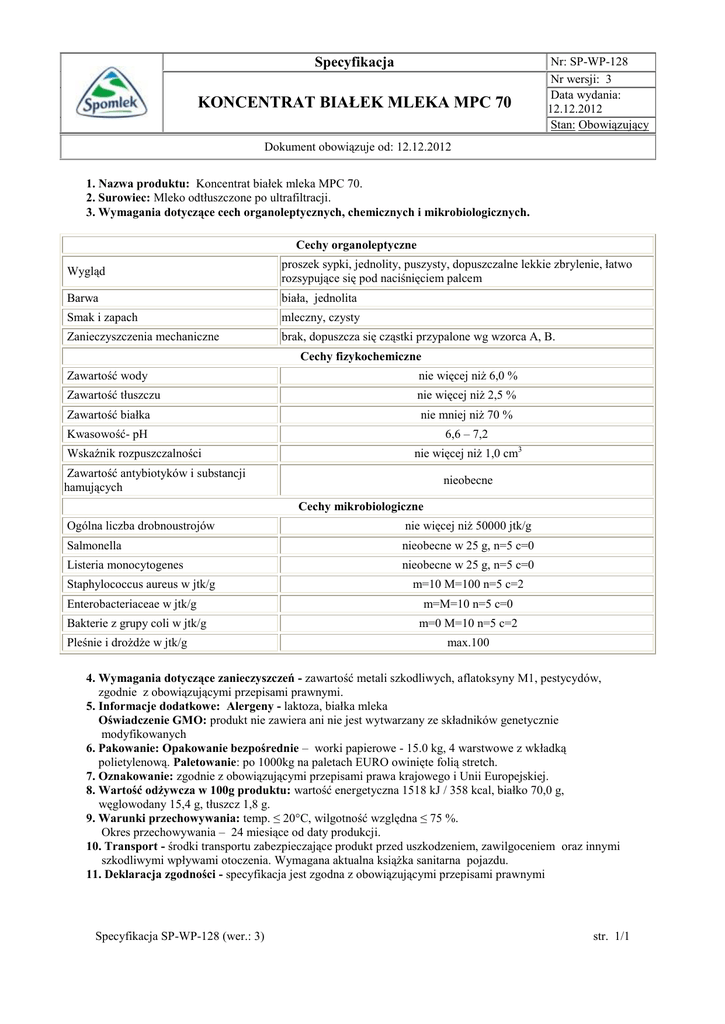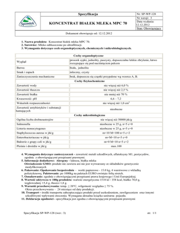 Specyfikacja KONCENTRAT BIAŁEK MLEKA MPC 70 Nr: SP-WP-128 Nr wersji: 3 Data wydania: 12.12.2012 Stan: Obowiązujący Dokument obowiązuje od: 12.12.2012 1. Nazwa produktu: Koncentrat białek mleka MPC 70. 2. Surowiec: Mleko odtłuszczone po ultrafiltracji. 3. Wymagania dotyczące cech organoleptycznych, chemicznych i mikrobiologicznych. Cechy organoleptyczne Wygląd proszek sypki, jednolity, puszysty, dopuszczalne lekkie zbrylenie, łatwo rozsypujące się pod naciśnięciem palcem Barwa biała, jednolita Smak i zapach mleczny, czysty Zanieczyszczenia mechaniczne brak, dopuszcza się cząstki przypalone wg wzorca A, B. Cechy fizykochemiczne Zawartość wody nie więcej niż 6,0 % Zawartość tłuszczu nie więcej niż 2,5 % Zawartość białka nie mniej niż 70 % Kwasowość- pH 6,6 – 7,2 Wskaźnik rozpuszczalności nie więcej niż 1,0 cm3 Zawartość antybiotyków i substancji hamujących nieobecne Cechy mikrobiologiczne Ogólna liczba drobnoustrojów nie więcej niż 50000 jtk/g Salmonella nieobecne w 25 g, n=5 c=0 Listeria monocytogenes nieobecne w 25 g, n=5 c=0 Staphylococcus aureus w jtk/g Enterobacteriaceae w jtk/g Bakterie z grupy coli w jtk/g Pleśnie i drożdże w jtk/g m=10 M=100 n=5 c=2 m=M=10 n=5 c=0 m=0 M=10 n=5 c=2 max.100 4. Wymagania dotyczące zanieczyszczeń - zawartość metali szkodliwych, aflatoksyny M1, pestycydów, zgodnie z obowiązującymi przepisami prawnymi. 5. Informacje dodatkowe: Alergeny - laktoza, białka mleka Oświadczenie GMO: produkt nie zawiera ani nie jest wytwarzany ze składników genetycznie modyfikowanych 6. Pakowanie: Opakowanie bezpośrednie – worki papierowe - 15.0 kg, 4 warstwowe z wkładką polietylenową. Paletowanie: po 1000kg na paletach EURO owinięte folią stretch. 7. Oznakowanie: zgodnie z obowiązującymi przepisami prawa krajowego i Unii Europejskiej. 8. Wartość odżywcza w 100g produktu: wartość energetyczna 1518 kJ / 358 kcal, białko 70,0 g, węglowodany 15,4 g, tłuszcz 1,8 g. 9. Warunki przechowywania: temp. ≤ 20°C, wilgotność względna ≤ 75 %. Okres przechowywania – 24 miesiące od daty produkcji. 10. Transport - środki transportu zabezpieczające produkt przed uszkodzeniem, zawilgoceniem oraz innymi szkodliwymi wpływami otoczenia. Wymagana aktualna książka sanitarna pojazdu. 11. Deklaracja zgodności - specyfikacja jest zgodna z obowiązującymi przepisami prawnymi Specyfikacja SP-WP-128 (wer.: 3) str. 1/1