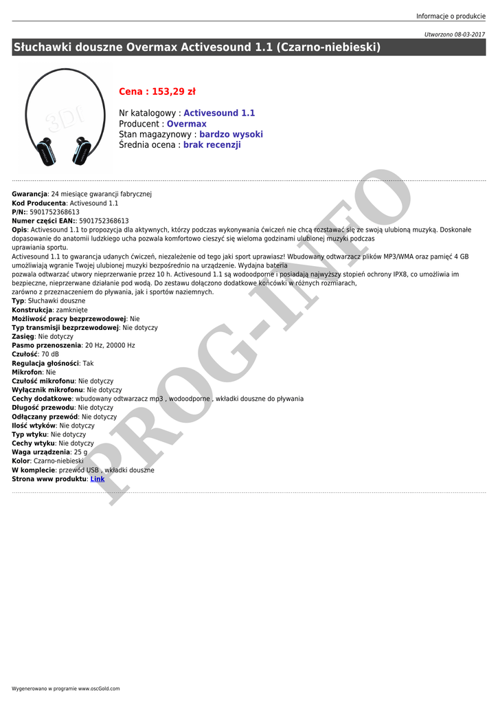 Informacje o produkcie Utworzono 08-03-2017 Słuchawki douszne Overmax Activesound 1.1 (Czarno-niebieski) Cena : 153,29 zł Nr katalogowy : Activesound 1.1 Producent : Overmax Stan magazynowy : bardzo wysoki Średnia ocena : brak recenzji PR O G -I N FO Gwarancja: 24 miesiące gwarancji fabrycznej Kod Producenta: Activesound 1.1 P/N:: 5901752368613 Numer części EAN:: 5901752368613 Opis: Activesound 1.1 to propozycja dla aktywnych, którzy podczas wykonywania ćwiczeń nie chcą rozstawać się ze swoją ulubioną muzyką. Doskonałe dopasowanie do anatomii ludzkiego ucha pozwala komfortowo cieszyć się wieloma godzinami ulubionej muzyki podczas uprawiania sportu. Activesound 1.1 to gwarancja udanych ćwiczeń, niezależenie od tego jaki sport uprawiasz! Wbudowany odtwarzacz plików MP3/WMA oraz pamięć 4 GB umożliwiają wgranie Twojej ulubionej muzyki bezpośrednio na urządzenie. Wydajna bateria pozwala odtwarzać utwory nieprzerwanie przez 10 h. Activesound 1.1 są wodoodporne i posiadają najwyższy stopień ochrony IPX8, co umożliwia im bezpieczne, nieprzerwane działanie pod wodą. Do zestawu dołączono dodatkowe końcówki w różnych rozmiarach, zarówno z przeznaczeniem do pływania, jak i sportów naziemnych. Typ: Słuchawki douszne Konstrukcja: zamknięte Możliwość pracy bezprzewodowej: Nie Typ transmisji bezprzewodowej: Nie dotyczy Zasięg: Nie dotyczy Pasmo przenoszenia: 20 Hz, 20000 Hz Czułość: 70 dB Regulacja głośności: Tak Mikrofon: Nie Czułość mikrofonu: Nie dotyczy Wyłącznik mikrofonu: Nie dotyczy Cechy dodatkowe: wbudowany odtwarzacz mp3 , wodoodporne , wkładki douszne do pływania Długość przewodu: Nie dotyczy Odłączany przewód: Nie dotyczy Ilość wtyków: Nie dotyczy Typ wtyku: Nie dotyczy Cechy wtyku: Nie dotyczy Waga urządzenia: 25 g Kolor: Czarno-niebieski W komplecie: przewód USB , wkładki douszne Strona www produktu: Link Wygenerowano w programie www.oscGold.com