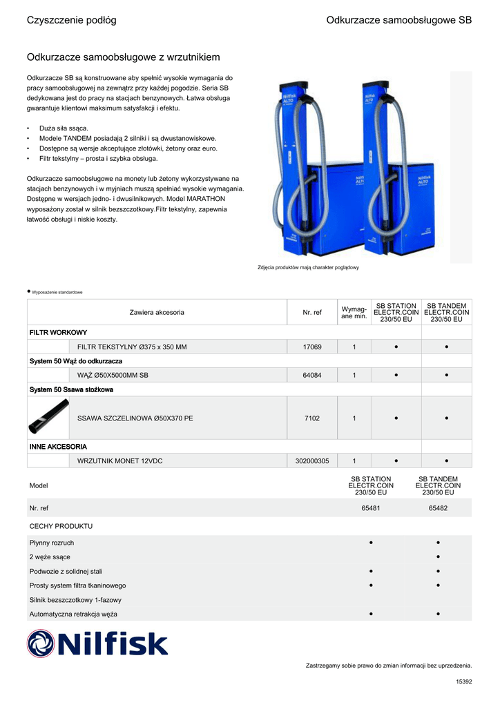 Czyszczenie podłóg Odkurzacze samoobsługowe SB Odkurzacze samoobsługowe z wrzutnikiem Odkurzacze SB są konstruowane aby spełnić wysokie wymagania do pracy samoobsługowej na zewnątrz przy każdej pogodzie. Seria SB dedykowana jest do pracy na stacjach benzynowych. Łatwa obsługa gwarantuje klientowi maksimum satysfakcji i efektu. • • • • Duża siła ssąca. Modele TANDEM posiadają 2 silniki i są dwustanowiskowe. Dostępne są wersje akceptujące złotówki, żetony oraz euro. Filtr tekstylny – prosta i szybka obsługa. Odkurzacze samoobsługowe na monety lub żetony wykorzystywane na stacjach benzynowych i w myjniach muszą spełniać wysokie wymagania. Dostępne w wersjach jedno- i dwusilnikowych. Model MARATHON wyposażony został w silnik bezszczotkowy.Filtr tekstylny, zapewnia łatwość obsługi i niskie koszty. Zdjęcia produktów mają charakter poglądowy ● Wyposażenie standardowe Zawiera akcesoria Nr. ref SB TANDEM Wymag SB STATION ELECTR.COIN ane min. ELECTR.COIN 230/50 EU 230/50 EU FILTR WORKOWY FILTR TEKSTYLNY Ø375 x 350 MM 17069 1 ● ● 64084 1 ● ● 7102 1 ● ● 302000305 1 ● ● System 50 Wąż do odkurzacza WĄŻ Ø50X5000MM SB System 50 Ssawa stożkowa SSAWA SZCZELINOWA Ø50X370 PE INNE AKCESORIA WRZUTNIK MONET 12VDC Model SB STATION ELECTR.COIN 230/50 EU SB TANDEM ELECTR.COIN 230/50 EU Nr. ref 65481 65482 ● ● CECHY PRODUKTU Płynny rozruch 2 węże ssące ● Podwozie z solidnej stali ● ● Prosty system filtra tkaninowego ● ● ● ● Silnik bezszczotkowy 1-fazowy Automatyczna retrakcja węża Zastrzegamy sobie prawo do zmian informacji bez uprzedzenia. 15392 Czyszczenie podłóg Odkurzacze samoobsługowe SB Odkurzacze samoobsługowe z wrzutnikiem Model SB STATION ELECTR.COIN 230/50 EU SB TANDEM ELECTR.COIN 230/50 EU Nr. ref 65481 65482 CECHY PRODUKTU Dwa silniki ● Uchwyt na wąż ● ● Dane techniczne SB STATION ELECTR.COIN 230/50 EU SB TANDEM ELECTR.COIN 230/50 EU Moc pmaks. (W) 1700 2 x 1700 Moc piec (W) 1400 2 x 1400 230/1/50-60/16 230/1/50-60/16 4000 2 x 4000 235/23.5 2 x 235/23.5 Poziom hałasu (dB(A)) 75 75 Pojemność pojemnika (maks l.) 30 2 x 30 Needle felt Needle felt 82.2 x 54.6 x 203.4 118.3 x 54.6 x 203.4 90 115 Zasilanie (V/~/Hz/A) Wielkość przepływ powietrza (l/min) Podciśnienie (mbar/kPA) Typ filtra głównego Długość x szerokość x wysokość (cm) Ciężar (kg) ● Wyposażenie standardowe, ○ Akcesoria opcjonalne, □ Montaż w fabryce Akcesoria Nr. ref SB TANDEM Wymag SB STATION ane min. ELECTR.COIN ELECTR.COIN 230/50 EU 230/50 EU System 50 Szczotki uniwersalne SSAWA Ø50X175 PP 5153 1 ○ ○ SSAWA OKRĄGŁA Z WŁOSIEM Ø50MM 40458 1 ○ ○ 302000305 1 ● ● 5544 1 ○ ○ 19936 1 ○ ○ INNE AKCESORIA WRZUTNIK MONET 12VDC ŻETONY 50 SZT System 50 Ssawa stożkowa SSAWA STOŻKOWA GUMA Ø50MM Zastrzegamy sobie prawo do zmian informacji bez uprzedzenia. 15392 Czyszczenie podłóg Odkurzacze samoobsługowe SB Odkurzacze samoobsługowe z wrzutnikiem Akcesoria Nr. ref SB TANDEM Wymag SB STATION ELECTR.COIN ane min. ELECTR.COIN 230/50 EU 230/50 EU SSAWA SZCZELINOWA Ø50X370 PE 7102 1 ● ● SSAWKA GUMOWA SKOŚNA Ø50 MM 7868 1 ○ ○ SSAWKA PŁASKA GUMOWA Ø50 MM 31244 1 ○ ○ ADAPTER Ø50-36 MM 40452 1 ○ ○ UCHWYT WYGIĘTY Ø50-36 15341 1 ○ ○ 17069 1 ● ● 64084 1 ● ● System 50 Rury FILTR WORKOWY FILTR TEKSTYLNY Ø375 x 350 MM System 50 Wąż do odkurzacza WĄŻ Ø50X5000MM SB Zastrzegamy sobie prawo do zmian informacji bez uprzedzenia. 15392