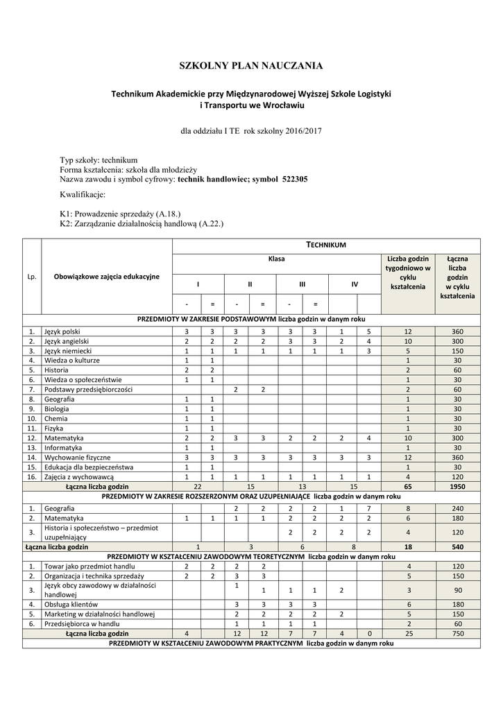SZKOLNY PLAN NAUCZANIA Technikum Akademickie przy Międzynarodowej Wyższej Szkole Logistyki i Transportu we Wrocławiu dla oddziału I TE rok szkolny 2016/2017 Typ szkoły: technikum Forma kształcenia: szkoła dla młodzieży Nazwa zawodu i symbol cyfrowy: technik handlowiec; symbol 522305 Kwalifikacje: K1: Prowadzenie sprzedaży (A.18.) K2: Zarządzanie działalnością handlową (A.22.) TECHNIKUM Klasa Lp. Obowiązkowe zajęcia edukacyjne I - II = - III = - IV Liczba godzin tygodniowo w cyklu kształcenia Łączna liczba godzin w cyklu kształcenia 12 10 5 1 2 1 2 1 1 1 1 10 1 12 1 4 65 360 300 150 30 60 30 60 30 30 30 30 300 30 360 30 120 1950 8 6 240 180 4 120 18 540 4 5 120 150 3 90 6 5 2 25 180 150 60 750 = PRZEDMIOTY W ZAKRESIE PODSTAWOWYM liczba godzin w danym roku 1. 2. 3. 4. 5. 6. 7. 8. 9. 10. 11. 12. 13. 14. 15. 16. 1. 2. Język polski 3 3 3 3 3 Język angielski 2 2 2 2 3 Język niemiecki 1 1 1 1 1 Wiedza o kulturze 1 1 Historia 2 2 Wiedza o społeczeństwie 1 1 Podstawy przedsiębiorczości 2 2 Geografia 1 1 Biologia 1 1 Chemia 1 1 Fizyka 1 1 Matematyka 2 2 3 3 2 Informatyka 1 1 Wychowanie fizyczne 3 3 3 3 3 Edukacja dla bezpieczeństwa 1 1 Zajęcia z wychowawcą 1 1 1 1 1 Łączna liczba godzin 22 15 13 PRZEDMIOTY W ZAKRESIE ROZSZERZONYM ORAZ UZUPEŁNIAJĄCE 3 3 1 1 2 1 5 4 3 2 2 4 3 3 3 1 1 1 15 liczba godzin w danym roku Geografia 2 2 2 2 1 7 Matematyka 1 1 1 1 2 2 2 2 Historia i społeczeństwo – przedmiot 3. 2 2 2 2 uzupełniający Łączna liczba godzin 1 3 6 8 PRZEDMIOTY W KSZTAŁCENIU ZAWODOWYM TEORETYCZNYM liczba godzin w danym roku 1. Towar jako przedmiot handlu 2 2 2 2 2. Organizacja i technika sprzedaży 2 2 3 3 Język obcy zawodowy w działalności 1 3. 1 1 1 2 handlowej 4. Obsługa klientów 3 3 3 3 5. Marketing w działalności handlowej 2 2 2 2 2 6. Przedsiębiorca w handlu 1 1 1 1 Łączna liczba godzin 4 12 12 7 7 4 0 PRZEDMIOTY W KSZTAŁCENIU ZAWODOWYM PRAKTYCZNYM liczba godzin w danym roku 1. Pracownia sprzedaży 2. Symulacyjna firma handlowa Łączna liczba godzin Łączna liczba godzin kształcenia zawodowego Tygodniowy wymiar godzin obowiązkowych zajęć edukacyjnych 6 6 6 10 6 10 33 5 5 5 17 5 17 4 4 8 15 35 4 4 8 15 34 12 16 0 31 15 10 3 50 450 300 750 1500 133 3990 ** zajęcia odbywają się w pracowniach szkolnych oraz u pracodawcy Do celów obliczeniowych przyjęto 30 tygodni w ciągu jednego roku szkolnego W szkolnym planie uwzględnione zostaną zajęcia z religii lub etyki w wymiarze 2godzin/tydzień w każdej klasie oraz wychowania do życia w rodzinie w wymiarze 14godzin/rok szkolny. Wymiar praktyk zawodowych kl. I - zgodnie z podstawą programową kl. II - zgodnie z podstawą programową kl. III - zgodnie z podstawą programową kl. IV - zgodnie z podstawą programową łącznie tyg. godz. 4 4 Egzamin potwierdzający pierwszą kwalifikację (A18) odbywa się pod koniec II semestru III klasy. Egzamin potwierdzający drugą kwalifikację (A22) odbywa się pod koniec I semestru IV klasy. 0 0 160 0 160