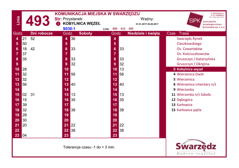 Linia 493 KOMUNIKACJA MIEJSKA W SWARZĘDZU Ważny: Str: Przystanek: ❶ KOBYLNICA WĘZEŁ S030-1 Godz. Dni robocze Godz. Soboty 4 21 52 4 36 5 50 5 6 18 42 6 33 7 37 7 8 35 8 33 9 9 32 10 28 10 11 32 11 56 12 32 12 13 56 13 40 14 14 15 02 31 15 13 16 15 16 35 17 39 17 18 32 18 38 19 28 19 20 30 20 21 20 21 22 22 22 38 23 04 23 01.01.2017-30.06.2017 Linie: 400 412 492 Godz. Niedziele i święta 4 5 6 33 7 8 33 9 32 10 13 11 56 12 13 40 14 15 13 16 35 17 18 38 19 20 21 22 22 38 23 Tolerancja czasu -1 do + 3 min. Czas Trasa Swarzędz Rynek Cieszkowskiego Os. Czwartaków Os. Kościuszkowców Gruszczyn / Katarzyńska Gruszczyn / Okrężna 0 Kobylnica węzeł 4 Wierzenica Dwór 5 Wierzenica 6 Wierzenica cmentarz n/ż 9 Wierzonka 11 Wierzonka n/ż Szkoła 12 Dębogóra 13 Karłowice 15 Karłowice pętla