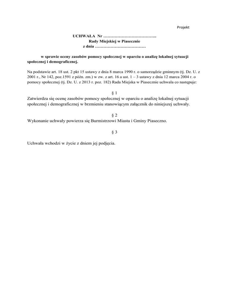 Projekt UCHWAŁA Nr ……………………………….. Rady Miejskiej w Piasecznie z dnia ……………………………… w sprawie oceny zasobów pomocy społecznej w oparciu o analizę lokalnej sytuacji społecznej i demograficznej. Na podstawie art. 18 ust. 2 pkt 15 ustawy z dnia 8 marca 1990 r. o samorządzie gminnym (tj. Dz. U. z 2001 r., Nr 142, poz.1591 z późn. zm.) w zw. z art. 16 a ust. 1 – 3 ustawy z dnia 12 marca 2004 r. o pomocy społecznej (tj. Dz. U. z 2013 r. poz. 182) Rada Miejska w Piasecznie uchwala co następuje: §1 Zatwierdza się ocenę zasobów pomocy społecznej w oparciu o analizę lokalnej sytuacji społecznej i demograficznej w brzmieniu stanowiącym załącznik do niniejszej uchwały. §2 Wykonanie uchwały powierza się Burmistrzowi Miasta i Gminy Piaseczno. §3 Uchwała wchodzi w życie z dniem jej podjęcia. Uzasadnienie Na podstawie art. 16 a ust. 1 – 3 ustawy z dnia 12 marca 2004 r. o pomocy społecznej (t.j. Dz. U. z 2013 r. poz. 182), Gminy przygotowują ocenę zasobów pomocy społecznej w oparciu o analizę lokalnej sytuacji społecznej i demograficznej. Przedstawiona uchwała stanowi zatem wykonanie obowiązku ustawowego.