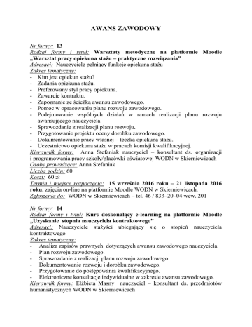 AWANS ZAWODOWY Nr formy: 13 Rodzaj formy i tytuł: Warsztaty metodyczne na platformie Moodle „Warsztat pracy opiekuna stażu – praktyczne rozwiązania” Adresaci: Nauczyciele pełniący funkcje opiekuna stażu Zakres tematyczny: - Kim jest opiekun stażu? - Zadania opiekuna stażu. - Preferowany styl pracy opiekuna. - Zawarcie kontraktu. - Zapoznanie ze ścieżką awansu zawodowego. - Pomoc w opracowaniu planu rozwoju zawodowego. - Podejmowanie wspólnych działań w ramach realizacji planu rozwoju awansującego nauczyciela. - Sprawozdanie z realizacji planu rozwoju. - Przygotowanie projektu oceny dorobku zawodowego. - Dokumentowanie pracy własnej – teczka opiekuna stażu. - Uczestnictwo opiekuna stażu w pracach komisji kwalifikacyjnej. Kierownik formy: Anna Stefaniak nauczyciel – konsultant ds. organizacji i programowania pracy szkoły/placówki oświatowej WODN w Skierniewicach Osoby prowadzące: Anna Stefaniak Liczba godzin: 60 Koszt: 60 zł Termin i miejsce rozpoczęcia: 15 września 2016 roku – 21 listopada 2016 roku, zajęcia on-line na platformie Moodle WODN w Skierniewicach. Zgłoszenia do: WODN w Skierniewicach – tel. 46 / 833–20–04 wew. 201 Nr formy: 14 Rodzaj formy i tytuł: Kurs doskonalący e-learning na platformie Moodle „Uzyskanie stopnia nauczyciela kontraktowego” Adresaci: Nauczyciele stażyści ubiegający się o stopień nauczyciela kontraktowego Zakres tematyczny: - Analiza zapisów prawnych dotyczących awansu zawodowego nauczyciela. - Plan rozwoju zawodowego. - Sprawozdanie z realizacji planu rozwoju zawodowego. - Dokumentowanie rozwoju i dorobku zawodowego. - Przygotowanie do postępowania kwalifikacyjnego. - Elektroniczne konsultacje indywidualne w zakresie awansu zawodowego. Kierownik formy: Elżbieta Masny nauczyciel – konsultant ds. przedmiotów humanistycznych WODN w Skierniewicach Osoby prowadzące: Elżbieta Masny, Iwona Leśniewicz – nauczyciel przyrody i biologii, ekspert komisji kwalifikacyjnych w zakresie awansu zawodowego Liczba godzin: 40 Koszt: 40 zł Termin i miejsce rozpoczęcia: I termin 19 września 2016 roku, godz. 1500, WODN w Skierniewicach, ul. Batorego 64D II termin 11 stycznia 2017 roku, godz. 1500, WODN w Skierniewicach, ul. Batorego 64D Zgłoszenia do: WODN w Skierniewicach – tel. 46 / 833–20–04, wew. 201 Nr formy: 15 Rodzaj formy i tytuł: Kurs doskonalący e-learning na platformie Moodle „Uzyskanie stopnia nauczyciela mianowanego” Adresaci: Nauczyciele kontraktowi ubiegający się o stopień nauczyciela mianowanego Zakres tematyczny: - Przybliżenie problematyki awansu zawodowego nauczycieli. - Przygotowanie dokumentacji formalnej. - Obudowa prawna dotycząca awansu zawodowego nauczyciela. - Realizacja stażu i przygotowanie do postępowania egzaminacyjnego. - Elektroniczne konsultacje indywidualne w zakresie awansu zawodowego. Kierownik formy: Elżbieta Masny nauczyciel – konsultant ds. przedmiotów humanistycznych WODN w Skierniewicach Osoby prowadzące: Elżbieta Masny, Iwona Leśniewicz – nauczyciel przyrody i biologii, ekspert komisji kwalifikacyjnych w zakresie awansu zawodowego Liczba godzin: 40 Koszt: 40 zł Termin i miejsce rozpoczęcia: I termin 3 października 2016 roku, godz. 1500, WODN w Skierniewicach, ul. Batorego 64D II termin 8 maja 2017 roku, godz. 1500, WODN w Skierniewicach, ul. Batorego 64D Zgłoszenia do: WODN w Skierniewicach – tel. 46 / 833–20–04, wew. 201 Nr formy: 16 Rodzaj formy i tytuł: Kurs doskonalący e-learning na platformie Moodle „Uzyskanie stopnia nauczyciela dyplomowanego” Adresaci: Nauczyciele ubiegający się o stopień nauczyciela dyplomowanego Zakres tematyczny: - Procedura prawna dotycząca awansu zawodowego nauczycieli. 2 INFORMATOR FORM KSZTAŁCENIA USTAWICZNEGO WODN w Skierniewicach: IX 2016 r. - VIII 2017 r. - Omówienie wymagań niezbędnych do uzyskania stopnia nauczyciela dyplomowanego. - Przygotowanie opisu i analizy rozpoznawania i rozwiązywania problemu edukacyjnego, wychowawczego lub organizacyjno-programowego. - Elektroniczne konsultacje indywidualne w zakresie awansu zawodowego. Kierownik formy: Elżbieta Masny nauczyciel – konsultant ds. przedmiotów humanistycznych WODN w Skierniewicach Osoby prowadzące: Elżbieta Masny, Iwona Leśniewicz – nauczyciel przyrody i biologii, ekspert komisji kwalifikacyjnych w zakresie awansu zawodowego Liczba godzin: 40 Koszt: 40 zł Termin i miejsce rozpoczęcia: I termin 5 października 2016 roku, godz. 1500, WODN w Skierniewicach, ul. Batorego 64D II termin 10 maja 2017 roku, godz. 1500, WODN w Skierniewicach, ul. Batorego 64D Zgłoszenia do: WODN w Skierniewicach – tel. 46 / 833–20–04, wew. 201 Nr formy: 17 Rodzaj formy i tytuł: Seminarium „Realizacja wymagań na stopień nauczyciela mianowanego” Adresaci: Nauczyciele wszystkich typów szkół Zakres tematyczny: Analiza wymagań na stopień nauczyciela mianowanego. Plan rozwoju zawodowego i sprawozdanie z jego realizacji. Struktura dokumentacji na posiedzenie komisji egzaminacyjnej. Zasady prezentacji dorobku zawodowego nauczyciela przed komisją egzaminacyjną. Kierownik formy: Agata Lipska – doradca metodyczny ds. przedmiotów zawodowych WODN w Skierniewicach Osoby prowadzące: Agata Lipska Liczba godzin: 5 Koszt: nieodpłatnie Termin i miejsce rozpoczęcia: 8 grudnia 2016 roku, godz. 1415, Zespół Szkół Centrum Edukacji Zawodowej i Ustawicznej w Rawie Mazowieckiej, ul. Zwolińskiego 46 Zgłoszenia do: WODN w Skierniewicach – tel. 46 / 833–20–04 wew. 201 3 INFORMATOR FORM KSZTAŁCENIA USTAWICZNEGO WODN w Skierniewicach: IX 2016 r. - VIII 2017 r. Nr formy: 18 Rodzaj formy i tytuł: Seminarium „Co nauczyciel stażysta i kontraktowy o prawie oświatowym wiedzieć powinien?” Adresaci: Nauczyciele, którzy ubiegają się o stopień awansu zawodowego nauczyciela stażysty i kontraktowego Zakres tematyczny: - Źródła prawa oświatowego. - Odpowiedzialność prawna nauczyciela. - Prawa i obowiązki nauczycieli. - Uprawn