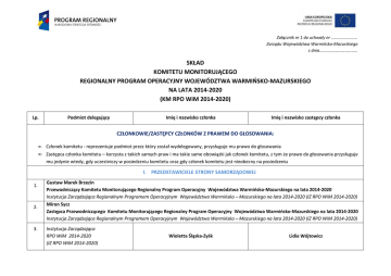 Załącznik nr 1 do uchwały nr ……………………. Zarządu Województwa Warmińsko-Mazurskiego z dnia……………………………… SKŁAD KOMITETU MONITORUJĄCEGO REGIONALNY PROGRAM OPERACYJNY WOJEWÓDZTWA WARMIŃSKO-MAZURSKIEGO NA LATA 2014-2020 (KM RPO WiM 2014-2020) Lp. Podmiot delegujący Imię i nazwisko członka Imię i nazwisko zastępcy członka CZŁONKOWIE/ZASTĘPCY CZŁONKÓW Z PRAWEM DO GŁOSOWANIA: • Członek komitetu - reprezentuje podmiot przez który został wydelegowany, przysługuje mu prawo do głosowania • Zastępca członka komitetu – korzysta z takich samych praw i ma takie same obowiązki jak członek komitetu, z tym że prawo do głosowania przysługuje mu jedynie wtedy, gdy uczestniczy w posiedzeniu komitetu oraz gdy członek komitetu jest nieobecny na posiedzeniu I. PRZEDSTAWICIELE STRONY SAMORZĄDOWEJ 1. 2. 3. Gustaw Marek Brzezin Przewodniczący Komitetu Monitorującego Regionalny Program Operacyjny Województwa Warmińsko-Mazurskiego na lata 2014-2020 Instytucja Zarządzająca Regionalnym Programem Operacyjnym Województwa Warmińsko – Mazurskiego na lata 2014-2020 (IZ RPO WiM 2014-2020) Miron Sycz Zastępca Przewodniczącego Komitetu Monitorującego Regionalny Program Operacyjny Województwa Warmińsko-Mazurskiego na lata 2014-2020 Instytucja Zarządzająca Regionalnym Programem Operacyjnym Województwa Warmińsko – Mazurskiego na lata 2014-2020 (IZ RPO WiM 2014-2020) Instytucja Zarządzająca RPO WiM 2014-2020 (IZ RPO WiM 2014-2020) Wioletta Śląska-Zyśk Lidia Wójtowicz 4. Konwent Powiatów Województwa Warmińsko-Mazurskiego 5. Unia Miasteczek Polskich 6. Warmińsko-Mazurska Agencja Rozwoju Regionalnego S.A. w Olsztynie 7. 8. Marian Janicki Andrzej Ciołek Wacław Olszewski Aneta Milczarek Włodzimierz Szelążek Joanna Kruszewska-Papuszka Wojewódzki Fundusz Ochrony Środowiska i Gospodarki Wodnej w Olsztynie (Instytucja Pośrednicząca RPO WiM 2014-2020) Adam Krzyśków Marianna Zaborowska Wojewódzki Urząd Pracy w Olsztynie (Instytucja Pośrednicząca RPO WiM 2014-2020) Zdzisław Szczepkowski Tomasz Szarek Związek Gmin Warmińsko-Mazurskich Krzysztof Harmaciński Sebastian Cichocki Jacek Szydło Paweł Cieśliński Związek Miast Polskich Piotr Grzymowicz Kamil Buksa Związek Powiatów Polskich Andrzej Nowicki Wacław Strażewicz 9. 10. Związek Gmin Wiejskich Rzeczypospolitej Polskiej 11. 12. 2 13. Związek Województw Rzeczpospolitej Polskiej 14. Piotr Żuchowski Julian Osiecki Związek ZIT w ramach Elbląskiego Obszaru Funkcjonalnego Witold Wróblewski Maciej Romanowski 15. Związek ZIT w ramach Miejskiego Obszaru Funkcjonalnego Ełku Tomasz Andrukiewicz Renata Samełko 16. Związek ZIT w ramach Miejskiego Obszaru Funkcjonalnego Olsztyna (Instytucja Pośrednicząca RPO WiM 2014-2020) Justyna Sarna-Pezowicz Agnieszka Horyd II. PRZEDSTAWICIELE STRONY RZĄDOWEJ 17. Minister właściwy do spraw cyfryzacji Joanna Wieczorek Aneta Napiórkowska 18. Minister właściwy do spraw edukacji Karol Bieniek - 19. Minister właściwy do spraw energii Jacek Marek Piotr Czopek 20. Minister właściwy do spraw finansów publicznych Piotr Wójcicki Adam Rędziński 21. Minister właściwy do spraw pracy i polityki społecznej Renata Szczęch Monika Stolarzewicz 22. Minister właściwy do spraw rolnictwa i rozwoju wsi Michał Jankowski Marcin Zieliński 23. Minister właściwy do spraw rozwoju regionalnego Michał Ptaszyński Marcin Piłka 3 (Instytucja do spraw koordynacji strategicznej) 24. Minister właściwy do spraw rozwoju regionalnego Łukasz Mikulec Julia Falborska (Instytucja Zarządzająca Programem Operacyjnym Polska Wschodnia 20142020) Aneta Sałata Tomasz Dec 26. Minister właściwy do spraw środowiska Agnieszka Sosnowska Maria Sokoll 27. Minister właściwy do spraw zdrowia Jarosław Izdebski Rafał Wójcik 28. Pełnomocnik Rządu ds. Osób Niepełnosprawnych Anna Kuna Izabela Kaczyńska-Wasiak 29. Pełnomocnik Wojewody WarmińskoMazurskiego ds. Mniejszości Narodowych i Etnicznych oraz Równego Traktowania Monika Szustowicz Urszula Jędrychowska (Instytucja do spraw koordynacji wdrażania EFS) 25. Minister właściwy do spraw rozwoju regionalnego III. PRZEDSTAWICIELE PARTNERÓW SPOZA ADMINISTRACJI: A. PRZEDSTAWICIELE ORGANIZACJI ZWIĄZKOWYCH 30. Ogólnopolskie Porozumienie Związków Zawodowych (OPZZ) Województwa Jarosław Szunejko Irena Żychowicz 4 Warmińsko-Mazurskiego 31. 32. 33. Region Warmińsko-Mazurski Niezależnego Samorządowego Związku Zawodowego (NSZZ) "Solidarność" Jarosław Borkowski Józef Dziki Region Elbląg Niezależnego Samorządowego Związku Zawodowego (NSZZ) "Solidarność" Marek Cichoń Grzegorz Adamowicz Warmińsko-Mazurskie Forum Związków Zawodowych Grzegorz Paciulan Elżbieta Butkiewicz B. PRZEDSTAWICIELE ORGANIZACJI PRACODAWCÓW 34. Cech Rzemiosł Różnych w Elblągu 35. Lech Plewiński Leszek Kimsa Loża Olsztyńska Business Centre Club Wiesław Łubiński Henryk Biały 36. Pracodawcy Rzeczypospolitej Polskiej Bożena Zyskowska Dariusz Kapusta 37. Warmińsko-Mazurska Izba Rzemiosła i Przedsiębiorczości Mieczysław Królicki Justyna Jeleniewicz Henryk Kamiński Waldemar Klocek Artur Dondzik Rafał Laskowski 38. 39. Warmińsko-Mazurski Klub Biznesu Warmińsko-Mazurski Związek Pracodawców Prywatnych C. PRZEDSTAWICIELE IZB GOSPODARCZYCH 40. Polska Izba Turystyki Andrzej Kindler Wojciech Śmieszek 5 Oddział Warmińsko-Mazurski D. PRZEDSTAWICIELE ORGANIZACJI ŚRODOWISKA NAUKOWEGO 41. Konferencja Rektorów Akademickich Szkół Polskich prof. Mirosław Gornowicz Eliza Popławska -Jodko E. PRZEDSTAWICIELE INSTYTUCJI OTOCZENIA BIZNESU 42. Warmińsko-Mazurski Fundusz „Poręczenia Kredytowe” Sp. z o.o. (instytucja otoczenia biznesu wskazana przez Radę Regionalnego Systemu Usług - Sieć InnoWaMa Sławomir Gutkowski Barbara Bąkowska F. PRZEDSTAWICIELE ORGANIZACJI POZARZADOWYCH 43. 44. 45. Rada Działalności Pożytku Publicznego Województwa Warmińsko-Mazurskiego (przedstawiciel organizacji 