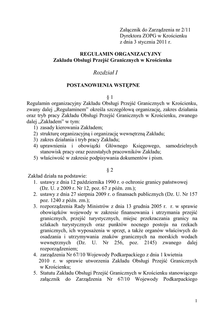 Załącznik do Zarządzenia nr 2/11 Dyrektora ZOPG w Krościenku z dnia 3 stycznia 2011 r. REGULAMIN ORGANIZACYJNY Zakładu Obsługi Przejść Granicznych w Krościenku Rozdział I POSTANOWIENIA WSTĘPNE §1 Regulamin organizacyjny Zakładu Obsługi Przejść Granicznych w Krościenku, zwany dalej „Regulaminem” określa szczegółową organizację, zakres działania oraz tryb pracy Zakładu Obsługi Przejść Granicznych w Krościenku, zwanego dalej „Zakładem” w tym: 1) zasady kierowania Zakładem; 2) strukturę organizacyjną i organizację wewnętrzną Zakładu; 3) zakres działania i tryb pracy Zakładu; 4) uprawnienia i obowiązki Głównego Księgowego, samodzielnych stanowisk pracy oraz pozostałych pracowników Zakładu; 5) właściwość w zakresie podpisywania dokumentów i pism. §2 Zakład działa na podstawie: 1. ustawy z dnia 12 października 1990 r. o ochronie granicy państwowej (Dz. U. z 2009 r. Nr 12, poz. 67 z późn. zm.); 2. ustawy z dnia 27 sierpnia 2009 r. o finansach publicznych (Dz. U. Nr 157 poz. 1240 z późn. zm.); 3. rozporządzenia Rady Ministrów z dnia 13 grudnia 2005 r. r. w sprawie obowiązków wojewody w zakresie finansowania i utrzymania przejść granicznych, przejść turystycznych, miejsc przekraczania granicy na szlakach turystycznych oraz punktów nocnego postoju na rzekach granicznych, ich wyposażenia w sprzęt, a także organów właściwych do osadzania i utrzymywania znaków granicznych na morskich wodach wewnętrznych (Dz. U. Nr 256, poz. 2145) zwanego dalej rozporządzeniem; 4. zarządzenia Nr 67/10 Wojewody Podkarpackiego z dnia 1 kwietnia 2010 r. w sprawie utworzenia Zakładu Obsługi Przejść Granicznych w Krościenku; 5. Statutu Zakładu Obsługi Przejść Granicznych w Krościenku stanowiącego załącznik do Zarządzenia Nr 67/10 Wojewody Podkarpackiego 1 z dnia 1 kwietnia 2010 r. w sprawie utworzenia Zakładu Obsługi Przejść Granicznych w Krościenku; 6. niniejszego regulaminu. 1. 2. 3. 4. 5. 6. 7. §3 Zakład jest jednostką organizacyjną powołaną do wykonywania zadań Wojewody Podkarpackiego w zakresie obsługi drogowych, kolejowych i lotniczego przejścia granicznego, przejść granicznych przeznaczonych wyłącznie dla małego ruchu granicznego, przejść turystycznych, przejść granicznych na szlakach turystycznych przecinających granicę państwową, miejsc przekraczania granicy na szlakach turystycznych, zwanych dalej „przejściami granicznymi”, na terenie powiatów: bieszczadzkiego i rzeszowskiego. Zakład jest prowadzony w formie jednostki budżetowej. Podstawę gospodarki finansowej Zakładu stanowi roczny plan finansowy zatwierdzony przez Dyrektora Generalnego Urzędu. Plan finansowy obejmuje przychody, w tym dotacje z budżetu, koszty i inne obciążenia, rachunek zysków i strat, stan środków obrotowych, stan należności i zobowiązań na początek i koniec okresu oraz rozliczenia z budżetem. Zakład pokrywa koszty swojej działalności z uzyskiwanych przychodów własnych, do których nie zalicza się dochodów z najmu i dzierżawy oraz innych umów o podobnym charakterze dotyczących składników majątkowych Skarbu Państwa. Zakład dokonuje sprzedaży usług na rzecz Urzędu według kosztów własnych rozliczanych fakturami w okresach miesięcznych. Usługi wymienione w § 11 pkt. 2-9 są świadczone nieodpłatnie i stanowią koszt własny Zakładu oraz podstawę obciążenia Urzędu. §4 Nadzór i kontrolę w zakresie gospodarki finansowej i materiałowej sprawuje Wydział Finansów i Budżetu Urzędu. 2 Rozdział II ZASADY KIEROWANIA ZAKŁADEM §5 Zakładem kieruje i reprezentuje go na zewnątrz Dyrektor Zakładu, z którym stosunek pracy nawiązuje i rozwiązuje Wojewoda Podkarpacki. §6 Stosunek pracy z Głównym Księgowym oraz pozostałymi pracownikami Zakładu nawiązuje i rozwiązuje Dyrektor Zakładu. 1. 2. 3. 4. §7 Dyrektor Zakładu realizuje zadania przy pomocy Głównego Księgowego. Do osobistej aprobaty Dyrektor zastrzega się: - korespondencję, informacje, sprawozdania i inne materiały wychodzące na zewnątrz, - dokumenty obrotu pieniężnego, materiałowego i towarowego oraz dokumenty o charakterze rozliczeniowym, - sprawy kadrowe Zakładu, - umowy i decyzje wywołujące skutki finansowe. W czasie nieobecności Dyrektora Zakładu zastępuje go Główny Księgowy w zakresie: - sprawowania bezpośredniego nadzoru nad funkcjonowaniem i organizacją pracy Zakładu, - współpracy z Urzędem przy realizacji zadań statutowych. W czasie nieobecności Dyrektora Zakładu i Głównego Księgowego zastępstwo w zakresie bezpośredniego nadzoru nad funkcjonowaniem i organizacją pracy Zakładu pełni pisemnie upoważniona przez Dyrektora Zakładu osoba. §8 1. Dyrektor może upoważnić pracownika do prowadzenia w jego imieniu, niektórych spraw z zakresu swoich kompetencji. 2. Szczegółowy zakres zadań, obowiązków, uprawnień i odpowiedzialności pracowników ustalony jest przez Dyrektora Zakładu w indywidualnych zakresach czynności. 3 Rozdział III STRUKTURA ORGANIZACYJNA ZAKŁADU §9 W skład Zakładu wchodzą następujące komórki organizacyjne i samodzielne stanowiska pracy: 1) Dyrektor Zakładu, 2) Główny Księgowy 3) Samodzielne stanowisko ds. kadrowo-administracyjnych, 4) Referent ds. majątkowo-księgowych, 5) Referent ds. gospodarczo-technicznych, 6) Dział Gospodarczo-Techniczny w Krościenku. § 10 1. Zakład w znakowaniu prowadzonych spraw posługuje się symbolem ZOPG. 2. Schemat organizacyjny Zakładu stanowi załącznik do niniejszego Regulaminu. Rozdział IV ZAKRES DZIAŁANIA I TRYB PRACY ZAKŁADU § 11 1. Do zakresu działania Zakładu należy w szczególności: 1) administrowanie obiektami przejść granicznych; 2) udostępnianie polskim organom prowadzącym kontrolę, zwanym dalej „organami kontroli”, urządzeń i sprzętu technicznego niezbędnego do przeprowadzania sprawnej i skutecznej kontroli; 3) udostępnianie organom kontroli pomieszczeń, gara