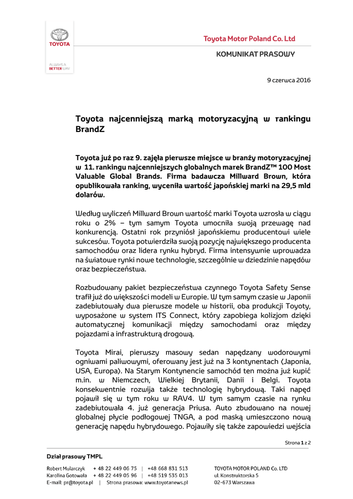 9 czerwca 2016 Toyota najcenniejszą marką motoryzacyjną w rankingu BrandZ Toyota już po raz 9. zajęła pierwsze miejsce w branży motoryzacyjnej w 11. rankingu najcenniejszych globalnych marek BrandZ™ 100 Most Valuable Global Brands. Firma badawcza Millward Brown, która opublikowała ranking, wyceniła wartość japońskiej marki na 29,5 mld dolarów. Według wyliczeń Millward Brown wartość marki Toyota wzrosła w ciągu roku o 2% – tym samym Toyota umocniła swoją przewagę nad konkurencją. Ostatni rok przyniósł japońskiemu producentowi wiele sukcesów. Toyota potwierdziła swoją pozycję największego producenta samochodów oraz lidera rynku hybryd. Firma intensywnie wprowadza na światowe rynki nowe technologie, szczególnie w dziedzinie napędów oraz bezpieczeństwa. Rozbudowany pakiet bezpieczeństwa czynnego Toyota Safety Sense trafił już do większości modeli w Europie. W tym samym czasie w Japonii zadebiutowały dwa pierwsze modele w historii, oba produkcji Toyoty, wyposażone w system ITS Connect, który zapobiega kolizjom dzięki automatycznej komunikacji między samochodami oraz między pojazdami a infrastrukturą drogową. Toyota Mirai, pierwszy masowy sedan napędzany wodorowymi ogniwami paliwowymi, oferowany jest już na 3 kontynentach (Japonia, USA, Europa). Na Starym Kontynencie samochód ten można już kupić m.in. w Niemczech, Wielkiej Brytanii, Danii i Belgi. Toyota konsekwentnie rozwija także technologię hybrydową. Taki napęd pojawił się w tym roku w RAV4. W tym samym czasie na rynku zadebiutowała 4. już generacja Priusa. Auto zbudowano na nowej globalnej płycie podłogowej TNGA, a pod maską umieszczono nową generację napędu hybrydowego. Pojawiły się także zapowiedzi wejścia Strona 1 z 2 na rynek zupełnie nowego hybrydowego crossovera C-HR oraz drugiej generacji Priusa Plug-in Hybrid. Najcenniejsze marki motoryzacyjne w rankingu BrandZ 2016 Pozycja na liście TOP100 Marka Wartość w mld USD 28 Toyota 29,501 33 BMW 26,837 39 Mercedes-Benz 22,708 74 Honda 13,195 75 Ford 13,084 92 Nissan 11,479 Ranking BrandZ™ Top 100 Most Valuable Global Brands firmy Millward Brown 2016 to jedyne badanie mierzące postrzeganie marki na podstawie wywiadów z około 3 milionami konsumentów w 50 krajach na temat 100 000 marek. Według autorów raportu postrzeganie marki przez konsumentów ma kluczowe znaczenie w ocenie jej wartości. Ich zdaniem na budowanie marki składają się przede wszystkim: sposób funkcjonowania firmy, jakość dostarczanego produktu, przejrzystość pozycjonowania na rynku i silne przywództwo. Link do pełnego raportu BrandZ™ Top 100 Most Valuable Global Brands 2016: 2016 BrandZ Top100 Report Strona 2 z 2