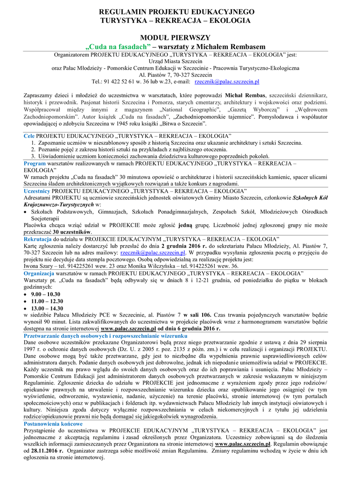 REGULAMIN PROJEKTU EDUKACYJNEGO TURYSTYKA – REKREACJA – EKOLOGIA MODUŁ PIERWSZY „Cuda na fasadach” – warsztaty z Michałem Rembasem Organizatorem PROJEKTU EDUKACYJNEGO „TURYSTYKA – REKREACJA – EKOLOGIA” jest: Urząd Miasta Szczecin oraz Pałac Młodzieży - Pomorskie Centrum Edukacji w Szczecinie - Pracownia Turystyczno-Ekologiczna Al. Piastów 7, 70-327 Szczecin Tel.: 91 422 52 61 w. 36 lub w.23, e-mail: [email protected] Zapraszamy dzieci i młodzież do uczestnictwa w warsztatach, które poprowadzi Michał Rembas, szczeciński dziennikarz, historyk i przewodnik. Pasjonat historii Szczecina i Pomorza, starych cmentarzy, architektury i wojskowości oraz podziemi. Współpracował między innymi z magazynem „National Geographic”, „Gazetą Wyborczą” i „Wędrowcem Zachodniopomorskim”. Autor książek „Cuda na fasadach”, „Zachodniopomorskie tajemnice”. Pomysłodawca i współautor opowiadającej o zdobyciu Szczecina w 1945 roku książki „Bitwa o Szczecin”. Cele PROJEKTU EDUKACYJNEGO „TURYSTYKA – REKREACJA – EKOLOGIA” 1. Zapoznanie uczniów w nieszablonowy sposób z historią Szczecina oraz ukazanie architektury i sztuki Szczecina. 2. Poznanie pojęć z zakresu historii sztuki na przykładach z najbliższego otoczenia. 3. Uświadomienie uczniom konieczności zachowania dziedzictwa kulturowego poprzednich pokoleń. Program warsztatów realizowanych w ramach PROJEKTU EDUKACYJNEGO „TURYSTYKA – REKREACJA – EKOLOGIA” W ramach projektu „Cuda na fasadach” 30 minutowa opowieść o architekturze i historii szczecińskich kamienic, spacer ulicami Szczecina śladem architektonicznych wyjątkowych rozwiązań a także konkurs z nagrodami. Uczestnicy PROJEKTU EDUKACYJNEGO „TURYSTYKA – REKREACJA – EKOLOGIA” Adresatami PROJEKTU są uczniowie szczecińskich jednostek oświatowych Gminy Miasto Szczecin, członkowie Szkolnych Kół Krajoznawczo-Turystycznych w: Szkołach Podstawowych, Gimnazjach, Szkołach Ponadgimnazjalnych, Zespołach Szkół, Młodzieżowych Ośrodkach Socjoterapii Placówka chcąca wziąć udział w PROJEKCIE może zgłosić jedną grupę. Liczebność jednej zgłoszonej grupy nie może przekraczać 30 uczestników. Rekrutacja do udziału w PROJEKCIE EDUKACYJNYM „TURYSTYKA – REKREACJA – EKOLOGIA” Kartę zgłoszenia należy dostarczyć lub przesłać do dnia 2 grudnia 2016 r. do sekretariatu Pałacu Młodzieży, Al. Piastów 7, 70-327 Szczecin lub na adres mailowy: [email protected]. W przypadku wysyłania zgłoszenia pocztą o przyjęciu do projektu nie decyduje data stempla pocztowego. Osobą odpowiedzialną za realizację projektu jest: Iwona Szary – tel. 914225261 wew. 23 oraz Monika Wilczyńska – tel. 914225261 wew. 36. Organizacja warsztatów w ramach PROJEKTU EDUKACYJNEGO „TURYSTYKA – REKREACJA – EKOLOGIA” Warsztaty pt. „Cuda na fasadach” będą odbywały się w dniach 8 i 12-21 grudnia, od poniedziałku do piątku w blokach godzinnych: 9.00 – 10.30 11.00 – 12.30 13.00 – 14.30 w siedzibie Pałacu Młodzieży PCE w Szczecinie, al. Piastów 7 w sali 106. Czas trwania pojedynczych warsztatów będzie wynosił 90 minut. Lista zakwalifikowanych do uczestnictwa w projekcie placówek wraz z harmonogramem warsztatów będzie dostępna na stronie internetowej www.palac.szczecin.pl od dnia 6 grudnia 2016 r. Przetwarzanie danych osobowych i rozpowszechnianie wizerunku Dane osobowe uczestników przekazane Organizatorowi będą przez niego przetwarzanie zgodnie z ustawą z dnia 29 sierpnia 1997 r. o ochronie danych osobowych (Dz. U. z 2005 r. poz. 2135 z późn. zm.) i w celu realizacji i organizacji PROJEKTU. Dane osobowe mogą być także przetwarzane, gdy jest to niezbędne dla wypełnienia prawnie usprawiedliwionych celów administratora danych. Podanie danych osobowych jest dobrowolne, jednak ich niepodanie uniemożliwia udział w PROJEKCIE. Każdy uczestnik ma prawo wglądu do swoich danych osobowych oraz do ich poprawiania i usunięcia. Pałac Młodzieży – Pomorskie Centrum Edukacji jest administratorem danych osobowych przetwarzanych w zakresie wskazanym w niniejszym Regulaminie. Zgłoszenie dziecka do udziału w PROJEKCIE jest jednoznaczne z wyrażeniem zgody przez jego rodziców/ opiekunów prawnych na utrwalenie i rozpowszechnianie wizerunku dziecka oraz opublikowanie jego osiągnięć (w tym wyświetlenie, odtworzenie, wystawienie, nadanie, użyczenie) na terenie placówki, stronie internetowej (w tym portalach społecznościowych) oraz w publikacjach i folderach itp. wydawnictwach Pałacu Młodzieży lub innych instytucji oświatowych i kultury. Niniejsza zgoda dotyczy wyłącznie rozpowszechniania w celach niekomercyjnych i z tytułu jej udzielenia rodzice/opiekunowie prawni nie będą domagać się jakiegokolwiek wynagrodzenia. Postanowienia końcowe Przystąpienie do uczestnictwa w PROJEKCIE EDUKACYJNYM „TURYSTYKA – REKREACJA – EKOLOGIA” jest jednoznaczne z akceptacją regulaminu i zasad określonych przez Organizatora. Uczestnicy zobowiązani są do śledzenia wszelkich informacji zamieszczanych przez Organizatora na stronie internetowej www.palac.szczecin.pl. Regulamin obowiązuje od 28.11.2016 r. Organizator zastrzega sobie możliwość zmian Regulaminu. Zmiany regulaminu wchodzą w życie w dniu ich ogłoszenia na stronie internetowej. KARTA ZGŁOSZENIA PROJEKT EDUKACYJNY TURYSTYKA – REKREACJA – EKOLOGIA MODUŁ PIERWSZY „Cuda na fasadach” – warsztaty z Michałem Rembasem 1. Nazwa Szkoły/Placówki ………………………………………………………………………………………………………… 2. Dane teleadresowe Szkoły/Placówki Adres …………………………………………………………………………………………………………………………….. Numer telefonu ………………………………………………………………………………………………………………….. Adres em