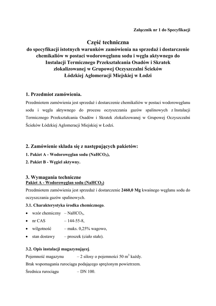 Załącznik nr 1 do Specyfikacji Część techniczna do specyfikacji istotnych warunków zamówienia na sprzedaż i dostarczenie chemikaliów w postaci wodorowęglanu sodu i węgla aktywnego do Instalacji Termicznego Przekształcania Osadów i Skratek zlokalizowanej w Grupowej Oczyszczalni Ścieków Łódzkiej Aglomeracji Miejskiej w Łodzi 1. Przedmiot zamówienia. Przedmiotem zamówienia jest sprzedaż i dostarczenie chemikaliów w postaci wodorowęglanu sodu i węgla aktywnego do procesu oczyszczania gazów spalinowych z Instalacji Termicznego Przekształcania Osadów i Skratek zlokalizowanej w Grupowej Oczyszczalni Ścieków Łódzkiej Aglomeracji Miejskiej w Łodzi. 2. Zamówienie składa się z następujących pakietów: 1. Pakiet A - Wodorowęglan sodu (NaHCO3), 2. Pakiet B - Węgiel aktywny. 3. Wymagania techniczne Pakiet A - Wodorowęglan sodu (NaHCO3) Przedmiotem zamówienia jest sprzedaż i dostarczenie 2460,0 Mg kwaśnego węglanu sodu do oczyszczania gazów spalinowych. 3.1. Charakterystyka środka chemicznego. • wzór chemiczny – NaHCO3, • nr CAS – 144-55-8, • wilgotność – maks. 0,25% wagowo, • stan dostawy – proszek (ciało stałe). 3.2. Opis instalacji magazynującej. Pojemność magazynu – 2 silosy o pojemności 50 m3 każdy. Brak wspomagania rurociągu podającego sprężonym powietrzem. Średnica rurociągu – DN 100. Przyłącze – KE-5 – Storz. Lokalizacja przyłącza – 1500 mm n.p.t. Długość rurociągu – 7 m w poziomie, 15 m w pionie, 4 kolana 90° i zawór ręczny. 3.3. Dostawa. Załadunek silosów (rozładunek autocysterny) winien odbywać się sprężarką autocysterny Wykonawcy. Wykonawca może zapoznać się z instalacją magazynową wodorowęglanu sodu. 4. Wymagania techniczne Pakiet B - Węgiel aktywny Przedmiotem zamówienia jest sprzedaż i dostarczenie 50,0 Mg węgla aktywnego do oczyszczania gazów spalinowych w szczególności do usuwania dioksyn, furanów, rtęci w celu zapewnienia zgodności parametrów gazów odlotowych z obowiązującymi przepisami. 4.1. Charakterystyka produktu. • przeciętna średnica d50 – 15 ÷ 35 μm, • liczba jodowa – min.1100 mg/g, • wilgotność po zapakowaniu – maks. 10 % wagowo, • powierzchnia właściwa BET – min. 1150 m2/g, • zawartość popiołu – maks. 4 %, 4.2. Opis instalacji magazynującej. Pojemność magazynu – silos o pojemności 10 m3. Brak wspomagania rurociągu sprężonym powietrzem. Średnica rurociągu – DN100, Przyłącze – KE-5 – Storz 100. Lokalizacja przyłącza – 1500 mm n.p.t. Długość rurociągu – 7 m w poziomie, 11 m w pionie, kolana 90° i zawór ręczny. 4.3. Dostawa. Załadunek silosów (rozładunek autocysterny) winien odbywać się własną sprężarką autocysterny. Wykonawca może zapoznać się z instalacją magazynową węgla aktywnego. 5. Ogólne warunki dostaw. 5.1. Miejsce dostawy. Zamówione chemikalia dostarczane będą do Grupowej Oczyszczalni Ścieków Łódzkiej Aglomeracji Miejskiej w Łodzi przy ul. Sanitariuszek 70/72. Dostawy podlegające ważeniu dostarczane będą przez bramę towarową od strony drogi Okołowickiej. 5.2. Sposób dostawy. Dostawy odbywać się będą transportem Wykonawcy. Samochód powinien być wyposażony w urządzenia zapewniające samodzielny rozładunek. 5.3. Odbiór dostaw. Przyjęcie dostawy odbędzie się na podstawie listu przewozowego CMR oraz karty charakterystyki produktu. Chemikalia dostarczane w cysternach będą ważone na wadze Zamawiającego zlokalizowanej przy bramie towarowej od strony ul. Okołowickiej. W celu kontroli ilości dostawy, przed rozładunkiem pojazd będzie ważony na wadze towarowej GOŚ zlokalizowanej przy wjeździe do portierni towarowej od strony ul. Okołowickiej. Waga posiada następujące parametry techniczne: • wymiar płyty wagi – 3 x 12 m, • maksymalny rozstaw zewnętrznych osi pojazdu – 11 m, • waga całkowita pojazdu – do 50 Mg. Zamawiającemu przysługuje prawo kontroli jakości i ilości dostaw. 5.4. Dokumenty określające dostarczane chemikalia. − Karta charakterystyki produktu wykonana zgodnie z obowiązującymi przepisami, tj: • Ustawą z dnia 25.02.2011 r. o substancjach chemicznych i ich mieszaninach (Dz.U. Nr 63, poz. 322), • Rozporządzeniem Ministra Zdrowia z dnia 02.09.2003 r. w sprawie kryteriów i sposobu klasyfikacji substancji i preparatów chemicznych (Dz.U. Nr 171, poz. 1666 z późniejszymi zmianami), • Rozporządzeniem (WE) Nr 1907/2006 Parlamentu Europejskiego i Rady z dnia 18.12.2006 r. w sprawie rejestracji, oceny, udzielania zezwoleń i stosowanych ograniczeń w zakresie chemikaliów (REACH) i utworzenia Europejskiej Agencji Chemikaliów.
