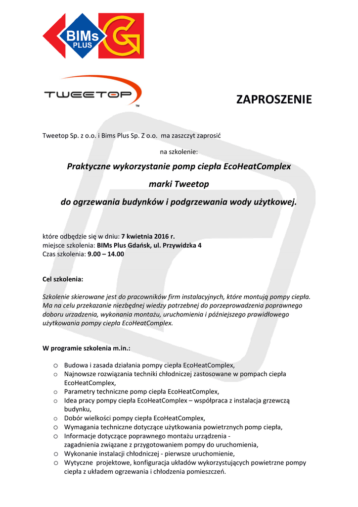 ZAPROSZENIE Tweetop Sp. z o.o. i Bims Plus Sp. Z o.o. ma zaszczyt zaprosić na szkolenie: Praktyczne wykorzystanie pomp ciepła EcoHeatComplex marki Tweetop do ogrzewania budynków i podgrzewania wody użytkowej. które odbędzie się w dniu: 7 kwietnia 2016 r. miejsce szkolenia: BIMs Plus Gdańsk, ul. Przywidzka 4 Czas szkolenia: 9.00 – 14.00 Cel szkolenia: Szkolenie skierowane jest do pracowników firm instalacyjnych, które montują pompy ciepła. Ma na celu przekazanie niezbędnej wiedzy potrzebnej do porzeprowadzenia poprawnego doboru urzadzenia, wykonania montażu, uruchomienia i późniejszego prawidłowego użytkowania pompy ciepła EcoHeatComplex. W programie szkolenia m.in.: o Budowa i zasada działania pompy ciepła EcoHeatComplex, o Najnowsze rozwiązania techniki chłodniczej zastosowane w pompach ciepła EcoHeatComplex, o Parametry techniczne pomp ciepła EcoHeatComplex, o Idea pracy pompy ciepła EcoHeatComplex – współpraca z instalacja grzewczą budynku, o Dobór wielkości pompy ciepła EcoHeatComplex, o Wymagania techniczne dotyczące użytkowania powietrznych pomp ciepła, o Informacje dotyczące poprawnego montażu urządzenia zagadnienia związane z przygotowaniem pompy do uruchomienia, o Wykonanie instalacji chłodniczej - pierwsze uruchomienie, o Wytyczne projektowe, konfiguracja układów wykorzystujących powietrzne pompy ciepła z układem ogrzewania i chłodzenia pomieszczeń.