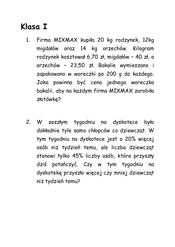 Klasa I 1. Firma MIXMAX kupiła 20 kg rodzynek, 12kg migdałów oraz 14 kg orzechów. Kilogram rodzynek kosztował 6,70 zł, migdałów – 40 zł, a orzechów – 23,50 zł. Bakalie wymieszano i zapakowano w woreczki po 200 g do każdego. Jaka powinna być cena jednego woreczka bakalii, aby na każdym firma MIXMAX zarobiła złotówkę? 2. W zeszłym tygodniu na dyskotece było dokładnie tyle samo chłopców co dziewcząt. W tym tygodniu na dyskotece jest o 20% więcej osób niż tydzień temu, ale liczba dziewcząt stanowi tylko 45% liczby osób, które przyszły dziś potańczyć. Czy w tym tygodniu na dyskotekę przyszło więcej czy mniej dziewcząt niż tydzień temu? Klasa II 1. Solankę dziesięcioprocentową zmieszano z solanką dwuprocentową i otrzymano 60 kg roztworu. Gdyby solanki dziesięcioprocentowej wzięto o 20% więcej, a dwuprocentowej o 20% mniej, to otrzymano ośmioprocentową. Jakie by solankę jest stężenie otrzymanej solanki? 2. Pewien chłopiec zapytany o swój wiek, odpowiedział: - Dwadzieścia lat temu moja babcia była dwa razy starsza od mojej mamy. Dziś moja babcia ma dwa razy tyle lat, ile miała moja mama w dniu, gdy ja się urodziłem. Ile lat ma ten mądrala? Klasa III 1. Fabryka produkuje zielone i czerwone szelki. Zielone są o 50% tańsze niż czerwone i stanowią 10% liczby produkowanych szelek. Gdyby fabryka ta produkowała miesięcznie o 100 szelek mniej, ale wszystkie czerwone, to przychód ze sprzedaży by się nie zmienił. Ile szelek miesięcznie produkuje ta fabryka? 2. Jacek obliczył, że w ciągu tygodnia, chodząc codziennie do szkoły i z powrotem, pokonał odległość 16,4 km. Oblicz, ile razy Jacek wybierał drogę przez las, jeśli z domu do szkoły przez las jest 1,5 km, a z domu do szkoły idąc koło sklepu jest 2,2 km.