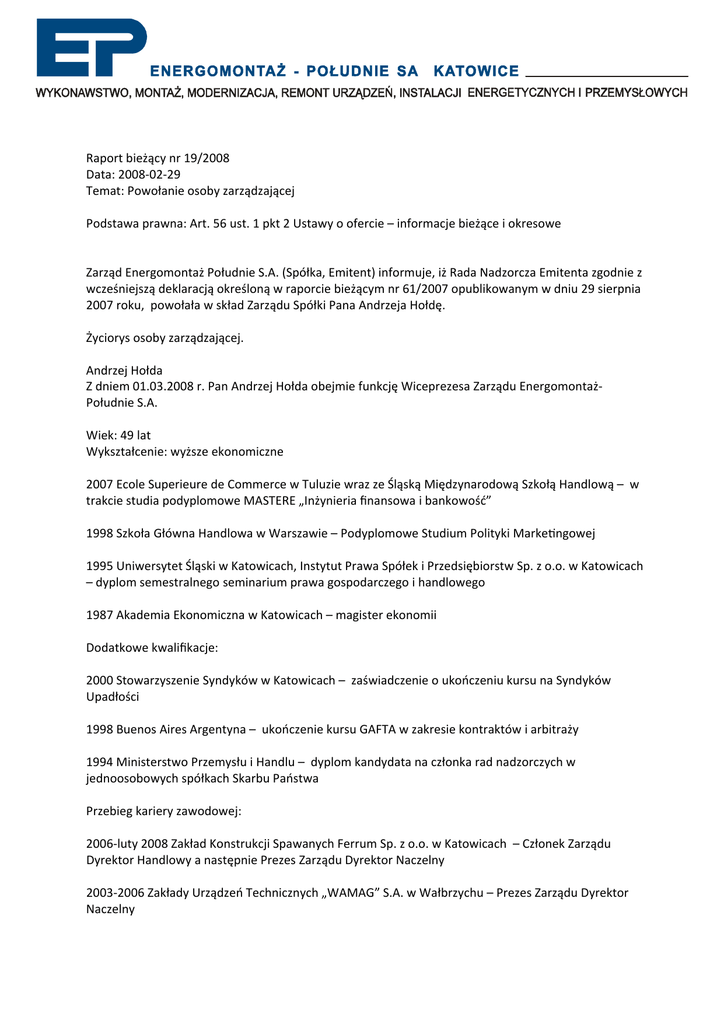 Raport bieżący nr 19/2008 Data: 2008-02-29 Temat: Powołanie osoby zarządzającej Podstawa prawna: Art. 56 ust. 1 pkt 2 Ustawy o ofercie – informacje bieżące i okresowe Zarząd Energomontaż Południe S.A. (Spółka, Emitent) informuje, iż Rada Nadzorcza Emitenta zgodnie z wcześniejszą deklaracją określoną w raporcie bieżącym nr 61/2007 opublikowanym w dniu 29 sierpnia 2007 roku, powołała w skład Zarządu Spółki Pana Andrzeja Hołdę. Życiorys osoby zarządzającej. Andrzej Hołda Z dniem 01.03.2008 r. Pan Andrzej Hołda obejmie funkcję Wiceprezesa Zarządu EnergomontażPołudnie S.A. Wiek: 49 lat Wykształcenie: wyższe ekonomiczne 2007 Ecole Superieure de Commerce w Tuluzie wraz ze Śląską Międzynarodową Szkołą Handlową – w trakcie studia podyplomowe MASTERE „Inżynieria finansowa i bankowość” 1998 Szkoła Główna Handlowa w Warszawie – Podyplomowe Studium Polityki Marketingowej 1995 Uniwersytet Śląski w Katowicach, Instytut Prawa Spółek i Przedsiębiorstw Sp. z o.o. w Katowicach – dyplom semestralnego seminarium prawa gospodarczego i handlowego 1987 Akademia Ekonomiczna w Katowicach – magister ekonomii Dodatkowe kwalifikacje: 2000 Stowarzyszenie Syndyków w Katowicach – zaświadczenie o ukończeniu kursu na Syndyków Upadłości 1998 Buenos Aires Argentyna – ukończenie kursu GAFTA w zakresie kontraktów i arbitraży 1994 Ministerstwo Przemysłu i Handlu – dyplom kandydata na członka rad nadzorczych w jednoosobowych spółkach Skarbu Państwa Przebieg kariery zawodowej: 2006-luty 2008 Zakład Konstrukcji Spawanych Ferrum Sp. z o.o. w Katowicach – Członek Zarządu Dyrektor Handlowy a następnie Prezes Zarządu Dyrektor Naczelny 2003-2006 Zakłady Urządzeń Technicznych „WAMAG” S.A. w Wałbrzychu – Prezes Zarządu Dyrektor Naczelny 2000/2001 Centrozap S.A. w Katowicach – Doradca Zarządu a następnie Dyrektor Biura Handlowego – Prokurent 1999 Przedsiębiorstwo Montażu Urządzeń Elektrycznych S.A. w Katowicach – Wiceprezes Zarządu 1998‐1999 Śląskie Zakłady Zbożowo‐Młynarskie S.A. w Zabrzu – Prezes Zarządu 1997‐1998 Śląskie Zakłady Zbożowo‐Młynarskie S.A. w Zabrzu – Członek Zarządu Dyrektor ds. Handlowych 1994 – 1997 Katowicki Holding Węglowy S.A. w Katowicach – Dyrektor Biura Zaopatrzenia i Gospodarki Materiałowej 1979 – 1994 Kopalnia Węgla Kamiennego „Kleofas” w Katowicach – stanowiska od pracownika fizycznego poprzez kierownika działu zaopatrzenia i gospodarki materiałowej aż po głównego specjalistę ds. zaopatrzenia Ww. osoba zarządzająca nie prowadzi działalności konkurencyjnej, nie uczestniczy w spółkach konkurencyjnych jako wspólnik spółki cywilnej, spółki osobowej lub jako członek organu konkurencyjnej spółki kapitałowej czy też innej konkurencyjnej osoby prawnej. Nie figuruje też w Rejestrze Dłużników Niewypłacalnych. PODPISY OSÓB REPREZENTUJĄCYCH SPÓŁKĘ Wojciech Nazarek Prezes Zarządu Tadeusz Torbus Członek Zarządu