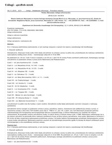 Usługi - 421816-2016 30/11/2016 S231 - - Usługi - Dodatkowe informacje - Procedura otwarta Polska-Warszawa: Usługi ochroniarskie 2016/S 231-421816 Miasto Stołeczne Warszawa w imieniu którego występuje Zarząd Mienia m.st. Warszawy, ul. Jana Kazimierza 62, Osoba do kontaktów: Magdalena Mycko, Jerzy Czerwiński, Warszawa 01-248, Polska. Tel.: +48 228368103. Faks: +48 228368061. E-mail: [email protected] (Suplement do Dziennika Urzędowego Unii Europejskiej, 12.11.2016, 2016/S 219-400160) Przedmiot zamówienia: CPV:79710000, 77314100, 90620000, 90610000 Usługi ochroniarskie Usługi w zakresie trawników Usługi odśnieżania Usługi sprzątania i zamiatania ulic Zamiast: III.2.1) Sytuacja podmiotowa wykonawców, w tym wymogi związane z wpisem do rejestru zawodowego lub handlowego: 5. Klauzule społeczne Oświadczenie, dotyczące liczby osób, które będą zatrudnione na umowę o pracę na pełny etat, przewidywane do realizacji zamówienia (sporządzony według wzoru druku – stanowiącego załącznik nr 8 do SIWZ. Na podstawie art. 29 ust. 4 pkt 4 (oraz w związku z art.36 ust. 2 pkt 9 lit d) ustawy Prawo zamówień publicznych, Zamawiający wymaga zatrudnienia na podstawie umowy o pracę przez Wykonawcę lub Podwykonawcę: Część I – (ul. Jana Kazimierza 62) – 3 osób; Część II – ( ul. Marywilska 44 dz. 14/144) – 3 osób; Część III – ( ul. Marywilska 44 dz. 14/25) – 3 osób; Część IV – (ul. Okopowa 78) – 3 osób; Część V – (ul. Sokratesa 15) – 3 osób; Część VI – (ul. Bitwy Warszawskiej 1920 r. nr 11) – 3 osób; Część VII – (ul. Prądzyńskiego) – 3 osób; Część VIII – (ul. Smolna 4) – 3 osób; Część IX – (O. W. Kobyłocha) – 3 osób; Część X – ( ul. Grochowska 272) – 3 osób; Część XI – ( ul. Targowa 56) – 4 osób; Część XII – (Bulwar im. Jana Karskiego) – 4 osób; Część XIII – (Pl. Żelaznej Bramy 1) – 3 osób; Część XIV – (ul. Wybrzeże Szczecińskie 1) – 3 osób; zatrudnionych na pełen etat dla każdej z części osobno. Zatrudnione osoby będą wykonywały czynności związane z realizacją zamówienia Zatrudnienie winno nastąpić na podstawie umowy o pracę, powołania, wyboru, mianowania lub spółdzielczej umowy o pracę, w rozumieniu ustawy z dnia 26.6.1974 Kodeks pracy (Dz.U. 1998 nr 21, poz. 94, z późn. zm.) lub właściwych przepisów państwa członkowskiego Unii Europejskiej lub Europejskiego Obszaru Gospodarczego, w którym Wykonawca ma siedzibę lub miejsce zamieszkania. W przypadku ustania zatrudnienia osoby, w trakcie okresu o którym mowa w pkt. 4 SIWZ, Wykonawca zobowiązuje się w jej miejsce zatrudnić na pozostały okres realizacji zamówienia licząc od dnia ustania zatrudnienia, inną osobę. Wykonawca w terminie 5 dni licząc od daty rozpoczęcia wykonywania przedmiotu umowy i na każde żądanie Zamawiającego przedstawi Zamawiającemu umowy o pracę osoby zatrudnionej. Wykonawca powinien uzyskać od zatrudnionego pracownika zgodę na dostęp do danych osobowych przez zamawiającego w celu prawidłowej realizacji umowy. Powinno być: III.2.1) Sytuacja podmiotowa wykonawców, w tym wymogi związane z wpisem do rejestru zawodowego lub handlowego: 5. Klauzule społeczne Oświadczenie, dotyczące liczby osób, które będą zatrudnione na umowę o pracę na pełny etat, przewidywane do realizacji zamówienia (sporządzony według wzoru druku – stanowiącego załącznik nr 8 do SIWZ. Na podstawie art. 29 ust. 4 pkt 4 (oraz w związku z art.36 ust. 2 pkt 9 lit d) ustawy Prawo zamówień publicznych, Zamawiający wymaga zatrudnienia na podstawie umowy o pracę przez Wykonawcę lub Podwykonawcę: Część I – (ul. Jana Kazimierza 62) – 3 osób; Część II – ( ul. Marywilska 44 dz. 14/144) – 3 osób; Część III – ( ul. Marywilska 44 dz. 14/25) – 3 osób; Część IV – (ul. Okopowa 78) – 3 osób; Część V – (ul. Sokratesa 15) – 3 osób; Część VI – (ul. Bitwy Warszawskiej 1920 r. nr 11) – 3 osób; Część VII – (ul. Prądzyńskiego) – 3 osób; Część VIII – (ul. Smolna 4) – 3 osób; Część IX – (O. W. Kobyłocha) – 3 osób; Część X – ( ul. Grochowska 272) – 3 osób; Część XI – ( ul. Targowa 56) – 4 osób; Część XII – (Bulwar im. Jana Karskiego) – 4 osób; Część XIII – (Pl. Żelaznej Bramy 1) – 6 osób; Część XIV – (ul. Wybrzeże Szczecińskie 1) – 6 osób; zatrudnionych na pełen etat dla każdej z części osobno. Zatrudnione osoby będą wykonywały czynności związane z realizacją zamówienia Zatrudnienie winno nastąpić na podstawie umowy o pracę, powołania, wyboru, mianowania lub spółdzielczej umowy o pracę, w rozumieniu ustawy z dnia 26.6.1974 Kodeks pracy (Dz.U. 1998 nr 21, poz. 94, z późn. zm.) lub właściwych przepisów państwa członkowskiego Unii Europejskiej lub Europejskiego Obszaru Gospodarczego, w którym Wykonawca ma siedzibę lub miejsce zamieszkania. W przypadku ustania zatrudnienia osoby, w trakcie okresu o którym mowa w pkt. 4 SIWZ, Wykonawca zobowiązuje się w jej miejsce zatrudnić na pozostały okres realizacji zamówienia licząc od dnia ustania zatrudnienia, inną osobę. Wykonawca w terminie 5 dni licząc od daty rozpoczęcia wykonywania przedmiotu umowy i na każde żądanie Zamawiającego przedstawi Zamawiającemu umowy o pracę osoby zatrudnionej. Wykonawca powinien uzyskać od zatrudnionego pracownika zgodę na dostęp do danych osobowych przez zamawiającego w celu prawidłowej realizacji umowy.