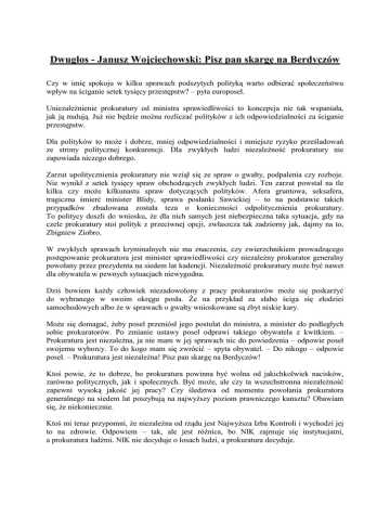 Dwugłos - Janusz Wojciechowski: Pisz pan skargę na Berdyczów Czy w imię spokoju w kilku sprawach podszytych polityką warto odbierać społeczeństwu wpływ na ściganie setek tysięcy przestępstw? – pyta europoseł. UniezaleŜnienie prokuratury od ministra sprawiedliwości to koncepcja nie tak wspaniała, jak ją malują. JuŜ nie będzie moŜna rozliczać polityków z ich odpowiedzialności za ściganie przestępstw. Dla polityków to moŜe i dobrze, mniej odpowiedzialności i mniejsze ryzyko prześladowań ze strony politycznej konkurencji. Dla zwykłych ludzi niezaleŜność prokuratury nie zapowiada niczego dobrego. Zarzut upolitycznienia prokuratury nie wziął się ze spraw o gwałty, podpalenia czy rozboje. Nie wynikł z setek tysięcy spraw obchodzących zwykłych ludzi. Ten zarzut powstał na tle kilku czy moŜe kilkunastu spraw dotyczących polityków. Afera gruntowa, seksafera, tragiczna śmierć minister Blidy, sprawa posłanki Sawickiej – to na podstawie takich przypadków zbudowana została teza o konieczności odpolitycznienia prokuratury. To politycy doszli do wniosku, Ŝe dla nich samych jest niebezpieczna taka sytuacja, gdy na czele prokuratury stoi polityk z przeciwnej opcji, zwłaszcza tak zadziorny jak, dajmy na to, Zbigniew Ziobro. W zwykłych sprawach kryminalnych nie ma znaczenia, czy zwierzchnikiem prowadzącego postępowanie prokuratora jest minister sprawiedliwości czy niezaleŜny prokurator generalny powołany przez prezydenta na siedem lat kadencji. NiezaleŜność prokuratury moŜe być nawet dla obywatela w pewnych sytuacjach niewygodna. Dziś bowiem kaŜdy człowiek niezadowolony z pracy prokuratorów moŜe się poskarŜyć do wybranego w swoim okręgu posła. śe na przykład za słabo ściga się złodziei samochodowych albo Ŝe w sprawach o gwałty wnioskowane są zbyt niskie kary. MoŜe się domagać, Ŝeby poseł przeniósł jego postulat do ministra, a minister do podległych sobie prokuratorów. Po zmianie ustawy poseł odprawi takiego obywatela z kwitkiem. – Prokuratura jest niezaleŜna, ja nie mam w jej sprawach nic do powiedzenia – odpowie poseł swojemu wyborcy. To do kogo mam się zwrócić – spyta obywatel. – Do nikogo – odpowie poseł. – Prokuratura jest niezaleŜna! Pisz pan skargę na Berdyczów! Ktoś powie, Ŝe to dobrze, bo prokuratura powinna być wolna od jakichkolwiek nacisków, zarówno politycznych, jak i społecznych. Być moŜe, ale czy ta wszechstronna niezaleŜność zapewni wysoką jakość jej pracy? Czy śledztwa od momentu powołania prokuratora generalnego na siedem lat poszybują na najwyŜszy poziom prawniczego kunsztu? Obawiam się, Ŝe niekoniecznie. Ktoś mi teraz przypomni, Ŝe niezaleŜna od rządu jest NajwyŜsza Izba Kontroli i wychodzi jej to na zdrowie. Odpowiem – tak, ale jest róŜnica, bo NIK zajmuje się instytucjami, a prokuratura ludźmi. NIK nie decyduje o losach ludzi, a prokuratura decyduje. Usłyszę inny argument, Ŝe jest przecieŜ kontrola sądu. Owszem, ale dotyczy tylko niektórych działań prokuratury, z obszaru postępowania karnego. Powiem wprost – obawiam się, czy niezaleŜność prokuratury nie będzie się tu i ówdzie przeradzała w nieodpowiedzialność. Czy w imię spokoju w kilku sprawach podszytych polityką warto odbierać społeczeństwu wpływ na ściganie setek tysięcy przestępstw? Czy politycy zawsze muszą być waŜniejsi od zwykłych ludzi? To swoisty paradoks polskiej demokracji. Najpierw wybieramy polityków, wierząc w składane przez nich obietnice, równieŜ te dotyczące walki z przestępczością, a potem staramy się, Ŝeby zaleŜało od nich jak najmniej. To po co ich wybieramy? Autor, były szef NIK i wicemarszałek Sejmu, jest posłem do Parlamentu Europejskiego wybranym z listy PSL, obecnie w PSL „Piast” – partii sojuszniczej PiS. Źródło : Rzeczpospolita http://www.rp.pl/artykul/81556.html