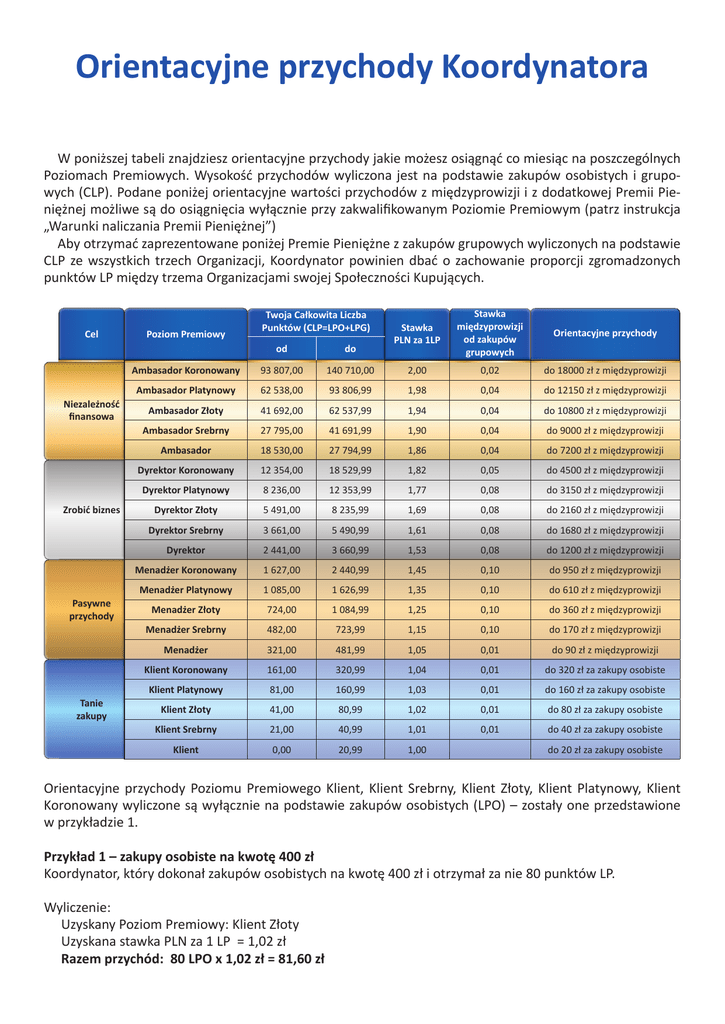 Orientacyjne przychody Koordynatora W poniższej tabeli znajdziesz orientacyjne przychody jakie możesz osiągnąć co miesiąc na poszczególnych Poziomach Premiowych. Wysokość przychodów wyliczona jest na podstawie zakupów osobistych i grupowych (CLP). Podane poniżej orientacyjne wartości przychodów z międzyprowizji i z dodatkowej Premii Pieniężnej możliwe są do osiągnięcia wyłącznie przy zakwalifikowanym Poziomie Premiowym (patrz instrukcja „Warunki naliczania Premii Pieniężnej”) Aby otrzymać zaprezentowane poniżej Premie Pieniężne z zakupów grupowych wyliczonych na podstawie CLP ze wszystkich trzech Organizacji, Koordynator powinien dbać o zachowanie proporcji zgromadzonych punktów LP między trzema Organizacjami swojej Społeczności Kupujących. Cel Niezależność finansowa Zrobić biznes Pasywne przychody Tanie zakupy Poziom Premiowy Twoja Całkowita Liczba Punktów (CLP=LPO+LPG) Stawka PLN za 1LP Stawka międzyprowizji od zakupów grupowych Orientacyjne przychody od do Ambasador Koronowany 93 807,00 140 710,00 2,00 0,02 do 18000 zł z międzyprowizji Ambasador Platynowy 62 538,00 93 806,99 1,98 0,04 do 12150 zł z międzyprowizji Ambasador Złoty 41 692,00 62 537,99 1,94 0,04 do 10800 zł z międzyprowizji Ambasador Srebrny 27 795,00 41 691,99 1,90 0,04 do 9000 zł z międzyprowizji Ambasador 18 530,00 27 794,99 1,86 0,04 do 7200 zł z międzyprowizji Dyrektor Koronowany 12 354,00 18 529,99 1,82 0,05 do 4500 zł z międzyprowizji Dyrektor Platynowy 8 236,00 12 353,99 1,77 0,08 do 3150 zł z międzyprowizji Dyrektor Złoty 5 491,00 8 235,99 1,69 0,08 do 2160 zł z międzyprowizji Dyrektor Srebrny 3 661,00 5 490,99 1,61 0,08 do 1680 zł z międzyprowizji Dyrektor 2 441,00 3 660,99 1,53 0,08 do 1200 zł z międzyprowizji Menadżer Koronowany 1 627,00 2 440,99 1,45 0,10 do 950 zł z międzyprowizji Menadżer Platynowy 1 085,00 1 626,99 1,35 0,10 do 610 zł z międzyprowizji Menadżer Złoty 724,00 1 084,99 1,25 0,10 do 360 zł z międzyprowizji Menadżer Srebrny 482,00 723,99 1,15 0,10 do 170 zł z międzyprowizji Menadżer 321,00 481,99 1,05 0,01 do 90 zł z międzyprowizji Klient Koronowany 161,00 320,99 1,04 0,01 do 320 zł za zakupy osobiste Klient Platynowy 81,00 160,99 1,03 0,01 do 160 zł za zakupy osobiste Klient Złoty 41,00 80,99 1,02 0,01 do 80 zł za zakupy osobiste Klient Srebrny 21,00 40,99 1,01 0,01 do 40 zł za zakupy osobiste Klient 0,00 20,99 1,00 do 20 zł za zakupy osobiste Orientacyjne przychody Poziomu Premiowego Klient, Klient Srebrny, Klient Złoty, Klient Platynowy, Klient Koronowany wyliczone są wyłącznie na podstawie zakupów osobistych (LPO) – zostały one przedstawione w przykładzie 1. Przykład 1 – zakupy osobiste na kwotę 400 zł Koordynator, który dokonał zakupów osobistych na kwotę 400 zł i otrzymał za nie 80 punktów LP. Wyliczenie: Uzyskany Poziom Premiowy: Klient Złoty Uzyskana stawka PLN za 1 LP = 1,02 zł Razem przychód: 80 LPO x 1,02 zł = 81,60 zł Przykład 2 – zakupy osobiste i grupowe na kwotę 400 zł przy zakwalifikowanym Poziomie Premiowym (Kwalifikacja Poziomu Premiowego – patrz instrukcja „Warunki naliczania Premii Pieniężnej”) Koordynator, który dokonał zakupów osobistych na kwotę 40 zł i otrzymał za nie 4 punkty LP. Dodatkowo jego Organizacje zrobiły zakupy na kwotę: Organizacja A 120 zł – 25,33 punkty LPG Organizacja B 120 zł - 25,33 punkty LPG Organizacja C 120 zł - 25,33 punkty LPG Wyliczenie: Uzyskany Poziom Premiowy: Klient Złoty Uzyskana stawka PLN za 1 LP: 1,02 zł Międzyprowizja z Organizacji A od zakupów grupowych: 0,01 zł Międzyprowizja z Organizacji B od zakupów grupowych: 0,01 zł Międzyprowizja z Organizacji C od zakupów grupowych: 0,01 zł Przychód za zakupy osobiste: 4 LPO x 1,02 zł = 4,08 zł Przychód za zakupy grupowe: Organizacja A: 25,33 LPG x 0,01 zł = 0,25 zł Organizacja B: 25,33 LPG x 0,01 zł = 0,25 zł Organizacja C: 25,33 LPG x 0,01 zł = 0,25 zł Razem przychód: 4,08 zł + 0,75 zł = 4,83 zł Przykład 3 – zakupy osobiste i grupowe na kwotę 400 zł przy braku kwalifikacji Poziomu Premiowego (Kwalifikacja Poziomu Premiowego – patrz instrukcja „Warunki naliczania Premii Pieniężnej”) Koordynator, który dokonał zakupów osobistych na kwotę 40 zł i otrzymał za nie 4 punkty LP. Dodatkowo jego Organizacje zrobiły zakupy na kwotę: Organizacja A 240 zł – 50,66 punkty LPG Organizacja B 0 zł – 0 punkty LPG Organizacja C 120 zł – 25,33 punkty LPG Wyliczenie: Uzyskany Poziom Premiowy: Klient Złoty – brak kwalifikacji poziomu Zakwalifikowany Poziom Premiowy: Klient Srebrny (4 LPO + 25,33 LPG z dwóch Organizacji poza Organizacją, która uzyskała najwyższe LPG) Uzyskana stawka PLN za 1 LP: 29,33 CLP - 1,01 zł Międzyprowizja z Organizacji A od zakupów grupowych: 0,00 zł (brak kwalifikacji poziomu) Międzyprowizja z Organizacji B od zakupów grupowych: 0,01 zł Międzyprowizja z Organizacji C od zakupów grupowych: 0,00 zł Przychód za zakupy osobiste: 4 LPO x 1,01 zł = 4,04 zł Przychód za zakupy grupowe: Organizacja A: 50,66 LPG x 0,00 zł = 0,00 zł (brak kwalifikacji poziomu) Organizacja B: 00,00 LPG x 0,00 zł = 0,00 zł Organizacja C: 25,33 LPG x 0,00 zł = 0,00 zł Razem przychód: 4,04 zł + 0,00 zł = 4,04 zł Koordynatorzy, którzy kwalifikują uzyskany w danym miesiącu Poziom Premiowy mają szansę na dodatkowe Premie Pieniężne od Koordynatorów z dolnej linii sponsorowania, którzy nie zakwalifikowali Poziomu Premiowego.