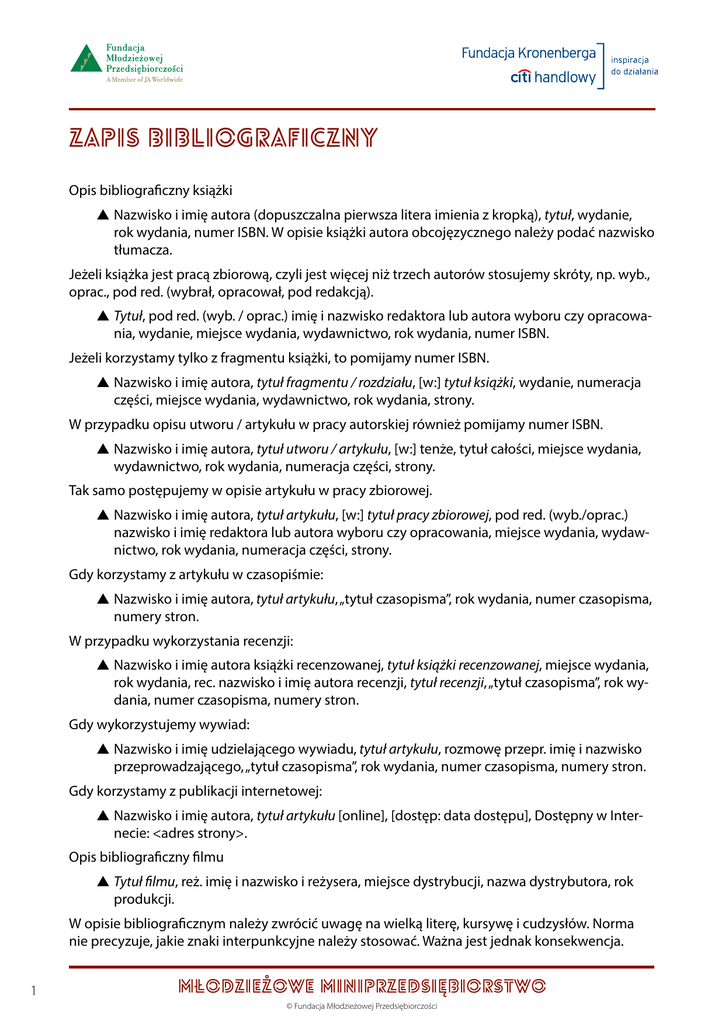 Zapis bibliograficzny Opis bibliograficzny książki ss Nazwisko i imię autora (dopuszczalna pierwsza litera imienia z kropką), tytuł, wydanie, rok wydania, numer ISBN. W opisie książki autora obcojęzycznego należy podać nazwisko tłumacza. Jeżeli książka jest pracą zbiorową, czyli jest więcej niż trzech autorów stosujemy skróty, np. wyb., oprac., pod red. (wybrał, opracował, pod redakcją). ss Tytuł, pod red. (wyb. / oprac.) imię i nazwisko redaktora lub autora wyboru czy opracowania, wydanie, miejsce wydania, wydawnictwo, rok wydania, numer ISBN. Jeżeli korzystamy tylko z fragmentu książki, to pomijamy numer ISBN. ss Nazwisko i imię autora, tytuł fragmentu / rozdziału, [w:] tytuł książki, wydanie, numeracja części, miejsce wydania, wydawnictwo, rok wydania, strony. W przypadku opisu utworu / artykułu w pracy autorskiej również pomijamy numer ISBN. ss Nazwisko i imię autora, tytuł utworu / artykułu, [w:] tenże, tytuł całości, miejsce wydania, wydawnictwo, rok wydania, numeracja części, strony. Tak samo postępujemy w opisie artykułu w pracy zbiorowej. ss Nazwisko i imię autora, tytuł artykułu, [w:] tytuł pracy zbiorowej, pod red. (wyb./oprac.) nazwisko i imię redaktora lub autora wyboru czy opracowania, miejsce wydania, wydawnictwo, rok wydania, numeracja części, strony. Gdy korzystamy z artykułu w czasopiśmie: ss Nazwisko i imię autora, tytuł artykułu, „tytuł czasopisma”, rok wydania, numer czasopisma, numery stron. W przypadku wykorzystania recenzji: ss Nazwisko i imię autora książki recenzowanej, tytuł książki recenzowanej, miejsce wydania, rok wydania, rec. nazwisko i imię autora recenzji, tytuł recenzji, „tytuł czasopisma”, rok wydania, numer czasopisma, numery stron. Gdy wykorzystujemy wywiad: ss Nazwisko i imię udzielającego wywiadu, tytuł artykułu, rozmowę przepr. imię i nazwisko przeprowadzającego, „tytuł czasopisma”, rok wydania, numer czasopisma, numery stron. Gdy korzystamy z publikacji internetowej: ss Nazwisko i imię autora, tytuł artykułu [online], [dostęp: data dostępu], Dostępny w Internecie: <adres strony>. Opis bibliograficzny filmu ss Tytuł filmu, reż. imię i nazwisko i reżysera, miejsce dystrybucji, nazwa dystrybutora, rok produkcji. W opisie bibliograficznym należy zwrócić uwagę na wielką literę, kursywę i cudzysłów. Norma nie precyzuje, jakie znaki interpunkcyjne należy stosować. Ważna jest jednak konsekwencja. 1 MŁODZIEŻOWE MINIPRZEDSIĘBIORSTWO © Fundacja Młodzieżowej Przedsiębiorczości