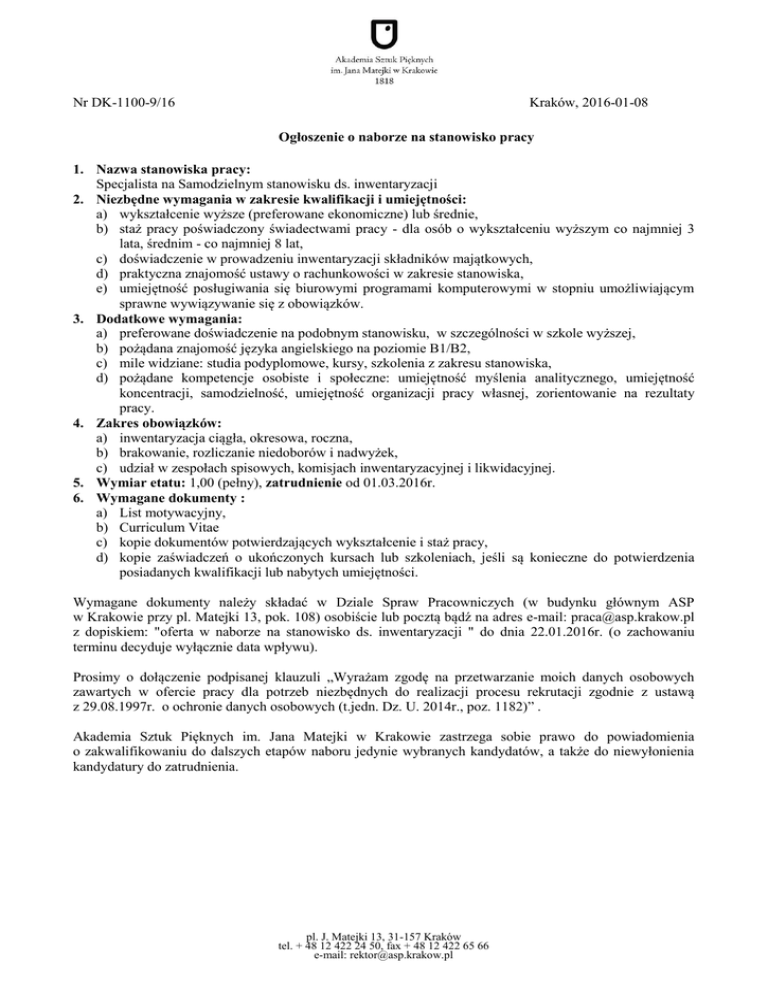 Kraków, 2016-01-08 Nr DK-1100-9/16 Ogłoszenie o naborze na stanowisko pracy 1. Nazwa stanowiska pracy: Specjalista na Samodzielnym stanowisku ds. inwentaryzacji 2. Niezbędne wymagania w zakresie kwalifikacji i umiejętności: a) wykształcenie wyższe (preferowane ekonomiczne) lub średnie, b) staż pracy poświadczony świadectwami pracy - dla osób o wykształceniu wyższym co najmniej 3 lata, średnim - co najmniej 8 lat, c) doświadczenie w prowadzeniu inwentaryzacji składników majątkowych, d) praktyczna znajomość ustawy o rachunkowości w zakresie stanowiska, e) umiejętność posługiwania się biurowymi programami komputerowymi w stopniu umożliwiającym sprawne wywiązywanie się z obowiązków. 3. Dodatkowe wymagania: a) preferowane doświadczenie na podobnym stanowisku, w szczególności w szkole wyższej, b) pożądana znajomość języka angielskiego na poziomie B1/B2, c) mile widziane: studia podyplomowe, kursy, szkolenia z zakresu stanowiska, d) pożądane kompetencje osobiste i społeczne: umiejętność myślenia analitycznego, umiejętność koncentracji, samodzielność, umiejętność organizacji pracy własnej, zorientowanie na rezultaty pracy. 4. Zakres obowiązków: a) inwentaryzacja ciągła, okresowa, roczna, b) brakowanie, rozliczanie niedoborów i nadwyżek, c) udział w zespołach spisowych, komisjach inwentaryzacyjnej i likwidacyjnej. 5. Wymiar etatu: 1,00 (pełny), zatrudnienie od 01.03.2016r. 6. Wymagane dokumenty : a) List motywacyjny, b) Curriculum Vitae c) kopie dokumentów potwierdzających wykształcenie i staż pracy, d) kopie zaświadczeń o ukończonych kursach lub szkoleniach, jeśli są konieczne do potwierdzenia posiadanych kwalifikacji lub nabytych umiejętności. Wymagane dokumenty należy składać w Dziale Spraw Pracowniczych (w budynku głównym ASP w Krakowie przy pl. Matejki 13, pok. 108) osobiście lub pocztą bądź na adres e-mail: [email protected] z dopiskiem: "oferta w naborze na stanowisko ds. inwentaryzacji " do dnia 22.01.2016r. (o zachowaniu terminu decyduje wyłącznie data wpływu). Prosimy o dołączenie podpisanej klauzuli „Wyrażam zgodę na przetwarzanie moich danych osobowych zawartych w ofercie pracy dla potrzeb niezbędnych do realizacji procesu rekrutacji zgodnie z ustawą z 29.08.1997r. o ochronie danych osobowych (t.jedn. Dz. U. 2014r., poz. 1182)” . Akademia Sztuk Pięknych im. Jana Matejki w Krakowie zastrzega sobie prawo do powiadomienia o zakwalifikowaniu do dalszych etapów naboru jedynie wybranych kandydatów, a także do niewyłonienia kandydatury do zatrudnienia. pl. J. Matejki 13, 31-157 Kraków tel. + 48 12 422 24 50, fax + 48 12 422 65 66 e-mail: [email protected]