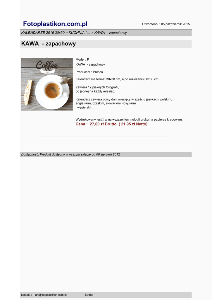 Fotoplastikon.com.pl Utworzono : 05 październik 2015 KALENDARZE 2016 30x30 > KUCHNIA i ... > KAWA - zapachowy KAWA - zapachowy Model : P KAWA - zapachowy Producent : Presco Kalendarz ma format 30x30 cm, a po rozłożeniu 30x60 cm. Zawiera 12 pięknych fotografii, po jednej na każdy miesiąc. Kalendarz zawiera opisy dni i miesięcy w sześciu językach: polskim, angielskim, czeskim, słowackim, rosyjskim i węgierskim. Wydrukowany jest�w najwyższej technologii druku na papierze kredowym. Cena : 27,00 zł Brutto ( 21,95 zł Netto) Dostępność: Produkt dostępny w naszym sklepie od 06 sierpień 2012 kontakt : - [email protected] Strona 1
