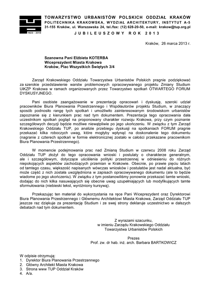 TOW ARZYSTWO URBANISTÓW POLSKICH ODDZIAŁ KRAKÓW P O L I T E C H N I K A K R A K O W S K A, W Y D Z I AŁ A R C H I T E K T U R Y , I N S T Y T U T A- 5 31-155 Kraków, ul. Warszawska 24, tel./fax: (12) 628-20-50, e-mail: [email protected] J U B I L E U S Z O W Y R O K 2 0 1 3 Kraków, 26 marca 2013 r. Szanowna Pani Elżbieta KOTERBA Wiceprezydent Miasta Krakowa Kraków, Plac Wszystkich Świętych 3/4 Zarząd Krakowskiego Oddziału Towarzystwa Urbanistów Polskich pragnie podziękować za szerokie przedstawienie warstw problemowych opracowywanego projektu Zmiany Studium UiKZP Krakowa w ramach organizowanych przez Towarzystwo spotkań OTWARTEGO FORUM DYSKUSYJNEGO. Pani osobiste zaangażowanie w prezentację opracowań i dyskusję, szeroki udział pracowników Biura Planowania Przestrzennego i Współautorów projektu Studium, w znaczący sposób podnosiło rangę tych spotkań i umożliwiło zainteresowanym środowiskom urbanistów zapoznanie się z kierunkiem prac nad tym dokumentem. Prezentacja tego opracowania dała uczestnikom spotkań pogląd na proponowany charakter rozwoju Krakowa, przy czym poznanie szczegółowych decyzji będzie możliwe niewątpliwie po jego ukończeniu. W związku z tym Zarząd Krakowskiego Oddziału TUP, po analizie przebiegu dyskusji na spotkaniach FORUM pragnie przekazać kilka roboczych uwag, które mogłyby wpłynąć na doskonalenie tego dokumentu (nagranie z czterech spotkań w formie elektronicznej zostało w całości przekazane pracownikom Biura Planowania Przestrzennego). W momencie podejmowania prac nad Zmianą Studium w czerwcu 2008 roku Zarząd Oddziału TUP złożył do tego opracowania wnioski i postulaty o charakterze generalnym, ale i szczegółowym, dotyczące uściślenia polityki przestrzennej w odniesieniu do różnych niepokojących aspektów zachodzących przemian w Krakowie. Obecnie, po prawie pięciu latach od tamtego czasu, większość napisanych wówczas wniosków i postulatów jest nadal aktualna, być może część z nich została uwzględniona w zapisach opracowywanego dokumentu (ale to będzie wiadome po jego ukończeniu). W związku z tym postanowiliśmy ponownie przekazać tamte wnioski, dodając do nich kilka nasuwających się obecnie uwag uzupełniających lub modyfikujących tamte sformułowania (niebieski tekst, wyróżniony kursywą). Przekazując ten materiał do wykorzystania na ręce Pani Wiceprezydent oraz Dyrektorowi Biura Planowania Przestrzennego i Głównemu Architektowi Miasta Krakowa, Zarząd Oddziału TUP jeszcze raz dziękuje za prezentację Studium i ze swej strony deklaruje uczestnict wo w dalszych debatach nad tym dokumentem. Z wyrazami szacunku, w imieniu Zarządu Krakowskiego Oddziału Towarzystwa Urbanistów Polskich Prezes Prof. zw. dr hab. inż. arch. Barbara BARTKOWICZ W 1. 2. 3. 4. odpisie otrzymują: Dyrektor Biura Planowania Przestrzennego Główny Architekt Miasta Krakowa Strona www TUP Oddział Kraków A/a. TOW ARZYSTWO URBANISTÓW POLSKICH ODDZIAŁ KRAKÓW P O L I T E C H N I K A K R A K O W S K A, W Y D Z I AŁ A R C H I T E K T U R Y , I N S T Y T U T A- 5 31-155 Kraków, ul. Warszawska 24, tel./fax: (12) 628-20-50, e-mail: [email protected] J U B I L E U S Z O W Y R O K 2 0 1 3 Kraków, 26 marca 2013 r. UWAGI ROBOCZE DO PROJEKTU ZMIANY STUDIUM UiKZP KRAKOWA PO PREZENTACJI TEGO OPRACOWANIA W RAMACH SPOTKAŃ TUP NA OTWARTYM FORUM DYSKUSYJNYM URBANISTÓW A. Wnioski do „Zmiany Studium Uwarunkowań i Kierunków Zagospodarowania Przestrzennego Krakowa” – złożone na ręce Dyrektora Biura Planowania Przestrzennego w momencie podejmowania prac nad Studium, tj. 30 czerwca 2008 r. B. Dodatkowe uwagi i modyfikacje po prezentacji nowego Studium w ramach Forum TUP, styczeń – marzec 2013 r. W związku z rozpoczęciem prac nad zmianą Studium dla Krakowa, Zarząd Krakowskiego Oddziału Towarzystwa Urbanistów Polskich – stosownie do celów statutowych Towarzystwa, określonych w §8, p. 1, pp. 2 oraz p. 2, pp. 2c – składa kilka najważniejszych postulatów i wniosków dotyczących powyższego opracowania. I. Głównym zadaniem podejmowanej „Zmiany Studium” powinno być czytelne określenie wizji funkcjonalno-przestrzennego rozwoju Krakowa oraz równie czytelne sformułowanie zasad przebudowy i rozwoju struktury miejskiej, które zahamują obecny proces narastania chaosu inwestycyjnego i nieodwracalne niszczenie unikatowych wartości kulturowych, przyrodniczych i krajobrazowych Krakowa. W obecnym układzie przestrzennym Kraków wyczerpał swoje możliwości czytelnych kierunków rozwoju, a brak wolnych terenów w Śródmieściu dla lokalizacji znaczących funkcji, powoduje ich bezładne rozrzucanie na całym obszarze miasta, przy równocześnie niebywale silnej presji na resztki terenów niezabudowanych w jego centralnej strefie. Z tego względu Studium powinno spełnić dwie role: ochronną - ograniczającą presję inwestycyjną na tereny o najwyższych wartościach dziedzictwa kulturowego i ich ekspozycję oraz specyficzne dla Krakowa, różnorodne wartości przyrodnicze i krajobrazowe; kreacyjną - wskazującą zasady krystalizacji struktury miejskiej, oparte o: ˗ czytelne wyodrębnienie terenów otwartych (tworzących nienaruszalny system przyrodniczy), od terenów zainwestowanych; ˗ stworzenie podstaw krystalizacji rozlewającej się tkanki miejskiej, dostosowan ych do zróżnicowanego charakteru poszczególnych obszarów. II. W nawiązaniu do tego, rysuje się bardzo wiele wniosków o charakterze ogólnym i szczegółowym, ale jako najważniejsze dla ocalenia charakteru i niepowtarzalnego nastroju starego Krakowa wydaje się konieczne (oprócz zapisanych w obecnym Studium zasad ochrony środowiska kulturowego i przyrodniczego – plansza K2) dodanie kilku generalnych i konkretnych zapisów ustaleń dla polityki przestrzennej, ograniczających obecną swobodę przekształceń zabytkowej tkanki (łącznie z obszarami rozwoju XIX-wiecznego i międzywojennego, czyli poszerzony ob
