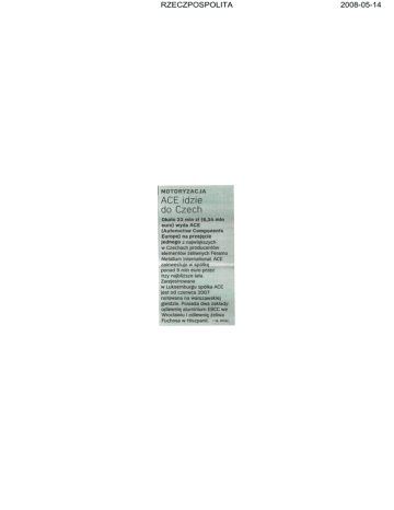 RZECZPOSPOLITA MOTORYZACJA ACE idzie do Czech Około 22 mln zł (6,34 mln euro) wyda ACE (Automotive Components Europe) na przejęcie jednego z największych w Czechach producentów elementów żeliwnych Feramo Metallum International. ACE zainwestuje w spółkę ponad 9 mln euro przez trzy najbliższe lata. Zarejestrowana w Luksemburgu spółka ACE jest od czerwca 2007 notowana na warszawskiej giełdzie. Posiada dwa zakłady: odlewnię aluminium EBCC we Wrocławiu i odlewnię żeliwa Fuchosa w Hiszpanii -a. mac. 2008-05-14