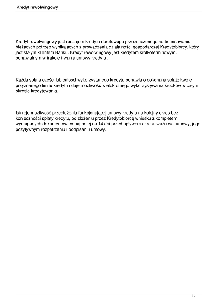 Kredyt rewolwingowy Kredyt rewolwingowy jest rodzajem kredytu obrotowego przeznaczonego na finansowanie bieżących potrzeb wynikających z prowadzenia działalności gospodarczej Kredytobiorcy, który jest stałym klientem Banku. Kredyt rewolwingowy jest kredytem krótkoterminowym, odnawialnym w trakcie trwania umowy kredytu . Każda spłata części lub całości wykorzystanego kredytu odnawia o dokonaną spłatę kwotę przyznanego limitu kredytu i daje możliwość wielokrotnego wykorzystywania środków w całym okresie kredytowania. Istnieje możliwość przedłużenia funkcjonującej umowy kredytu na kolejny okres bez konieczności spłaty kredytu, po złożeniu przez Kredytobiorcę wniosku z kompletem wymaganych dokumentów co najmniej na 14 dni przed upływem okresu ważności umowy, jego pozytywnym rozpatrzeniu i podpisaniu umowy. 1/1