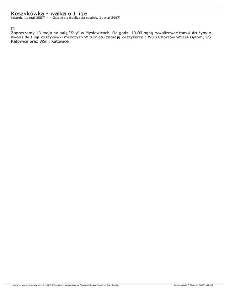 Koszykówka - walka o I lige (piątek, 11 maj 2007) - - Ostatnia aktualizacja (piątek, 11 maj 2007) Zapraszamy 13 maja na halę "Siły" w Mysłowicach. Od godz. 10.00 będą rywalizować tam 4 drużyny o awans do I ligi koszykówki meżczyzn W turnieju zagrają koszykarze : WSB Chorzów WSEiA Bytom, UŚ Katowice oraz WSTI Katowice. http://www.azs.katowice.pl - AZS Katowice - Organizacja ŚrodowiskowaPowered by Mambo Generated: 8 March, 2017, 04:02