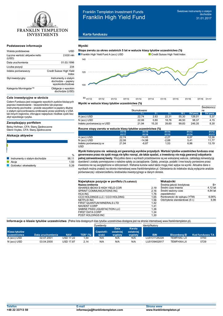 Franklin Templeton Investment Funds Światowe instrumenty o stałym dochodzie Franklin High Yield Fund 31.01.2017 Karta funduszu Podstawowe informacje Wyniki Waluta podstawowa USD Łączna wartość aktywów netto (USD) 2.630 mln Stopa zwrotu za okres ostatnich 5 lat w walucie klasy tytułów uczestnictwa (%) Franklin High Yield Fund A (acc) USD Credit Suisse High Yield Index 140 Data uruchomienia 01.03.1996 Liczba pozycji 234 Indeks porównawczy Credit Suisse High Yield Index Styl inwestycyjny Instrumenty o stałym dochodzie – papiery wysokodochodowe Kategoria Morningstar™ Obligacje o wysokim dochodzie (USD) Cele inwestycyjne w skrócie 120 100 80 01/12 Celem Funduszu jest osiąganie wysokich zysków bieżących poprzez inwestowanie - bezpośrednio lub poprzez instrumenty pochodne - przede wszystkim w papiery dłużne o stałym oprocentowaniu emitowane przez podmioty z USA lub innych regionów, oferujące najwyższe możliwe zyski bez zbyt wysokiego ryzyka. 07/12 01/13 07/13 01/14 07/14 01/15 01/17 1 r. 3 l. 5 l. 10 l. Od pocz. Od pocz. 22,74 22,06 21,94 2,63 0,80 15,30 22,31 18,76 39,60 55,30 46,50 99,83 126,01 98,37 246,35 5,37 4,15 8,30 Betsy Hofman, CFA: Stany Zjednoczone Glenn Voyles, CFA: Stany Zjednoczone Roczne stopy zwrotu w walucie klasy tytułów uczestnictwa (%) A (acc) USD N (acc) USD Indeks porównawczy w USD Instrumenty o stałym dochodzie Akcje Gotówka i ekwiwalenty 07/16 Średniorocz ne Zarządzający portfelem % 98,11 1,50 0,39 01/16 Skumulowane A (acc) USD N (acc) USD Indeks porównawczy w USD Alokacja aktywów 07/15 Wyniki w walucie klasy tytułów uczestnictwa (%) 01/16 01/17 01/15 01/16 01/14 01/15 01/13 01/14 01/12 01/13 22,74 22,06 21,94 -14,45 -14,98 -6,87 -2,27 -2,88 1,53 6,07 5,41 6,96 12,36 11,77 13,19 Wyniki historyczne nie wskazują ani gwarantują wyników przyszłych. Wartość tytułów uczestnictwa funduszu oraz generowane przez nie zyski mogą nie tylko rosnąć, ale także spadać, a inwestorzy nie mają gwarancji odzyskania pełnej zainwestowanej kwoty. Wszystkie dane o wynikach przedstawione są we wskazanej walucie, zakładają reinwestycję dywidend i zostały pomniejszone o należne opłaty za zarządzanie. Opłaty, prowizje, podatki i inne koszty poniesione przez inwestora nie są uwzględnione w obliczeniach. Wahania kursów walut także mogą mieć wpływ na wyniki. Aktualne dane o wynikach można znaleźć na stronie internetowej www.franklintempleton.pl. Odniesienia do indeksów służą wyłącznie analizie porównawczej i odzwierciedleniu środowiska inwestycyjnego w danym okresie. Największe pozycje w portfelu (% całości) Nazwa emitenta ISHARES IBOXX $ HIGH YIELD COR SPRINT COMMUNICATIONS INC HCA INC CCO HOLDINGS LLC / CCO HOLDING NETFLIX INC FIRST QUANTUM MINERALS LTD NAVIENT CORP SABINE PASS LIQUEFACTION LLC FIRST DATA CORP POST HOLDINGS INC Wskaźniki 2,19 2,16 1,76 1,65 1,56 1,42 1,41 1,36 1,34 1,30 Średnia jakość kredytowa Średni czas trwania Średni ważony czas zapadalności Rentowność do wykupu (YTM) Odchylenie standardowe (5 l.) B+ 4,12 lat 4,84 lat 6,06% 6,96 Informacje o klasie tytułów uczestnictwa (Pełna lista dostępnych klas tytułów uczestnictwa dostępna jest na stronie internetowej www.franklintempleton.pl). Dywidendy Klasa tytułów uczestnictwa A (acc) USD N (acc) USD Telefon +48 22 33713 50 Data uruchomienia 02.07.2001 03.04.2000 NAV USD 17,22 USD 17,87 TER* (%) 1,54 2,14 Częstotliwość N/A N/A Identyfikatory Data ostatniej wypłaty N/A N/A E-mail [email protected] Kwota ostatniej wypłaty N/A N/A ISIN LU0131126228 LU0109402817 Bloomberg ID TEMFHAC LX TEMFHXA LX Strona www www.franklintempleton.pl Kod funduszu TA 0750 0729 Franklin High Yield Fund 31.01.2017 Skład portfela Franklin High Yield Fund Credit Suisse High Yield Index Alokacja sektorowa Produkty spożywcze i napoje Energia Technologie Bezprzewodowa Usługi konsumenckie o charakterze cyklicznym Przewodowa Przedsiębiorstwa chemiczne Kablowa Satelitarna Usługi komunalne Inne 11,32 8,82 8,02 7,80 7,77 6,80 6,72 6,04 5,45 31,26 % całości / 16,16 / 7,94 / 5,27 / 6,63 / 7,18 / 4,67 / 4,72 / 4,45 / 2,68 / 40,31 Dane o ekspozycji portfela na instrumenty pochodne Dane dotyczące alokacji aktywów odzwierciedlają ekspozycje rynkowe poszczególnych instrumentów pochodnych w portfelu (lub powiązanych z nimi aktywów bazowych) i mogą nie sumować się do 100% lub mieć wartość ujemną wskutek zaokrągleń, wykorzystania instrumentów pochodnych, nierozliczonych transakcji i innych czynników. Wskaźniki średniego czasu trwania, średniego ważonego czasu zapadalności i rentowności do wykupu (YTM) odzwierciedlają poszczególne instrumenty pochodne w portfelu (lub powiązane z nimi aktywa bazowe). Skład portfela — Dane o alokacji sektorowej portfela odzwierciedlają ekspozycje rynkowe poszczególnych instrumentów pochodnych w portfelu (lub powiązanych z nimi aktywów bazowych) i mogą nie sumować się do 100% lub mieć wartość ujemną wskutek zaokrągleń, wykorzystania instrumentów pochodnych, nierozliczonych transakcji i innych czynników. Ważne informacje Franklin Templeton Investment Funds ('Fundusz') to spółka SICAV z siedzibą w Luksemburgu. O ile nie zaznaczono inaczej, źródłem danych i informacji zawartych w niniejszym dokumencie jest Franklin Templeton Investments, a dane są aktualne na dzień wydania niniejszego dokumentu. O ile nie zaznaczono inaczej, dane dotyczące indeksów porównawczych pochodzą od FactSet i są aktualne na dzień wydania niniejszego dokumentu. Niniejszy dokument nie stanowi porady prawnej, podatkowej ani inwestycyjnej ani oferty tytułów uczestnictwa Funduszu. Decyzje o zapisach na tytuły uczestnictwa Funduszu należy podejmować wyłącznie w oparciu o informacje zawarte w aktualnym prospekcie Funduszu oraz w „Kluczowych informacjach dla inwestorów” (o ile taki dokument jest dostępny), a także w ostatnim poddanym audytowi sprawozdaniu rocznym lub półrocznym, które można znale