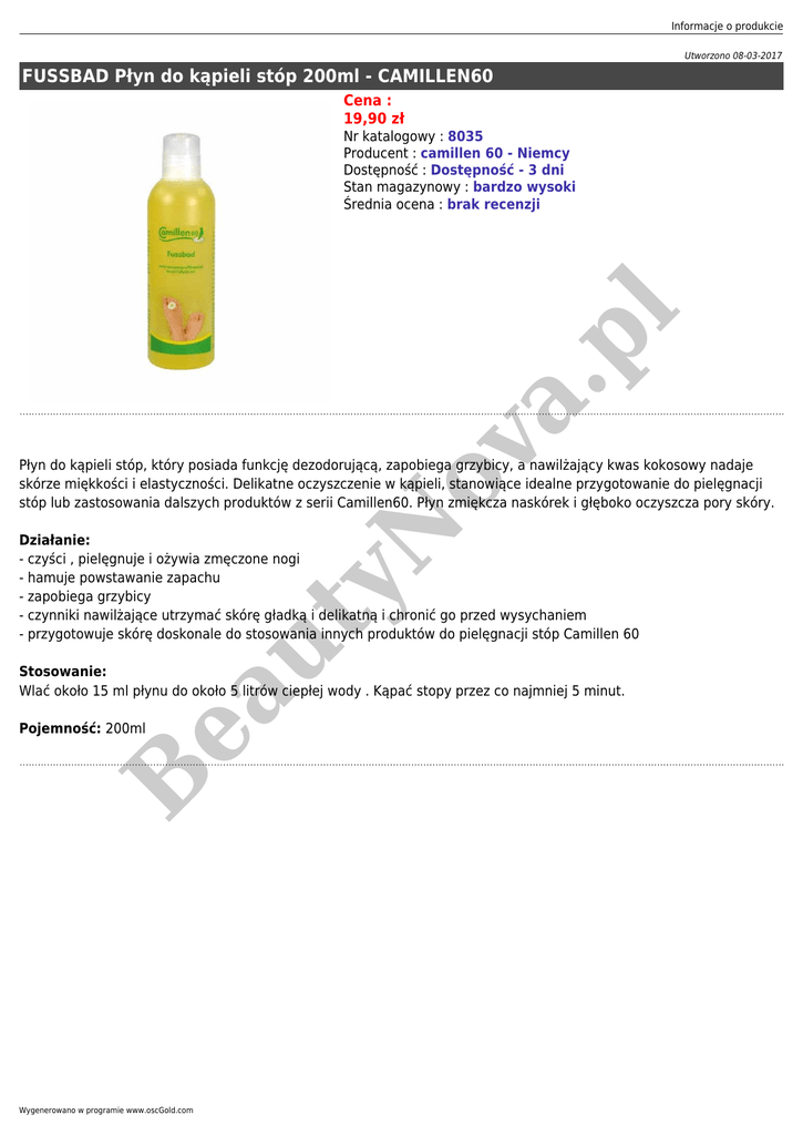 Informacje o produkcie Utworzono 08-03-2017 FUSSBAD Płyn do kąpieli stóp 200ml - CAMILLEN60 Cena : 19,90 zł ov a. pl Nr katalogowy : 8035 Producent : camillen 60 - Niemcy Dostępność : Dostępność - 3 dni Stan magazynowy : bardzo wysoki Średnia ocena : brak recenzji yN Płyn do kąpieli stóp, który posiada funkcję dezodorującą, zapobiega grzybicy, a nawilżający kwas kokosowy nadaje skórze miękkości i elastyczności. Delikatne oczyszczenie w kąpieli, stanowiące idealne przygotowanie do pielęgnacji stóp lub zastosowania dalszych produktów z serii Camillen60. Płyn zmiękcza naskórek i głęboko oczyszcza pory skóry. ut Działanie: - czyści , pielęgnuje i ożywia zmęczone nogi - hamuje powstawanie zapachu - zapobiega grzybicy - czynniki nawilżające utrzymać skórę gładką i delikatną i chronić go przed wysychaniem - przygotowuje skórę doskonale do stosowania innych produktów do pielęgnacji stóp Camillen 60 ea Stosowanie: Wlać około 15 ml płynu do około 5 litrów ciepłej wody . Kąpać stopy przez co najmniej 5 minut. B Pojemność: 200ml Wygenerowano w programie www.oscGold.com