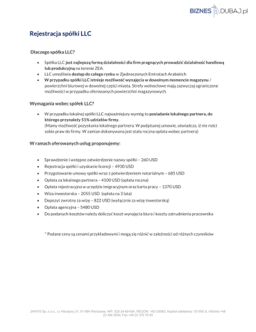 Rejestracja spółki LLC Dlaczego spółka LLC? Spółka LLC jest najlepszą formą działalności dla firm pragnących prowadzić działalność handlową lub produkcyjną na terenie ZEA. LLC umożliwia dostęp do całego rynku w Zjednoczonych Emiratach Arabskich W przypadku spółki LLC istnieje możliwość wynajęcia w dowolnym momencie magazynu / powierzchni biurowej w dowolnej części miasta. Strefy wolnocłowe mają zazwyczaj ograniczone możliwości w przypadku oferowanych powierzchni magazynowych. Wymagania wobec spółek LLC? W przypadku lokalnej spółki LLC najważniejszy wymóg to posiadanie lokalnego partnera, do którego przynależy 51% udziałów firmy. (Mamy możliwość pozyskania lokalnego partnera. W podpisanej umowie, oświadcza, iż nie rości sobie praw do firmy. W zamian dokonywana jest stała roczna opłata wobec partnera) W ramach oferowanych usług proponujemy: Sprawdzenie i wstępne zatwierdzenie nazwy spółki – 260 USD Rejestracja spółki i uzyskanie licencji – 4930 USD Przygotowanie umowy spółki wraz z potwierdzeniem notarialnym – 685 USD Opłata za lokalnego partnera – 4100 USD (opłata roczna) Opłata rejestracyjna w urzędzie imigracyjnym oraz karta pracy – 1370 USD Wiza inwestorska – 2055 USD (opłata na 3 lata) Depozyt zwrotny za wizę – 822 USD (wyłącznie za wizę inwestorską) Opłata agencyjna – 5480 USD Do podanych kosztów należy doliczyć koszt wynajęcia biura i koszty zatrudnienia pracownika * Podane ceny są cenami przykładowymi i mogą się różnić w zależności od różnych czynników 2WAYS Sp. z o.o., ul. Klaudyny 21; 01-684 Warszawa; NIP: 525-24-69-934, REGON: 142129583, Kapitał zakładowy: 50 000 zł, Infolinia +48 22 490 5000; Fax +48 22 379 78 45