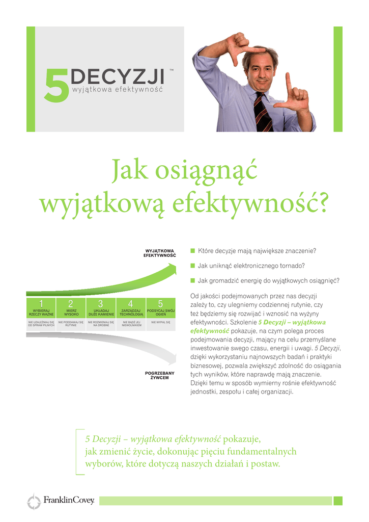 DECYZJI wyjątkowa efektywność Jak osiągnąć wyjątkową efektywność? WYJĄTKOWA EFEKTYWNOŚĆ K tóre decyzje mają największe znaczenie? J ak uniknąć elektronicznego tornado? J ak gromadzić energię do wyjątkowych osiągnięć? 1 2 3 4 5 WYBIERAJ RZECZY WAŻNE MIERZ WYSOKO UKŁADAJ DUŻE KAMIENIE ZARZĄDZAJ TECHNOLOGIĄ PODSYCAJ SWÓJ OGIEŃ NIE UZALEŻNIAJ SIĘ OD SPRAW PILNYCH NIE PODDAWAJ SIĘ RUTYNIE NIE ROZMIENIAJ SIĘ NA DROBNE NIE BĄDŹ JEJ NIEWOLNIKIEM NIE WYPAL SIĘ POGRZEBANY ŻYWCEM Od jakości podejmowanych przez nas decyzji zależy to, czy ulegniemy codziennej rutynie, czy też będziemy się rozwijać i wznosić na wyżyny efektywności. Szkolenie 5 Decyzji – wyjątkowa efektywność pokazuje, na czym polega proces podejmowania decyzji, mający na celu przemyślane inwestowanie swego czasu, energii i uwagi. 5 Decyzji, dzięki wykorzystaniu najnowszych badań i praktyki biznesowej, pozwala zwiększyć zdolność do osiągania tych wyników, które naprawdę mają znaczenie. Dzięki temu w sposób wymierny rośnie efektywność jednostki, zespołu i całej organizacji. 5 Decyzji – wyjątkowa efektywność pokazuje, jak zmienić życie, dokonując pięciu fundamentalnych wyborów, które dotyczą naszych działań i postaw. 1 2 3 4 5 WYBIERAJ RZECZY WAŻNE Nie uzależniaj się od spraw pilnych MIERZ WYSOKO Nie poddawaj się rutynie UKŁADAJ DUŻE KAMIENIE Nie rozmieniaj się na drobne ZARZĄDZAJ TECHNOLOGIĄ Nie bądź jej niewolnikiem PODSYCAJ SWÓJ OGIEŃ Nie wypal się W dzisiejszym świecie ludzie grzęzną w nawale e-maili, przytłoczeni oczekiwaniami, próbując zrobić coraz więcej, w coraz krótszym czasie. Uczestnicy 5 Decyzji dowiedzą się jak odsiać sprawy najwyższej wagi od tego, co ich rozprasza, aby skupić się na rzeczach naprawdę ważnych. Niemal każdy z nas chciałby dokonać czegoś wyjątkowego, jednak konflikt priorytetów często utrudnia uzyskanie nieprzeciętnych rezultatów. Uczestnicy 5 Decyzji definiują ponownie swoje role, wyznaczając ambitne cele w najważniejszych dla siebie obszarach. Zbyt duża presja codziennych zadań i obowiązków może sprawić, że poczujemy się bezsilni i nie będziemy panować nad tym, co robimy. Uczestnicy 5 Decyzji dowiadują się, w jaki sposób sprawować kontrolę nad swoim życiem. Dzięki umiejętnemu planowaniu i konsekwencji w realizacji zadań mają większe szanse, by osiągać znaczące wyniki. Elektroniczne tornado (e-maile, sms-y, powiadomienia na serwisach społecznościowych) zagraża efektywności bardziej niż cokolwiek przedtem. Uczestnicy 5 Decyzji wykorzystują technologię jako dźwignię. Dają odpór rozpraszającej ich technologicznej nawałnicy, optymalizując aplikacje (takie jak Microsoft® Outlook®), aby zwiększyć swoją efektywność. Presja wywierana przez współczesne środowisko pracy sprawia, że liczba ludzi, którzy ulegają wypaleniu zawodowemu, jest alarmująco wysoka. Kierując się „5 źródłami energii™, uczestnicy szkolenia korzystają z najnowszej wiedzy naukowej na temat funkcjonowania mózgu, aby systematycznie odnawiać swoją energię psychiczną i fizyczną. MATERIAŁY SZKOLENIOWE “Extraordinary productivity is not about time management, it’s about managing your decisions, attention, and energy.” —Leigh Stevens DECYZJI DECYZJI wyjątkowa efektywność wyjątkowa efektywność HIGIENA MÓZGU DECYZJI DECYZJI wyjątkowa efektywność KLUCZOWE CELE MATERIAŁY UCZESTNIKA DECYZJI wyjątkowa efektywność wyjątkowa efektywność BIUROWA NIRWANA MONOGRAFIA DECYZJI DECYZJI DECYZJI DECYZJI 4G 9:41 AM 5 CHOICES w y j ą t k o w a e f ewkytjyąwt knoow ś ća e f e wkytjyąw t knoowś a ć efektywność wyjątkowa efektywność PLANNER Portal the5choices.com Dostęp do testów samooceny oraz instrukcji, jak dostosować zawartość szkolenia do smartfonów, tabletów i aplikacji internetowych, takich jak Google Apps®. Podręcznik uczestnika Trzy dodatkowe moduły (krótkie filmy szkoleniowe) Fr an kli MATERIAŁY SZKOLENIOWE nC ov ey .A ll r igh ts r ese rved . Use re s t ric te ns d t o te r m s o f th e L i ce re e Ag em ent .F RA 11 04 59 Ve .6 © rs io n 1. 0 Become extraordinary BIUROWA HIGIENA KLUCZOWE NIRWANA CELE MÓZGU „Cele Kluczowe” Chris McChesney ekspert ds. skutecznej realizacji, FranklinCovey „Biurowa nirwana” Julie Morgenstern ekspert ds. efektywności osobistej autorka bestsellerów The New York Times Aplikacja 5 Decyzji (już wkrótce) Noś swoją produktywność w kieszeni 5 Decyzji – monografia Materiały szkoleniowe na DVD Notes „Higiena mózgu” dr Daniel Amen badacz układu nerwowego autor bestsellerów The New York Times Proces kształcenia liderów w firmie warto zacząć od szkolenia „7 Nawyków skutecznego działania”, które pomaga rozwijać kompetencje osobiste. Kolejnym krokiem w kształceniu liderów jest rozwinięcie ich umiejętności menedżerskich podczas szkolenia „W roli szefa”. Niezastąpione w podnoszeniu jakości przywództwa wśród doświadczonych menedżerów jest szkolenie „Przywództwo XXI wieku” – esencja najlepszych praktyk wybitnych liderów, owoc wieloletnich badań, prowadzonych przez Stephena Coveya i jego współpracowników. Więcej informacji na temat rozwiązań rozwojowych FranklinCovey można znaleźć na www.franklincovey.pl lub u naszych konsultantów: tel. (+48) 22 824 11 28, e-mail: [email protected]