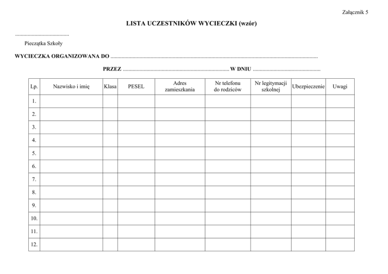 Załącznik 5 LISTA UCZESTNIKÓW WYCIECZKI (wzór) ....................................... Pieczątka Szkoły WYCIECZKA ORGANIZOWANA DO ...................................................................................................................................................... PRZEZ ............................................................................. W DNIU ................................................. Lp. 1. 2. 3. 4. 5. 6. 7. 8. 9. 10. 11. 12. Nazwisko i imię Klasa PESEL Adres zamieszkania Nr telefonu do rodziców Nr legitymacji Ubezpieczenie szkolnej Uwagi
