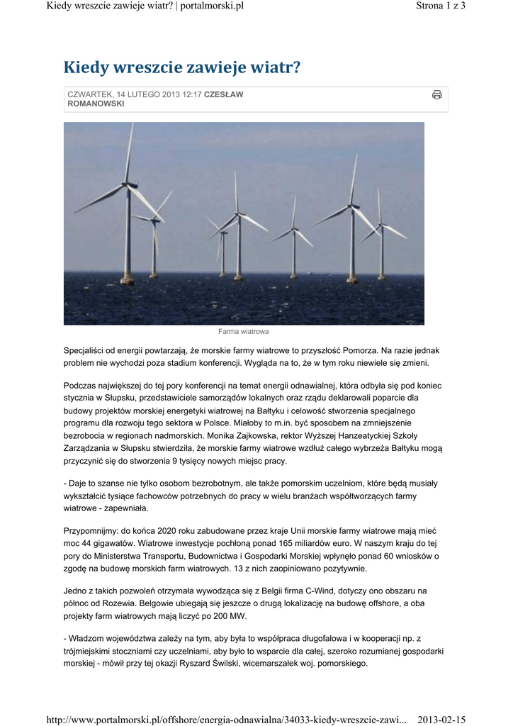 Kiedy wreszcie zawieje wiatr? | portalmorski.pl Strona 1 z 3 Kiedywreszciezawiejewiatr? CZWARTEK, 14 LUTEGO 2013 12:17 CZESŁAW ROMANOWSKI Farma wiatrowa Specjaliści od energii powtarzają, że morskie farmy wiatrowe to przyszłość Pomorza. Na razie jednak problem nie wychodzi poza stadium konferencji. Wygląda na to, że w tym roku niewiele się zmieni. Podczas największej do tej pory konferencji na temat energii odnawialnej, która odbyła się pod koniec stycznia w Słupsku, przedstawiciele samorządów lokalnych oraz rządu deklarowali poparcie dla budowy projektów morskiej energetyki wiatrowej na Bałtyku i celowość stworzenia specjalnego programu dla rozwoju tego sektora w Polsce. Miałoby to m.in. być sposobem na zmniejszenie bezrobocia w regionach nadmorskich. Monika Zajkowska, rektor Wyższej Hanzeatyckiej Szkoły Zarządzania w Słupsku stwierdziła, że morskie farmy wiatrowe wzdłuż całego wybrzeża Bałtyku mogą przyczynić się do stworzenia 9 tysięcy nowych miejsc pracy. - Daje to szanse nie tylko osobom bezrobotnym, ale także pomorskim uczelniom, które będą musiały wykształcić tysiące fachowców potrzebnych do pracy w wielu branżach współtworzących farmy wiatrowe - zapewniała. Przypomnijmy: do końca 2020 roku zabudowane przez kraje Unii morskie farmy wiatrowe mają mieć moc 44 gigawatów. Wiatrowe inwestycje pochłoną ponad 165 miliardów euro. W naszym kraju do tej pory do Ministerstwa Transportu, Budownictwa i Gospodarki Morskiej wpłynęło ponad 60 wniosków o zgodę na budowę morskich farm wiatrowych. 13 z nich zaopiniowano pozytywnie. Jedno z takich pozwoleń otrzymała wywodząca się z Belgii firma C-Wind, dotyczy ono obszaru na północ od Rozewia. Belgowie ubiegają się jeszcze o drugą lokalizację na budowę offshore, a oba projekty farm wiatrowych mają liczyć po 200 MW. - Władzom województwa zależy na tym, aby była to współpraca długofalowa i w kooperacji np. z trójmiejskimi stoczniami czy uczelniami, aby było to wsparcie dla całej, szeroko rozumianej gospodarki morskiej - mówił przy tej okazji Ryszard Świlski, wicemarszałek woj. pomorskiego. http://www.portalmorski.pl/offshore/energia-odnawialna/34033-kiedy-wreszcie-zawi... 2013-02-15 Kiedy wreszcie zawieje wiatr? | portalmorski.pl Strona 2 z 3 Dochodowe Biogazownie www.bioconstruct.com Bezpłatne analizy rentowności! Indywidualne oferty dla Państwa. Ocenia się, że w ciągu najbliższych lat inwestorzy planują zbudować na tak zwanej „ławicy słupskiej” ponad dwa tysiące wiatraków. Wartość morskich inwestycji to około 90 miliardów złotych. Na wspomnianej słupskiej konferencji ustalono, że największą barierą dla inwestorów jest nasza administracja. Zgodę na budowę farmy wiatrowej musi bowiem wydać aż sześciu ministrów. Oprócz środowiska, gospodarki czy rolnictwa, również ministrowie obrony i kultury. - Myślę, że poważni inwestorzy patrząc na mapę Bałtyku wiedzą, jakie lokalizacje nie zakłócą ich inwestycji - mówił Stanisław Gawłowski, wiceminister środowiska. - Gdy ktoś będzie chciał budować farmę na terenie Natura 2000, musi się liczyć z problemami. Na podobne kłopoty napotkają inwestorzy, którzy będą chcieli umiejscowić swoją inwestycję na przykład w pobliżu historycznego wraku. Myślę jednak, że Bałtyk jest na tyle duży, że nie będzie problemu ze znalezieniem odpowiednich lokalizacji. Owe kłopoty wcale nie muszą być jednak tak nieistotne, jak twierdzi minister Gawłowski. Przed kilkoma dniami Europejskie Stowarzyszenie Energetyki Wiatrowej opublikowało raport opisujący rynki energii wiatrowej w Europie Środkowo-Wschodniej, wśród których Polska jest obecnie największym producentem. Raport ów to prawdopodobnie najważniejszy dokument w ostatnich miesiącach, opisujący perspektywy polskiego rynku energii wiatrowej, który dotrze do zagranicznych inwestorów zainteresowanych budową farm wiatrowych i poszukujących w tym celu najlepszych rynków. Dlatego jego wnioski mogą mieć duże znaczenie dla rozwoju polskiego rynku energii wiatrowej. EWEA opisuje Polskę jako największy rynek energii wiatrowej wśród nowych państw członkowskich Unii Europejskiej, posiadający wciąż znaczący potencjał rozwoju, ale dostrzega także problemy, z którymi zmaga się obecnie polski sektor. Organizacja podkreśla, że deweloperzy chcący budować w naszym kraju farmy wiatrowe muszą brać pod uwagę fakt, że potencjał najlepszych lokalizacji jest w Polsce mocno ograniczony ze względu na kwestie środowiskowe i funkcjonowanie obszarów chronionych, takich jak Natura 2000, co skutkuje blokowaniem wielu projektów na etapie decyzji środowiskowych. Jak zaznacza EWEA, obszary Natura 2000 zajmują ok. 32 proc. Polski, ich występowanie pokrywa się z najlepszymi lokalizacjami pod farmy wiatrowe, a budowa elektrowni wiatrowych na terenach Natury 2000 jest "trudna, o ile w ogóle niemożliwa". Z kolei na niedawnej konferencji Forum Związku Pracodawców Polskich dotyczącej odnawialnych źródeł energii (OZE) Jarosław Pole, prezes Polskiego Stowarzyszenia Energetyki Wiatrowej (PSEW) wprost mówił, że na rynku OZE dzieje się źle m.in. z powodu niepewności co do kształtu przyszłego systemu wsparcia. - Rynek OZE mocno spowolnił - mówił prezes Pole. - Nie trzeba jednak dużo, aby znów zaczął się szybko rozwijać. Wystarczy czytelny sygnał od rządu, że poważnie traktuje nasze problemy i ma strategiczną wizję dot. rozwoju OZE. Krzysztof Prasałek, poprzedni prezes PSEW, już w listopadzie zeszłego roku w wywiadzie dla portalu energetyka.wnp.pl wieszczył, że ustawa o OZE, która uregulowałaby wszelkie sporne kwestie i dała zielone światło inwestycjom, uchwalona będzie dopiero pod koniec tego roku, w związku z czym do tego czasu wszelkie prace zostaną wstrzymane. - Będzie zastój - mówił prezes Prasałek. - Już dziś widać bardzo duże spowolnienie w przygotowaniach 