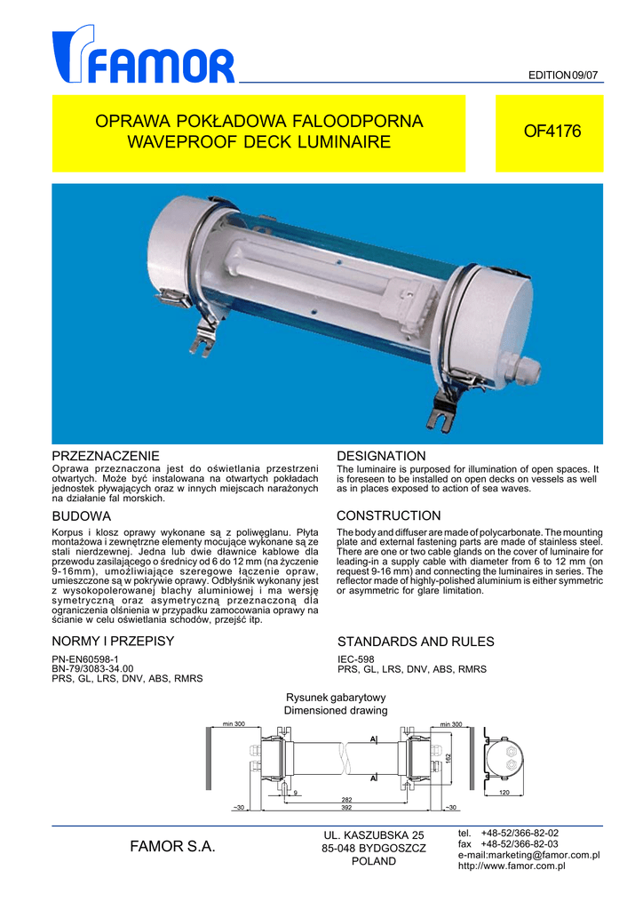 EDITION 09/07 OPRAWA POK£ADOWA FALOODPORNA WAVEPROOF DECK LUMINAIRE PRZEZNACZENIE OF4176 DESIGNATION Oprawa przeznaczona jest do oœwietlania przestrzeni otwartych. Mo¿e byæ instalowana na otwartych pok³adach jednostek p³ywaj¹cych oraz w innych miejscach nara¿onych na dzia³anie fal morskich. The luminaire is purposed for illumination of open spaces. It is foreseen to be installed on open decks on vessels as well as in places exposed to action of sea waves. BUDOWA CONSTRUCTION Korpus i klosz oprawy wykonane s¹ z poliwêglanu. P³yta monta¿owa i zewnêtrzne elementy mocuj¹ce wykonane s¹ ze stali nierdzewnej. Jedna lub dwie d³awnice kablowe dla przewodu zasilaj¹cego o œrednicy od 6 do 12 mm (na ¿yczenie 9-16mm), umo¿liwiaj¹ce szeregowe ³¹czenie opraw, umieszczone s¹ w pokrywie oprawy. Odb³yœnik wykonany jest z wysokopolerowanej blachy aluminiowej i ma wersjê symetryczn¹ oraz asymetryczn¹ przeznaczon¹ dla ograniczenia olœnienia w przypadku zamocowania oprawy na œcianie w celu oœwietlania schodów, przejœæ itp. The body and diffuser are made of polycarbonate. The mounting plate and external fastening parts are made of stainless steel. There are one or two cable glands on the cover of luminaire for leading-in a supply cable with diameter from 6 to 12 mm (on request 9-16 mm) and connecting the luminaires in series. The reflector made of highly-polished aluminium is either symmetric or asymmetric for glare limitation. NORMY I PRZEPISY STANDARDS AND RULES PN-EN60598-1 BN-79/3083-34.00 PRS, GL, LRS, DNV, ABS, RMRS IEC-598 PRS, GL, LRS, DNV, ABS, RMRS Rysunek gabarytowy Dimensioned drawing FAMOR S.A. UL. KASZUBSKA 25 85-048 BYDGOSZCZ POLAND tel. +48-52/366-82-02 fax +48-52/366-82-03 e-mail:[email protected] http://www.famor.com.pl OF4176 Wykres rozsy³u œwiat³a Light distribution diagram cd/klm cos φ = 0,9 Typ oprawy Pod³¹czenie Pod³¹czenie z prawej z lewej Moc Ÿród³a œwiat³a IP66/IP67 Rodzaj trzonka OF4176-01 OF4176-51 230V 50Hz OF4176-02 OF4176-52 OF4176-03 OF4176-53 220V 60Hz OF4176-04 OF4176-54 OF4176-09 OF4176-59 230V 50Hz OF4176-10 OF4176-60 OF4176-11 OF4176-61 220V 60Hz OF4176-12 OF4176-62 OF4176-17 OF4176-67 230V 50Hz OF4176-18 OF4176-68 OF4176-19 OF4176-69 OF4176-20 OF4176-70 OF4176-25 OF4176-75 Napiêcie zasilaj¹ce 220V 60Hz 18W Odb³yœnik 0° symetryczny symmetric OF4176-26 OF4176-76 OF4176-27 OF4176-77 OF4176-28 OF4176-78 OF4176-33 OF4176-34 OF4176-35 OF4176-36 OF4176-37 OF4176-38 OF4176-38 OF4176-40 Cables from Cables from Light source Lampholder right left power type Fitting type 220V 60Hz 230V 50Hz 220V 60Hz 230V 50Hz 220V 60Hz Supply voltage Dostawa bez Ÿróde³ œwiat³a / Lamps not included D³awnice M20 na ¿yczenie / M20 cable glands on request * - po jednej d³awnicy z ka¿dej strony / 1 cable gland on each side 40° 0° 40° 1xPg16 0° asymetryczny asymmetric 40° 0° 40° 0° symetryczny symmetric 40° 0° 40° 2G11 230V 50Hz Kierunek Sprawnoœæ Masa D³awnice emisji œwiat³a œwietlna (kg) 0° asymetryczny asymmetric 0,68 2xPg16 2‚0 40° 0° 40° 0° symetryczny symmetric 40° 0° 40° 0° asymetryczny asymmetric 2xPg16* 40° 0° 40° Reflector Direction of Light output Glands light emission ratio Mass (kg)