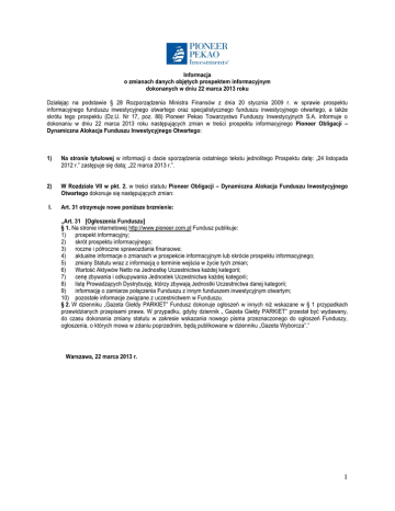 Informacja o zmianach danych objętych prospektem informacyjnym dokonanych w dniu 22 marca 2013 roku Działając na podstawie § 28 Rozporządzenia Ministra Finansów z dnia 20 stycznia 2009 r. w sprawie prospektu informacyjnego funduszu inwestycyjnego otwartego oraz specjalistycznego funduszu inwestycyjnego otwartego, a także skrótu tego prospektu (Dz.U. Nr 17, poz. 88) Pioneer Pekao Towarzystwo Funduszy Inwestycyjnych S.A. informuje o dokonaniu w dniu 22 marca 2013 roku następujących zmian w treści prospektu informacyjnego Pioneer Obligacji – Dynamiczna Alokacja Funduszu Inwestycyjnego Otwartego: 1) Na stronie tytułowej w informacji o dacie sporządzenia ostatniego tekstu jednolitego Prospektu datę: „24 listopada 2012 r.” zastępuje się datą: „22 marca 2013 r.”. 2) W Rozdziale VII w pkt. 2. w treści statutu Pioneer Obligacji – Dynamiczna Alokacja Funduszu Inwestycyjnego Otwartego dokonuje się następujących zmian: I. Art. 31 otrzymuje nowe poniższe brzmienie: „Art. 31 [Ogłoszenia Funduszu] § 1. Na stronie internetowej http://www.pioneer.com.pl Fundusz publikuje: 1) prospekt informacyjny; 2) skrót prospektu informacyjnego; 3) roczne i półroczne sprawozdania finansowe; 4) aktualne informacje o zmianach w prospekcie informacyjnym lub skrócie prospektu informacyjnego; 5) zmiany Statutu wraz z informacją o terminie wejścia w życie tych zmian; 6) Wartość Aktywów Netto na Jednostkę Uczestnictwa każdej kategorii; 7) cenę zbywania i odkupywania Jednostek Uczestnictwa każdej kategorii; 8) listę Prowadzących Dystrybucję, którzy zbywają Jednostki Uczestnictwa danej kategorii; 9) informację o zamiarze połączenia Funduszu z innym funduszem inwestycyjnym otwartym; 10) pozostałe informacje związane z uczestnictwem w Funduszu. § 2. W dzienniku „Gazeta Giełdy PARKIET” Fundusz dokonuje ogłoszeń w innych niż wskazane w § 1 przypadkach przewidzianych przepisami prawa. W przypadku, gdyby dziennik „ Gazeta Giełdy PARKIET” przestał być wydawany, do czasu dokonania zmiany statutu w zakresie wskazania nowego pisma przeznaczonego do ogłoszeń Funduszy, ogłoszenia, o których mowa w zdaniu poprzednim, będą publikowane w dzienniku „Gazeta Wyborcza”.” Warszawa, 22 marca 2013 r. 1