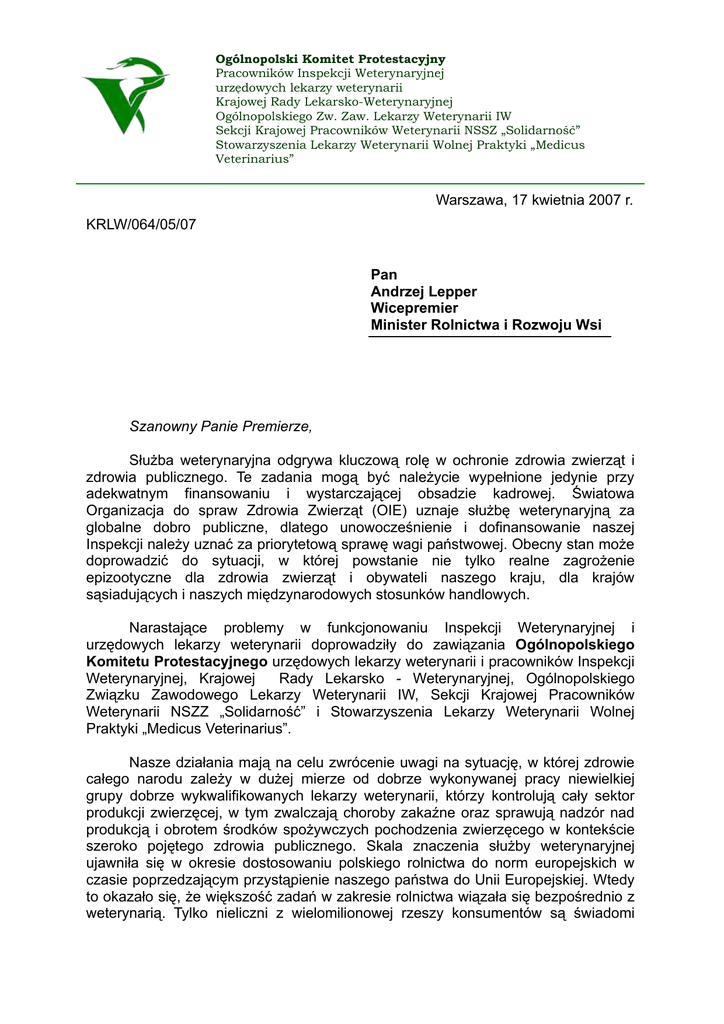 Ogólnopolski Komitet Protestacyjny Pracowników Inspekcji Weterynaryjnej urzędowych lekarzy weterynarii Krajowej Rady Lekarsko-Weterynaryjnej Ogólnopolskiego Zw. Zaw. Lekarzy Weterynarii IW Sekcji Krajowej Pracowników Weterynarii NSSZ „Solidarność” Stowarzyszenia Lekarzy Weterynarii Wolnej Praktyki „Medicus Veterinarius” Warszawa, 17 kwietnia 2007 r. KRLW/064/05/07 Pan Andrzej Lepper Wicepremier Minister Rolnictwa i Rozwoju Wsi Szanowny Panie Premierze, Służba weterynaryjna odgrywa kluczową rolę w ochronie zdrowia zwierząt i zdrowia publicznego. Te zadania mogą być należycie wypełnione jedynie przy adekwatnym finansowaniu i wystarczającej obsadzie kadrowej. Światowa Organizacja do spraw Zdrowia Zwierząt (OIE) uznaje służbę weterynaryjną za globalne dobro publiczne, dlatego unowocześnienie i dofinansowanie naszej Inspekcji należy uznać za priorytetową sprawę wagi państwowej. Obecny stan może doprowadzić do sytuacji, w której powstanie nie tylko realne zagrożenie epizootyczne dla zdrowia zwierząt i obywateli naszego kraju, dla krajów sąsiadujących i naszych międzynarodowych stosunków handlowych. Narastające problemy w funkcjonowaniu Inspekcji Weterynaryjnej i urzędowych lekarzy weterynarii doprowadziły do zawiązania Ogólnopolskiego Komitetu Protestacyjnego urzędowych lekarzy weterynarii i pracowników Inspekcji Weterynaryjnej, Krajowej Rady Lekarsko - Weterynaryjnej, Ogólnopolskiego Związku Zawodowego Lekarzy Weterynarii IW, Sekcji Krajowej Pracowników Weterynarii NSZZ „Solidarność” i Stowarzyszenia Lekarzy Weterynarii Wolnej Praktyki „Medicus Veterinarius”. Nasze działania mają na celu zwrócenie uwagi na sytuację, w której zdrowie całego narodu zależy w dużej mierze od dobrze wykonywanej pracy niewielkiej grupy dobrze wykwalifikowanych lekarzy weterynarii, którzy kontrolują cały sektor produkcji zwierzęcej, w tym zwalczają choroby zakaźne oraz sprawują nadzór nad produkcją i obrotem środków spożywczych pochodzenia zwierzęcego w kontekście szeroko pojętego zdrowia publicznego. Skala znaczenia służby weterynaryjnej ujawniła się w okresie dostosowaniu polskiego rolnictwa do norm europejskich w czasie poprzedzającym przystąpienie naszego państwa do Unii Europejskiej. Wtedy to okazało się, że większość zadań w zakresie rolnictwa wiązała się bezpośrednio z weterynarią. Tylko nieliczni z wielomilionowej rzeszy konsumentów są świadomi tego, iż każda szklanka mleka, plasterek wędliny, tabletka leku czy kosmetyk są bezpieczne dzięki działaniom służby weterynaryjnej. Na przestrzeni ostatnich lat kolejne rządy obarczały Inspekcję Weterynaryjną w Polsce nowymi zadaniami w zakresie sprawowanego nadzoru, nie przeznaczając na ich realizację stosownych środków. To doprowadziło do zmniejszenia zatrudnienia, dekapitalizacji substancji materialnej jednostek organizacyjnych i zmniejszenia efektywności jej działania w nowych warunkach. Zwracamy też uwagę, że usytuowanie Inspekcji Weterynaryjnej w Ministerstwie Rolnictwa i Rozwoju Wsi stwarza konflikt interesów wynikający z sytuacji, w której organy Inspekcji Weterynaryjnej sprawujące nadzór i kontrolę podlegają resortowi reprezentującemu interesy kontrolowanych producentów. Projekty utworzenia Państwowej Inspekcji Bezpieczeństwa Żywności powstające w Ministerstwie Rolnictwa i Rozwoju Wsi prowadzą do umniejszenia znaczenia Inspekcji Weterynaryjnej, co może mieć bardzo negatywne skutki dla międzynarodowego obrotu zwierzętami i artykułami pochodzenia zwierzęcego. Nasze postulaty spotkały się z masowym poparciem zarówno pracowników Inspekcji Weterynaryjnej jak i lekarzy weterynarii i ich ustawowych reprezentantów to jest Zjazdów Okręgowych i Okręgowych Izb Lekarsko-Weterynaryjnych. Szanowny Panie Premierze, My, lekarze weterynarii będący pracownikami administracji rządowej – w trosce o prawidłową realizację powierzonych nam zadań i godne życie – prosimy o przyjęcie naszej delegacji w dniu 17.04.2007r. w godzinach 14:00 – 15:00, kiedy to będziemy manifestować pod Ministerstwem Rolnictwa i Rozwoju Wsi celem wręczenia Panu Marszałkowi naszych postulatów. Równocześnie informujemy, że nasza manifestacja nie jest wymierzona przeciwko komukolwiek, natomiast jest to działanie dla dobra Państwa i jego obywateli. Z poważaniem, W imieniu Ogólnopolskiego Komitetu Protestacyjnego Pracowników Inspekcji Weterynaryjnej i Urzędowych Lekarzy Weterynarii Dr Tadeusz Jakubowski Prezes Krajowej Rady Lekarsko-Weterynaryjnej al. Przyjaciół 1 tel./fax: (+48 22) 628 93 35, tel.:(+48 22) 622 09 55 00-565 Warszawa e-mail: [email protected] • www.vetpol.org.pl