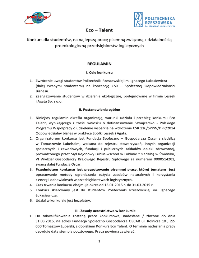 Eco – Talent Konkurs dla studentów, na najlepszą pracę pisemną związaną z działalnością proeokologiczną przedsiębiorstw logistycznych REGULAMIN I. Cele konkursu 1. Zwrócenie uwagi studentów Politechniki Rzeszowskiej im. Ignacego Łukasiewicza (dalej zwanymi studentami) na koncepcję CSR – Społecznej Odpowiedzialności Biznesu. 2. Zaangażowanie studentów w działania ekologiczne, podejmowane w firmie Leszek i Agata Sp. z o.o. II. Postanowienia ogólne 1. Niniejszy regulamin określa organizację, warunki udziału i przebieg konkursu Eco Talent, wynikającego z treści wniosku o dofinansowanie Szwajcarsko - Polskiego Programu Współpracy o udzielenie wsparcia na wdrożenie CSR 116/SPPW/DPP/2014 Odpowiedzialny biznes w praktyce Spółki Leszek i Agata. 2. Organizatorem konkursu jest Fundacja Społeczno – Gospodarcza Oscar z siedzibą w Tomaszowie Lubelskim, wpisana do rejestru stowarzyszeń, innych organizacji społecznych i zawodowych, fundacji i publicznych zakładów opieki zdrowotnej, prowadzonego przez Sąd Rejonowy Lublin-wschód w Lublinie z siedzibą w Świdniku, VI Wydział Gospodarczy Krajowego Rejestru Sądowego za numerem 0000514201, zwaną dalej Fundacją Oscar. 3. Przedmiotem konkursu jest przygotowanie pisemnej pracy, której tematem jest opracowanie metody ograniczania zużycia zasobów naturalnych i korzystania z energii odnawialnych w przedsiębiorstwach logistycznych. 4. Czas trwania konkursu obejmuje okres od 13.01.2015 r. do 31.03.2015 r. 5. Konkurs skierowany jest do studentów Politechniki Rzeszowskiej im. Ignacego Łukasiewicza. 6. Udział w konkursie jest bezpłatny. III. Zasady uczestnictwa w konkursie 1. Do zakwalifikowania zostaną prace konkursowe, nadesłane / złożone do dnia 31.03.2015, na adres Fundacja Społeczno Gospodarcza OSCAR ul. Rolnicza 10 , 22600 Tomaszów Lubelski, z dopiskiem Konkurs Eco Talent. O terminie nadesłania pracy decyduje data stempla pocztowego. Praca powinna zawierać: 1 Imię i Nazwisko autora adres zamieszkania adres e-mail telefon kontaktowy Tytuł: Opracowanie metody ograniczania zużycia zasobów naturalnych i korzystania z energii odnawialnych w przedsiębiorstwach logistycznych. 2. Pracę konkursową powinien zgłosić autor pracy. 3. Za pracę konkursową zostanie uznana praca, dotycząca w/w tematyki konkursu, która spełnia poniższe kryteria: została napisana w języku polskim, rodzaj czcionki: Times New Roman lub Arial rozmiar czcionki: 12 1,5 odstępu między akapitami objętość pracy 5-10 stron formatu A4 4. Wraz z praca konkursową na w/w adres powinny zostać wysłane następujące dokumenty: zgoda autora na przetwarzanie i publikację danych osobowych – załącznik nr 1 oświadczenie autora o samodzielnym napisaniu pracy – załącznik nr 2 zapis pracy w formie elektronicznej (płyta CD, format doc. lub pdf.) 5. Zgłoszenie pracy do konkursu Eco Talent jest jednoznaczne z akceptacja niniejszego regulaminu. 6. Uczestnicy, którzy nie spełnią któregokolwiek z wymogów określonych w niniejszym Regulaminie lub podadzą nieprawdziwe informacje, zostaną wykluczeni z udziału w Konkursie. IV. Komisja oceniająca 1. Nadesłane terminowo prace, spełniające kryteria formalne, zostaną ocenione przez Komisję konkursową powołaną przez Prezesa Zarządu Fundacji OSCAR , w składzie od 2 osób do 5 na posiedzeniu, które odbędzie się w terminie do 30 dni od zakończenia naboru prac. 2. Prace konkursowe będą oceniane przez Komisje pod kątem zawartości merytorycznej, oryginalności, spójności oraz użytej argumentacji. 3. Spośród nadesłanych prac, Komisja wybiera laureatów konkursu, w tym jednego zwycięzcę. 4. Wyniki konkursu zostaną ogłoszone do 7 dni od dnia posiedzenia Komisji konkursowej, na stronie Organizatora www.grupaoscar.pl w zakładce Fundacja Społeczno – Gospodarcza OSCAR, w podzakładce Nasze projekty. 2 IV. Nagrody 1. Organizator przyznaje zwycięzcy roczne stypendium (9 m-cy) w wysokości 100 zł. 2. Wszyscy laureaci otrzymają pisemne wyróżnienie oraz gadżety. 3. Wszyscy uczestnicy konkursu otrzymają pisemne zaświadczenie o udziale. IV. Informacje dodatkowe 1. W sprawach nieobjętych niniejszym regulaminem, organizator zastrzega sobie prawo do zmiany lub doprecyzowania postanowień regulaminu. W takim przypadku informacja o zmianach zostanie opublikowana w taki sam sposób, w jaki był ogłaszany pierwotny regulamin. 2. Przystępując do konkursu, uczestnik zobowiązuje się, że w razie otrzymania nagrody, nieodpłatnie udzieli Organizatorowi zgody na opublikowanie swego wizerunku oraz danych osobowych: imienia, nazwiska i miejsca zamieszkania, w środkach masowego przekazu wraz z informacją o konkursie i wygranej oraz informacji dot. nadesłanej pracy. 3. Przystępując do konkursu, uczestnik zobowiązuje się, że w razie otrzymania nagrody, nieodpłatnie udzieli Organizatorowi zgody na wykorzystanie pomysłów i rozwiązań zawartych w pracach konkursowych. 3