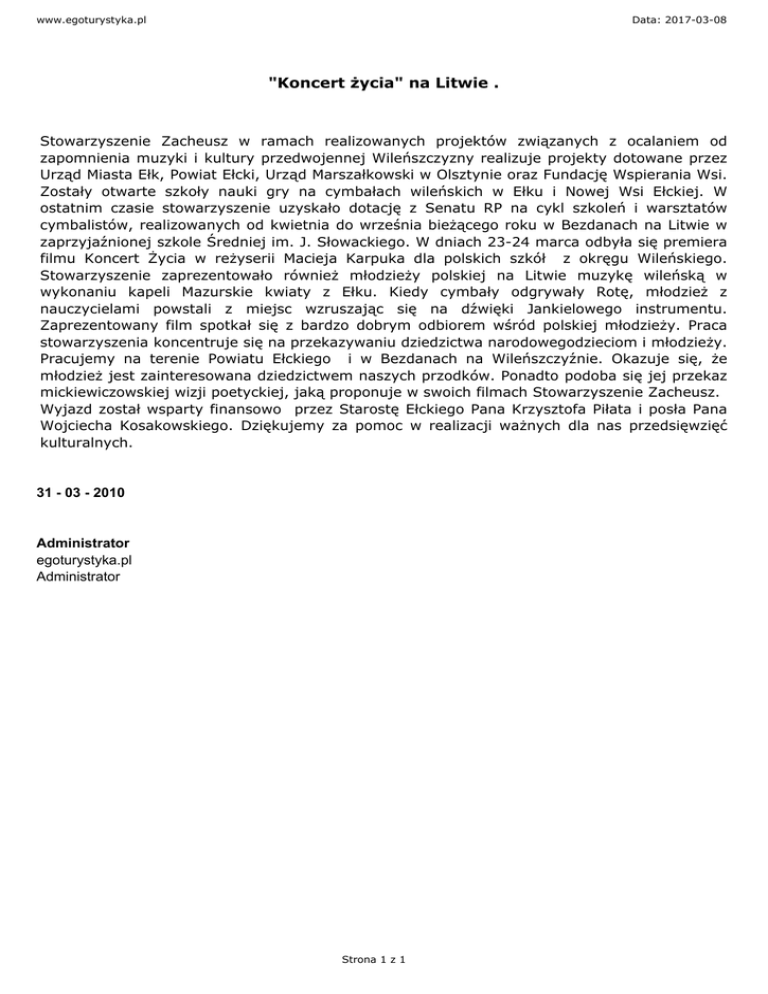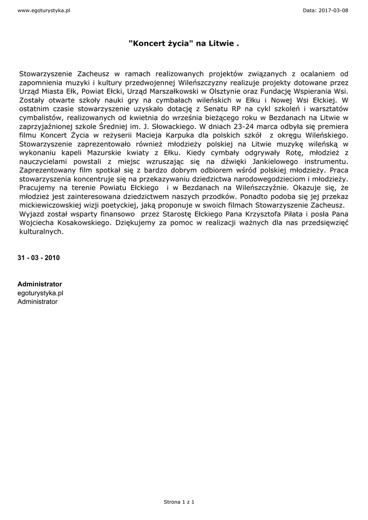 www.egoturystyka.pl Data: 2017-03-08 "Koncert życia" na Litwie . Stowarzyszenie Zacheusz w ramach realizowanych projektów związanych z ocalaniem od zapomnienia muzyki i kultury przedwojennej Wileńszczyzny realizuje projekty dotowane przez Urząd Miasta Ełk, Powiat Ełcki, Urząd Marszałkowski w Olsztynie oraz Fundację Wspierania Wsi. Zostały otwarte szkoły nauki gry na cymbałach wileńskich w Ełku i Nowej Wsi Ełckiej. W ostatnim czasie stowarzyszenie uzyskało dotację z Senatu RP na cykl szkoleń i warsztatów cymbalistów, realizowanych od kwietnia do września bieżącego roku w Bezdanach na Litwie w zaprzyjaźnionej szkole Średniej im. J. Słowackiego. W dniach 23-24 marca odbyła się premiera filmu Koncert Życia w reżyserii Macieja Karpuka dla polskich szkół z okręgu Wileńskiego. Stowarzyszenie zaprezentowało również młodzieży polskiej na Litwie muzykę wileńską w wykonaniu kapeli Mazurskie kwiaty z Ełku. Kiedy cymbały odgrywały Rotę, młodzież z nauczycielami powstali z miejsc wzruszając się na dźwięki Jankielowego instrumentu. Zaprezentowany film spotkał się z bardzo dobrym odbiorem wśród polskiej młodzieży. Praca stowarzyszenia koncentruje się na przekazywaniu dziedzictwa narodowegodzieciom i młodzieży. Pracujemy na terenie Powiatu Ełckiego i w Bezdanach na Wileńszczyźnie. Okazuje się, że młodzież jest zainteresowana dziedzictwem naszych przodków. Ponadto podoba się jej przekaz mickiewiczowskiej wizji poetyckiej, jaką proponuje w swoich filmach Stowarzyszenie Zacheusz. Wyjazd został wsparty finansowo przez Starostę Ełckiego Pana Krzysztofa Piłata i posła Pana Wojciecha Kosakowskiego. Dziękujemy za pomoc w realizacji ważnych dla nas przedsięwzięć kulturalnych. 31 - 03 - 2010 Administrator egoturystyka.pl Administrator Strona 1 z 1