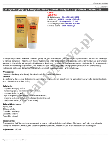 Informacje o produkcie Utworzono 08-03-2017 Żel wyszczuplający i antycellulitowy 200ml - Fanghi d'alga GUAM CREMA GEL Cena : 120,00 zł ov a. pl Nr katalogowy : 0041GELNA250M Producent : GUAM Lacote - Włochy Dostępność : Dostępność - 3 dni Stan magazynowy : bardzo wysoki Średnia ocena : brak recenzji yN Wzbogacony o imbir, werbenę i różową glinkę żel, jest naturalnym i niezawodnym sojusznikiem Koncentratu błotnego w walce z cellulitem i nadmiarem tkanki tłuszczowej. Imbir zwiększa mikrokrążenie poprzez stymulowanie aktywności głównych składników aktywnych, dzięki czemu tkanka ud i pośladków ulega widocznemu ujędrnieniu. Po wmasowaniu, produkt wchłania się natychmiast, nie pozostawiając smug. Aby odzyskać optymalną elastyczność skóry stosuj codziennie po Fanghi dalga GUAM Błotny koncentrat wyszczuplający i antycellulitowy. ut Wskazania: Polecany dla skóry: nierównej, źle ukrwionej, dotkniętej cellulitem. UWAGA Nie polecany dla: osób z delikatnymi naczynkami krwionośnymi podatnymi na uszkodzenia w wyniku działania ciepła oraz dla osób z wrażliwą skórą. B ea Działanie: - poprawa kondycji skóry, - wzrost napięcia, jędrności i elastyczności, - poprawa kolorytu skóry, - lepsze krążenie, odżywienie i dotlenienie tkanek, - znaczna redukcja cellulitu, wygładzenie nierówności, - miejscowa redukcja tkanki tłuszczowej. Składniki aktywne: Algi GUAM Różowa glinka Ekstrakt z werbeny Ekstrakt z imbiru Ekstrakt z lukrecji Stosowanie: Odpowiednią ilość kosmetyku wmasować w obszary skóry dotknięte cellulitem. Można używać jako uzupełnienia zabiegu z błotem GUAM lub jako codzienną terapię cellulitu, niezależną od innych stosowanych zabiegów. Pojemność: 250 ml. Wygenerowano w programie www.oscGold.com