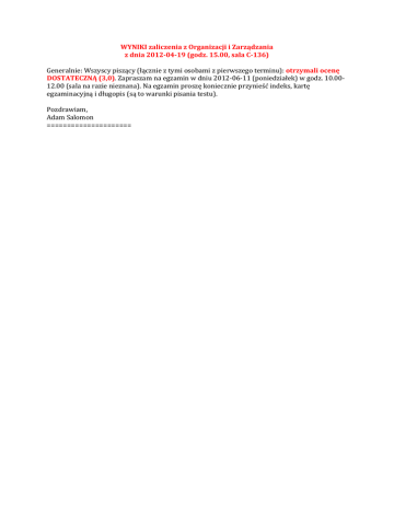 WYNIKI zaliczenia z Organizacji i Zarządzania z dnia 2012-04-19 (godz. 15.00, sala C-136) Generalnie: Wszyscy piszący (łącznie z tymi osobami z pierwszego terminu): otrzymali ocenę DOSTATECZNĄ (3,0). Zapraszam na egzamin w dniu 2012-06-11 (poniedziałek) w godz. 10.0012.00 (sala na razie nieznana). Na egzamin proszę koniecznie przynieść indeks, kartę egzaminacyjną i długopis (są to warunki pisania testu). Pozdrawiam, Adam Salomon =====================