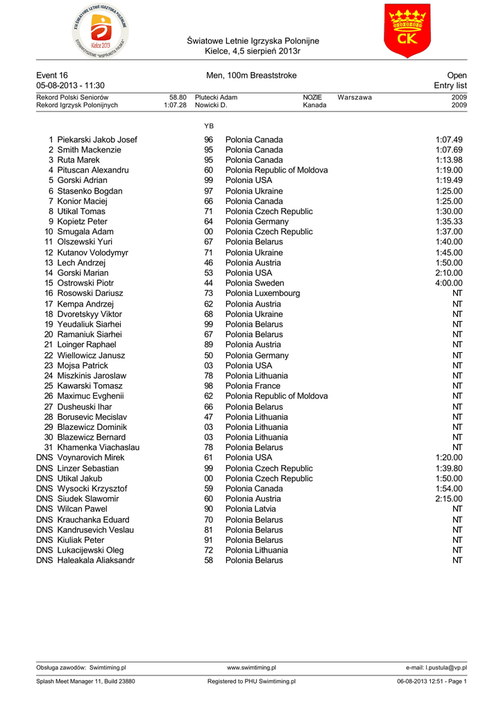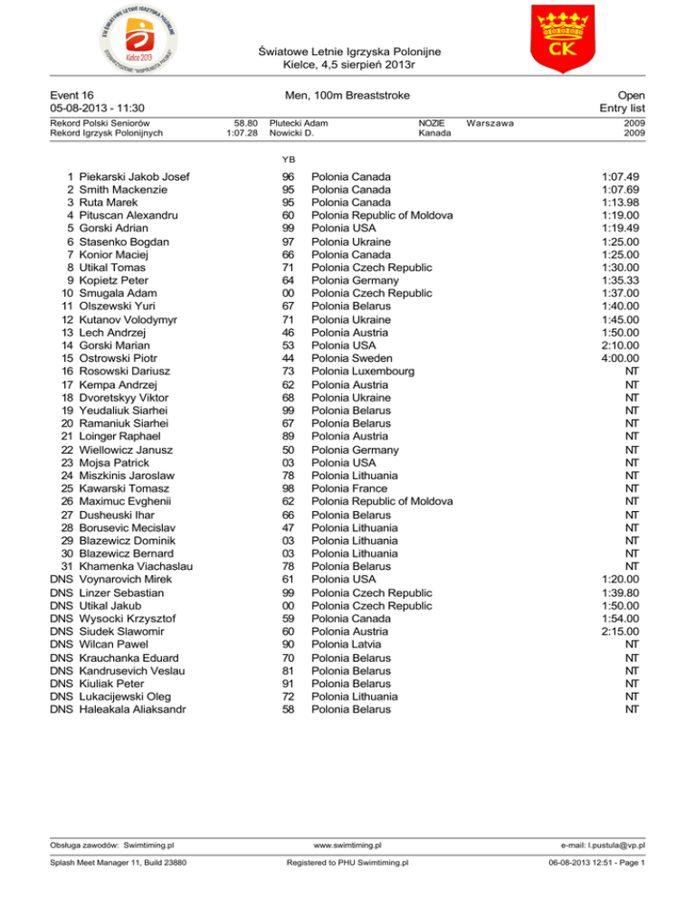 Światowe Letnie Igrzyska Polonijne Kielce, 4,5 sierpień 2013r Event 16 05-08-2013 - 11:30 Rekord Polski Seniorów Rekord Igrzysk Polonijnych Men, 100m Breaststroke 58.80 1:07.28 Plutecki Adam Nowicki D. Open Entry list NOZIE Kanada Warszawa 2009 2009 YB 1 2 3 4 5 6 7 8 9 10 11 12 13 14 15 16 17 18 19 20 21 22 23 24 25 26 27 28 29 30 31 DNS DNS DNS DNS DNS DNS DNS DNS DNS DNS DNS Piekarski Jakob Josef Smith Mackenzie Ruta Marek Pituscan Alexandru Gorski Adrian Stasenko Bogdan Konior Maciej Utikal Tomas Kopietz Peter Smugala Adam Olszewski Yuri Kutanov Volodymyr Lech Andrzej Gorski Marian Ostrowski Piotr Rosowski Dariusz Kempa Andrzej Dvoretskyy Viktor Yeudaliuk Siarhei Ramaniuk Siarhei Loinger Raphael Wiellowicz Janusz Mojsa Patrick Miszkinis Jaroslaw Kawarski Tomasz Maximuc Evghenii Dusheuski Ihar Borusevic Mecislav Blazewicz Dominik Blazewicz Bernard Khamenka Viachaslau Voynarovich Mirek Linzer Sebastian Utikal Jakub Wysocki Krzysztof Siudek Slawomir Wilcan Pawel Krauchanka Eduard Kandrusevich Veslau Kiuliak Peter Lukacijewski Oleg Haleakala Aliaksandr Obsługa zawodów: Swimtiming.pl Splash Meet Manager 11, Build 23880 96 95 95 60 99 97 66 71 64 00 67 71 46 53 44 73 62 68 99 67 89 50 03 78 98 62 66 47 03 03 78 61 99 00 59 60 90 70 81 91 72 58 Polonia Canada Polonia Canada Polonia Canada Polonia Republic of Moldova Polonia USA Polonia Ukraine Polonia Canada Polonia Czech Republic Polonia Germany Polonia Czech Republic Polonia Belarus Polonia Ukraine Polonia Austria Polonia USA Polonia Sweden Polonia Luxembourg Polonia Austria Polonia Ukraine Polonia Belarus Polonia Belarus Polonia Austria Polonia Germany Polonia USA Polonia Lithuania Polonia France Polonia Republic of Moldova Polonia Belarus Polonia Lithuania Polonia Lithuania Polonia Lithuania Polonia Belarus Polonia USA Polonia Czech Republic Polonia Czech Republic Polonia Canada Polonia Austria Polonia Latvia Polonia Belarus Polonia Belarus Polonia Belarus Polonia Lithuania Polonia Belarus www.swimtiming.pl Registered to PHU Swimtiming.pl 1:07.49 1:07.69 1:13.98 1:19.00 1:19.49 1:25.00 1:25.00 1:30.00 1:35.33 1:37.00 1:40.00 1:45.00 1:50.00 2:10.00 4:00.00 NT NT NT NT NT NT NT NT NT NT NT NT NT NT NT NT 1:20.00 1:39.80 1:50.00 1:54.00 2:15.00 NT NT NT NT NT NT e-mail: [email protected] 06-08-2013 12:51 - Page 1