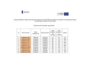 Zostaję przedsiębiorcą. Wsparcie dla osób zamierzających rozpocząć działalność gospodarczą z powiatów: brzeskiego, głubczyckiego, namysłowskiego, nyskiego oraz prudnickiego Rezerwowa lista rankingowa - grupa Kobiet Kwota wnioskowana Liczba Liczba punktów 1- punktów 2Kwota przyznana szy gi oceniający oceniający Lp. Numer wniosku 1 2 3 4 5 6 7 8 9 10 74/08072013/1538 39875,00 19/05072013/1358 40 000,00 39 875,00 40 000,00 63/08072013/1421 40 000,00 40 000,00 89/08072013/1702 40 000,00 40 000,00 35/06072013/1217 40 000,00 40 000,00 46/08072013/1146 40 000,00 53/08072013/1250 Średnia 40 000,00 93 94 92 95 90 86 97 95 94 90 90 93 95 94,5 93 92,5 90 89,5 40 000,00 40 000,00 80 82 81 20/05072013/1447 40 000,00 38450,00 50/08072013/1249 40 000,00 30312,00 83 75 75 78 79 76,5 34/06072013/1208 40 000,00 40 000,00 67 65 66