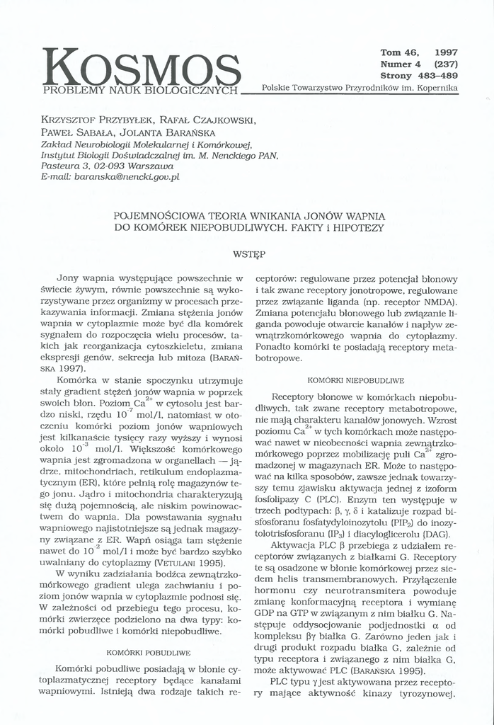 Tom 46, 1997 Numer 4 (237) Strony 483-489 K osm os PROBLEMY NAUK BIOLOGICZNYCH Polskie Towarzystwo Przyrodników im. Kopernika K r z y s z t o f P r z y b y t e k , R a f a ł C z a j k o w s k i, Pa w e ł Sa b a ł a , J o l a n t a B a r a ń s k a Zakład Neurobiologii Molekularnej i Komórkowej, Instytut Biologii Doświadczalnej im M. Nenckiego PAN, Pasteura 3, 02-093 Warszawa E-mail: [email protected] POJEMNOŚCIOWA TEORIA WNIKANIA JONOW WAPNIA DO KOMÓREK NIEPOBUDLIWYCH. FAKTY i HIPOTEZY WSTĘP Jony wapnia występujące powszechnie w świecie żywym, równie powszechnie są wyko rzystywane przez organizmy w procesach prze kazywania informacji. Zmiana stężenia jonów wapnia w cytoplazmie może być dla komórek sygnałem do rozpoczęcia wielu procesów, ta kich jak reorganizacja cytoszkieletu, zmiana ekspresji genów, sekrecja lub mitoza (B a r a ń s k a 1997). Komórka w stanie spoczynku utrzymuje stały gradient stężeń jonów wapnia w poprzek swoich błon. Poziom Ca w cytosolu jest bar dzo niski, rzędu 10 mol/l, natomiast w oto czeniu komórki poziom jonów wapniowych jest kilkanaście tysięcy razy wyższy i wynosi około 10 mol/l. Większość komórkowego wapnia jest zgromadzona w organellach — j ą drze, mitochondriach, retikulum endoplazmatycznym (ER), które pełnią rolę magazynów te go jonu. Jądro i mitochondria charakteryzują się dużą pojemnością, ale niskim powinowac twem do wapnia. Dla powstawania sygnału wapniowego najistotniejsze są jednak magazy ny związane z ER. Wapń osiąga tam stężenie nawet do 10 mol/l i może być bardzo szybko uwalniany do cytoplazmy ( V e t u l a n i 1995). W wyniku zadziałania bodźca zewnątrzkomórkowego gradient ulega zachwianiu i po ziom jonów wapnia w cytoplazmie podnosi się. W zależności od przebiegu tego procesu, ko mórki zwierzęce podzielono na dwa typy: ko mórki pobudliwe i komórki niepobudliwe. KOMÓRKI POBUDLIWE Komórki pobudliwe posiadają w błonie cytoplazmatycznej receptory będące kanałami wapniowymi. Istnieją dwa rodzaje takich re ceptorów: regulowane przez potencjał błonowy i tak zwane receptory jonotropowe, regulowane przez związanie liganda (np. receptor NMDA). Zmiana potencjału błonowego lub związanie li ganda powoduje otwarcie kanałów i napływ zewnątrzkomórkowego wapnia do cytoplazmy. Ponadto komórki te posiadają receptory metabotropowe. KOMÓRKI NIEPOBUDLIWE Receptory błonowe w komórkach niepobudliwych, tak zwane receptory metabotropowe, nie mają charakteru kanałów jonowych. Wzrost poziomu Ca w tych komórkach może następo wać nawet w nieobecności wapnia zewnątrzkomórkowego poprzez mobilizację puli Ca + zgro madzonej w magazynach ER. Może to następo wać na kilka sposobów, zawsze jednak towarzy szy temu zjawisku aktywacja jednej z izoform fosfolipazy C (PLC). Enzym ten występuje w trzech podtypach: (3, y, 5 i katalizuje rozpad bisfosforanu fosfatydyloinozytolu (PIP2) do inozytolotrisfosforanu (IP3) i diacyloglicerolu (DAG). Aktywacja PLC (3 przebiega z udziałem re ceptorów związanych z białkami G. Receptory te są osadzone w błonie komórkowej przez sie dem helis transmembranowych. Przyłączenie hormonu czy neurotransmitera powoduje zmianę konformacyjną receptora i wymianę GDP na GTP w związanym z nim białku G. Na stępuje oddysocjowanie podjednostki a od kompleksu (3y białka G. Zarówno jeden jak i drugi produkt rozpadu białka G, zależnie od typu receptora i związanego z nim białka G, może aktywować PLC (B a r a ń s k a 1995). PLC typu Yjest aktywowana przez recepto ry mające aktywność kinazy tyrozynowej. 484 K r z y s z t o f P r z y b y ł e k i w s p ó ła u to rz y Związanie agonisty (czynnik wzrostu, cytokina) powoduje dimeryzację i autofosfoiylację receptora w obrębie domeny cytoplazmatycznej, Ufosforylowana tyrozyna jest miejscem, które wiąże się z domeną SH2 fosfolipazy. Związana PLC y ulega fosforylacji przez recep tor, co prowadzi do jej aktywacji. Wtórne przekaźniki powstałe w reakcji ka talizowanej przez PLC uczestniczą w przeka zywaniu sygnału w komórce. DAG jest akty watorem kinazy białkowej C, jednego z klu czowych enzymów w komórce. IP 3 szybko dyfunduje do wnętrza komórki i tam łączy się ze specyficznym receptorem w błonie ER. Recep tor ten jest tetramerycznym białkiem o masie monomeru 313 kDa. Ma on właściwości ka nału jonowego. Po związaniu IP 3 ulega zmia nom konformacyjnym, co prowadzi do jego otwarcia i wyrzutu jonów wapnia do cytoplazmy. Jest to pierwsza faza odpowiedzi wap niowej komórki. Druga jej faza polega na na pływie jonów wapnia ze środowiska zewnętrz nego. Napływ ten jest związany z otwarciem specyficznych kanałów jonowych w błonie ko mórkowej. Dla celów porządkowych nazwane zostały kanałami CRAC (ang. calcium-relea se-activated calcium current). Ten typ kana łów jest nazywany również SOC (ang. store activated channel). Należy podkreślić, że spotykany w literatu rze termin „komórki niepobudliwe” (ang. nonexcitable cells) informuje jedynie o braku kana łów wapniowych w tych komórkach zależnych od potencjału. Komórki te, jak na przykład większość komórek glejowych, posiadają nato miast zależne od potencjału kanały dla jonów sodu i potasu (B r is m a r 1995). CHARAKTERYSTYKA KANAŁÓW TYPU CRAC Termin „kanały typu CRAC” został utwo rzony w celu odróżnienia ich od innych kana łów i w odniesieniu do strumienia jonów wap nia, przepływających przez te kanały do wnę trza komórki. Natura mechanizmu przenikania wapnia przez te kanały nie jest jeszcze poznana i tylko dla wygody są one nazywane kanałami CRAC. Wiadomo jednak, że mogą być blokowane przez II i III wartościowe jony metali z następu jącą skutecznością ( B e r r i d g e 1995): 3+ „ 2+ La > Zn „,2 + > Cd „2 + > Be „2 + 2+ = Co = Mn 2+ 2+ > Ni > Sr Napływ jonów przez kanały CRAC szacuje się na około 1 1 x 1 0 Ca /s, natomiast receptor I