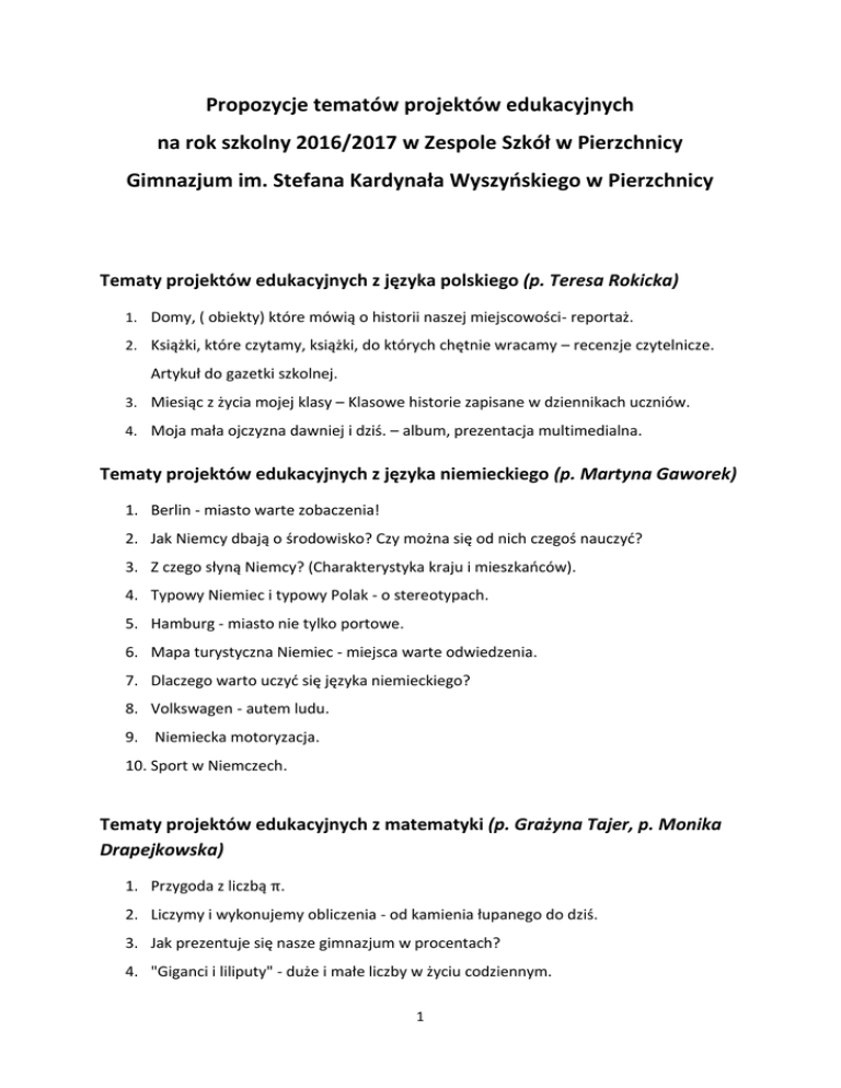Propozycje tematów projektów edukacyjnych na rok szkolny 2016/2017 w Zespole Szkół w Pierzchnicy Gimnazjum im. Stefana Kardynała Wyszyńskiego w Pierzchnicy Tematy projektów edukacyjnych z języka polskiego (p. Teresa Rokicka) 1. Domy, ( obiekty) które mówią o historii naszej miejscowości- reportaż. 2. Książki, które czytamy, książki, do których chętnie wracamy – recenzje czytelnicze. Artykuł do gazetki szkolnej. 3. Miesiąc z życia mojej klasy – Klasowe historie zapisane w dziennikach uczniów. 4. Moja mała ojczyzna dawniej i dziś. – album, prezentacja multimedialna. Tematy projektów edukacyjnych z języka niemieckiego (p. Martyna Gaworek) 1. Berlin - miasto warte zobaczenia! 2. Jak Niemcy dbają o środowisko? Czy można się od nich czegoś nauczyć? 3. Z czego słyną Niemcy? (Charakterystyka kraju i mieszkańców). 4. Typowy Niemiec i typowy Polak - o stereotypach. 5. Hamburg - miasto nie tylko portowe. 6. Mapa turystyczna Niemiec - miejsca warte odwiedzenia. 7. Dlaczego warto uczyć się języka niemieckiego? 8. Volkswagen - autem ludu. 9. Niemiecka motoryzacja. 10. Sport w Niemczech. Tematy projektów edukacyjnych z matematyki (p. Grażyna Tajer, p. Monika Drapejkowska) 1. Przygoda z liczbą . 2. Liczymy i wykonujemy obliczenia - od kamienia łupanego do dziś. 3. Jak prezentuje się nasze gimnazjum w procentach? 4. "Giganci i liliputy" - duże i małe liczby w życiu codziennym. 1 Tematy projektów edukacyjnych z języka angielskiego (p. Anna Bekier) 1. Podróż przez najpiękniejsze miejsca Wielkiej Brytanii. 2. Sławni obywatele krajów anglojęzycznych. 3. Brytyjska rodzina królewska – kto jest kim? 4. Ikony muzyki rozrywkowej. 5. 10 największych osiągnięć Stanów Zjednoczonych i Wielkiej Brytanii. 6. Jak chciałbyś spędzić tydzień w Londynie? Zaplanuj wycieczkę. 7. Kraje anglojęzyczne, o których mało wiemy: Nowa Zelandia, Malta, Australia. 8. Słynne budowle krajów anglojęzycznych. 9. Brytyjski i amerykański angielski. 10. Wszyscy jesteśmy Europejczykami. Tematy projektów edukacyjnych z języka angielskiego (p. Anna Szrek) 1. Wpływ języka angielskiego na język współczesnej młodzieży. Tematy projektów edukacyjnego z biologii (p. Małgorzata Kula) 1. Badanie zanieczyszczeń powietrza za pomocą skali porostowej na terenie gminy Pierzchnica. Tematy projektów edukacyjnych z fizyki (p. Agnieszka Wójcik) 1. Ciekawe zjawiska fizyczne – pioruny. 2. Rozszerzalność temperaturowa ciał. Zastosowanie zjawiska rozszerzalności temperaturowej ciał stałych i cieczy, wykorzystanie wiedzy na ten temat w życiu człowieka, przykłady konsekwencji rozszerzalności temperaturowej. 2 wynikających z lekceważenia zjawiska Tematy projektów edukacyjnych z historii (p. Piotr Makuch) 1. Żołnierze wyklęci , panny niepokorne – kampania reklamowa. 2. W cieniu męża – o życiu i działalności królewskich małżonek. 3. Historia subkultur młodzieżowych – czy na pewno powód do niepokoju? 4. Królewscy okrutnicy – czy zastraszanie to najlepszy sposób na sprawowanie władzy? 5. Etos rycerski dziś – czy to możliwe? 6. Nasi na scenie, płytach, w teledyskach – historia kieleckiej muzyki rozrywkowej. 7. Czwarta władza, czyli wpływ środków masowego przekazu na życie społeczeństwa. 8. "Halo Szpicbródka " – przestępczość w Polsce w okresie międzywojennym. Tematy projektów edukacyjnych z geografii (p. Paweł Ślusarczyk) 1. Jak zmieniała się struktura wiekowa lokalnej społeczności w moim regionie? 2. Zapraszamy do gminy Pierzchnica – przewodnik turystyczny. Tematy projektów edukacyjnych z wychowania fizycznego (p. Monika Drapejkowska) 1. Jakie były największe sukcesy polskich sportowców w ostatnim półwieczu? 2. Jak młodzież spędzała czas wolny dawniej, a jak dziś? 3. Co może powodować brak aktywności fizycznej 4. Mistrzowie sportu rodem ze świętokrzyskiego. 5. Moja ulubiona dyscyplina sportowa wczoraj i dzisiaj. 6. Aktywność fizyczna- uniwersalny lek XXI wieku. 7. Coca-cola, Sprite, Red-Bull – pić czy nie pić? 8. Jeść fast-foody, czy nie jeść, oto jest pytanie? 9. Jak można spędzać czas wolny? Mało znane gry i zabawy rekreacyjne. 10. Choroby cywilizacyjne – czy można się przed nimi ustrzec? Tematy projektów edukacyjnych z fizyki (p. Barbara Walkowicz - Sikora) 1. Środek ciężkości. 2. Ciśnienie powietrza. 3. Woda – białe bogactwo. 3