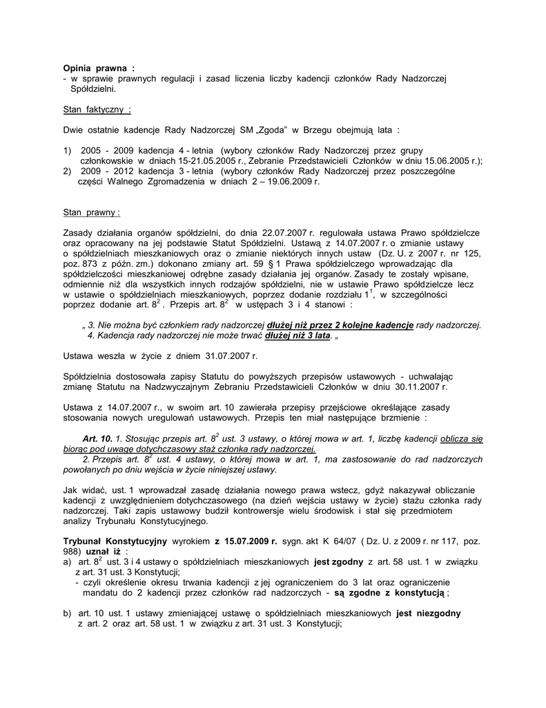 Opinia prawna : - w sprawie prawnych regulacji i zasad liczenia liczby kadencji członków Rady Nadzorczej Spółdzielni. Stan faktyczny : Dwie ostatnie kadencje Rady Nadzorczej SM „Zgoda” w Brzegu obejmują lata : 2005 - 2009 kadencja 4 - letnia (wybory członków Rady Nadzorczej przez grupy członkowskie w dniach 15-21.05.2005 r., Zebranie Przedstawicieli Członków w dniu 15.06.2005 r.); 2) 2009 - 2012 kadencja 3 - letnia (wybory członków Rady Nadzorczej przez poszczególne części Walnego Zgromadzenia w dniach 2 – 19.06.2009 r. 1) Stan prawny : Zasady działania organów spółdzielni, do dnia 22.07.2007 r. regulowała ustawa Prawo spółdzielcze oraz opracowany na jej podstawie Statut Spółdzielni. Ustawą z 14.07.2007 r. o zmianie ustawy o spółdzielniach mieszkaniowych oraz o zmianie niektórych innych ustaw (Dz. U. z 2007 r. nr 125, poz. 873 z późn. zm.) dokonano zmiany art. 59 § 1 Prawa spółdzielczego wprowadzając dla spółdzielczości mieszkaniowej odrębne zasady działania jej organów. Zasady te zostały wpisane, odmiennie niż dla wszystkich innych rodzajów spółdzielni, nie w ustawie Prawo spółdzielcze lecz 1 w ustawie o spółdzielniach mieszkaniowych, poprzez dodanie rozdziału 1 , w szczególności 2 2 poprzez dodanie art. 8 . Przepis art. 8 w ustępach 3 i 4 stanowi : „ 3. Nie można być członkiem rady nadzorczej dłużej niż przez 2 kolejne kadencje rady nadzorczej. 4. Kadencja rady nadzorczej nie może trwać dłużej niż 3 lata. „ Ustawa weszła w życie z dniem 31.07.2007 r. Spółdzielnia dostosowała zapisy Statutu do powyższych przepisów ustawowych - uchwalając zmianę Statutu na Nadzwyczajnym Zebraniu Przedstawicieli Członków w dniu 30.11.2007 r. Ustawa z 14.07.2007 r., w swoim art. 10 zawierała przepisy przejściowe określające zasady stosowania nowych uregulowań ustawowych. Przepis ten miał następujące brzmienie : 2 Art. 10. 1. Stosując przepis art. 8 ust. 3 ustawy, o której mowa w art. 1, liczbę kadencji oblicza się biorąc pod uwagę dotychczasowy staż członka rady nadzorczej. 2 2. Przepis art. 8 ust. 4 ustawy, o której mowa w art. 1, ma zastosowanie do rad nadzorczych powołanych po dniu wejścia w życie niniejszej ustawy. Jak widać, ust. 1 wprowadzał zasadę działania nowego prawa wstecz, gdyż nakazywał obliczanie kadencji z uwzględnieniem dotychczasowego (na dzień wejścia ustawy w życie) stażu członka rady nadzorczej. Taki zapis ustawowy budził kontrowersje wielu środowisk i stał się przedmiotem analizy Trybunału Konstytucyjnego. Trybunał Konstytucyjny wyrokiem z 15.07.2009 r. sygn. akt K 64/07 ( Dz. U. z 2009 r. nr 117, poz. 988) uznał iż : 2 a) art. 8 ust. 3 i 4 ustawy o spółdzielniach mieszkaniowych jest zgodny z art. 58 ust. 1 w związku z art. 31 ust. 3 Konstytucji; - czyli określenie okresu trwania kadencji z jej ograniczeniem do 3 lat oraz ograniczenie mandatu do 2 kadencji przez członków rad nadzorczych - są zgodne z konstytucją ; b) art. 10 ust. 1 ustawy zmieniającej ustawę o spółdzielniach mieszkaniowych jest niezgodny z art. 2 oraz art. 58 ust. 1 w związku z art. 31 ust. 3 Konstytucji; - czyli przepis został uchylony z dniem 27.07.2009 r. (data publikacji wyroku TK), a co za tym 2 idzie przepis art. 8 ust. 3 i 4 mają zastosowanie do rad nadzorczych powołanych po dniu wejścia w życie ustawy z 14.07.2007 r., zatem od dnia 31.07.2007 r. Trybunał Konstytucyjny stwierdził m.in. : 2 „Przepis art. 10 ust. 1 ustawy zmieniającej stanowi, że stosując przepis art. 8 ust. 3 u.s.m., zgodnie z którym nie można być członkiem rady nadzorczej dłużej niż przez 2 kolejne kadencje rady nadzorczej, liczbę kadencji oblicza się, biorąc pod uwagę dotychczasowy staż członka rady nadzorczej. W ocenie Trybunału Konstytucyjnego, kwestionowany przepis oznacza arbitralną ingerencję w stosunki prawne powstałe w przeszłości i trwające nadal (naruszenie art. 2 Konstytucji). Jak stwierdził Trybunał w wyroku z 26 maja 1998 r. (sygn. K. 17/98, OTK ZU nr 4/1998, poz. 48), ewentualne zmiany długości kadencji powinny wywoływać skutki pro futuro. Z istoty kadencyjności wynika, że długość kadencji nie powinna być modyfikowana w odniesieniu do organu urzędującego. Spółdzielcy, wybierając określony skład rady nadzorczej, udzielają mu jednocześnie pełnomocnictw o określonej przez prawo treści i określonym czasie "ważności". Ponadto Trybunał Konstytucyjny stwierdził, że art. 10 ust. 1 ustawy zmieniającej narusza art. 58 ust. 1 Konstytucji również w innym aspekcie, a mianowicie poprzez ograniczenie autonomii decyzyjnej członków spółdzielni, którzy wcześniej obdarzyli zaufaniem określonych członków rady nadzorczej, a mimo to z dniem wejścia w życie niniejszej regulacji mandat niektórych członków wygasł z mocy prawa (dotyczy to tych, którzy sprawują funkcję dłużej niż kolejną drugą kadencję). Oznacza to ingerencję w wolność zrzeszania się nieznajdującą oparcia w konstytucyjnej zasadzie proporcjonalności (art. 31 ust. 3 2 Konstytucji). O ile wprowadzenie na mocy art. 8 ust. 3 i 4 usm kadencyjności rady nadzorczej znajduje konstytucyjne uzasadnienie (por. sygn. K 42/02), to nagromadzenie na gruncie art. 10 ust. 1 ustawy zmieniającej naruszeń zasad konstytucyjnych (wynikających w szczególności z art. 2 i art. 58 ust. 1 Konstytucji) powoduje, że kwestionowany przepis nie może w sposób pozytywny przejść testu proporcjonalności.” Na podstawie powyższej analizy należy stwierdzić, iż w okresie od 31.07.2007 r. do 27.07.2009 r. obowiązywał przepis, który naruszał Konstytucję. Wyrok TK potwierdził zasadę lex retro non agit - prawo nie może działać wstecz. Tym samym liczbę kadencji, o których mowa w art. 82 ust. 3, ustalamy od kadencji Rady Nadzorczej powołanej po wejściu w życie ustawy z 14.07.2007 r. - czyli powołanej po 31.07.2007 r. Po 31.07.2007 r. Rada Nadzorcza Spółdzielni - członkowi