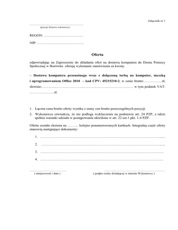 Załącznik nr 1 …………………………………………. (pieczęć firmowa wykonawcy) REGON: …………………………… NIP: ………………………………… Oferta odpowiadając na Zaproszenie do składania ofert na dostawę komputera do Domu Pomocy Społecznej w Borówku oferuję wykonanie zamówienia za kwotę: – Dostawa komputera przenośnego wraz z dołączoną torbą na komputer, myszką i oprogramowaniem Office 2010 – kod CPV: 45215210-2, w cenie brutto:……………zł, słownie:……………………………..…………………………………… w tym podatek VAT: ……………….. zł. 1. Łączna cena brutto oferty wynika z sumy cen brutto poszczególnych pozycji. 2. Wykonawca oświadcza, Ŝe nie podlega wykluczeniu na podstawie art. 24 PZP, a takŜe spełnia warunki udziału w postępowaniu określone w art. 22 ust.1 pkt. 1-4 PZP. Oferta została złoŜona na ……… kolejno ponumerowanych kartkach. Integralną część oferty stanowią następujące dokumenty: 1. ………………………………………………………………………………………....... 2. ………………………………………………………………………………………...... 3. …………………………………………………………………………………………. 4. …………………………………………………………………………………………. …..………………..…………. ( miejscowość i data ) ………..…………………………………………… ( podpis osoby działającej w imieniu Wykonawcy )