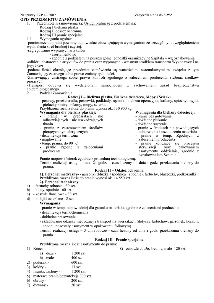 Nr sprawy RZP 42/2009 Załącznik Nr 3a do SIWZ OPIS PRZEDMIOTU ZAMÓWIENIA 1. Przedmiotem zamówienia są: Usługi pralnicze z podziałem na: Rodzaj I bielizna płaska Rodzaj II odzieŜ ochronna Rodzaj III pranie specjalne 1.1. Wymagania ogólne: -pomieszczenia pralni powinny odpowiadać obowiązującym wymaganiom ze szczególnym uwzględnieniem wydzielenia stref brudnej i czystej. -segregowanie wypranych artykułów - asortymentowo - zgodnie z podziałem na poszczególne jednostki organizacyjne Szpitala – wg oznakowania -odbiór i dostarczanie artykułów do prania oraz wypranych - własnym środkiem transportu Wykonawcy i na jego koszt. -podane ilości określające przedmiot zamówienia są wartościami szacunkowymi w związku z tym Zamawiający zastrzega sobie prawo zmiany tych ilości. -Zamawiający zastrzega sobie prawo kontroli zgodnego z zaleceniem producenta stęŜenia środków piorących. -Transport odbywa się wydzielonym samochodem z zachowaniem zasad bezpieczeństwa epidemiologicznego. 2. Podział Zamówienia: Rodzaj I – Bielizna płaska, Bielizna dziecięca, Mopy i Ścierki - poszwy, prześcieradła, poszewki, podkłady, ręczniki, bielizna operacyjna, kaftany, śpiochy, myjki, pieluchy z tetry, piŜamy, mopy, ścierki. PrzybliŜona roczna ilość do prania wynosi ok. 130 900 kg. Wymagania dla bielizny płaskiej: Wymagania dla bielizny dziecięcej: pranie w preparatach nie - pranie bez gotowania odbarwiających i nie uszkadzających - dokładne płukanie tkanin - dokładne suszenie - pranie z zastosowaniem środków - pranie w środkach nie powodujących piorących hypoalergicznych odbarwienia i uszkodzenia materiału - dezynfekcja termiczna - pranie w temp. Zgodnych z - maglowanie zaleceniem producenta - temp. prania: do 90 °C - pranie kończące się procesem - pranie zgodne z zaleceniami sterylizacji oraz pakowaniem producenta asortymentu oddzielnie, zgodnie z oznakowaniem Szpitala. Pranie mopów i ścierek zgodnie z procedurą technologiczną. Termin realizacji usługi – max. 24 godz. – czas liczony od dnia i godz. przekazania bielizny do prania. Rodzaj II – OdzieŜ ochronna 1). Personel medyczny- - garsonki (bluzka +spódnica +spodnie), fartuchy, bluzeczki, podkoszulki PrzybliŜona roczna ilość do prania wynosi ok. 14 550 szt. 2). Personel techniczny a) - fartuchy robocze - 60 szt. b) - bluzy, spodnie - 60 szt. c) - koszule flanelowe - 30 szt. d) - kufajki ocieplane - 8 szt. Wymagania: - pranie w temp. odpowiedniej dla gatunku materiału, zgodnie z zaleceniami producenta - dezynfekcja termochemiczna - dokładne prasowanie - składowanie odzieŜy medycznej i transport na wieszakach (dotyczy fartuchów, garsonek, koszuli, spodni, pozostały asortyment w opakowaniu foliowym). Termin realizacji usługi – 3 dni robocze - czas liczony od dnia i godz. przekazania bielizny do prania. Rodzaj III– Pranie specjalne PrzybliŜona roczna ilość asortymentu do prania: 1) Koce: 8) zabawki /duŜe, średnie, małe 120 szt. a) duŜe 1 200 szt. b) małe 400 szt. 2) poduszki600 szt. 3) kołdry 13 szt. 4) firanki, zasłony 1 200 szt. 5) materace pranie/dezynfekcja 300 szt. 6) obrusy 200 szt. 7) dywany 20 szt. Nr sprawy RZP 42/2009 Załącznik Nr 3a do SIWZ Wymagania: - pranie w środkach bezzapachowych - pranie w temp. odpowiedniej dla gatunku materiału, zgodnie z zaleceniami producenta - pranie w środkach nie odbarwiających tkanin - pranie w środkach hypoalergicznych - składowanie na wieszakach /peleryny/ - składowanie asortymentu płaskiego w workach Termin realizacji usługi - 3 dni robocze - czas liczony od dnia i godz. przekazania bielizny do prania.