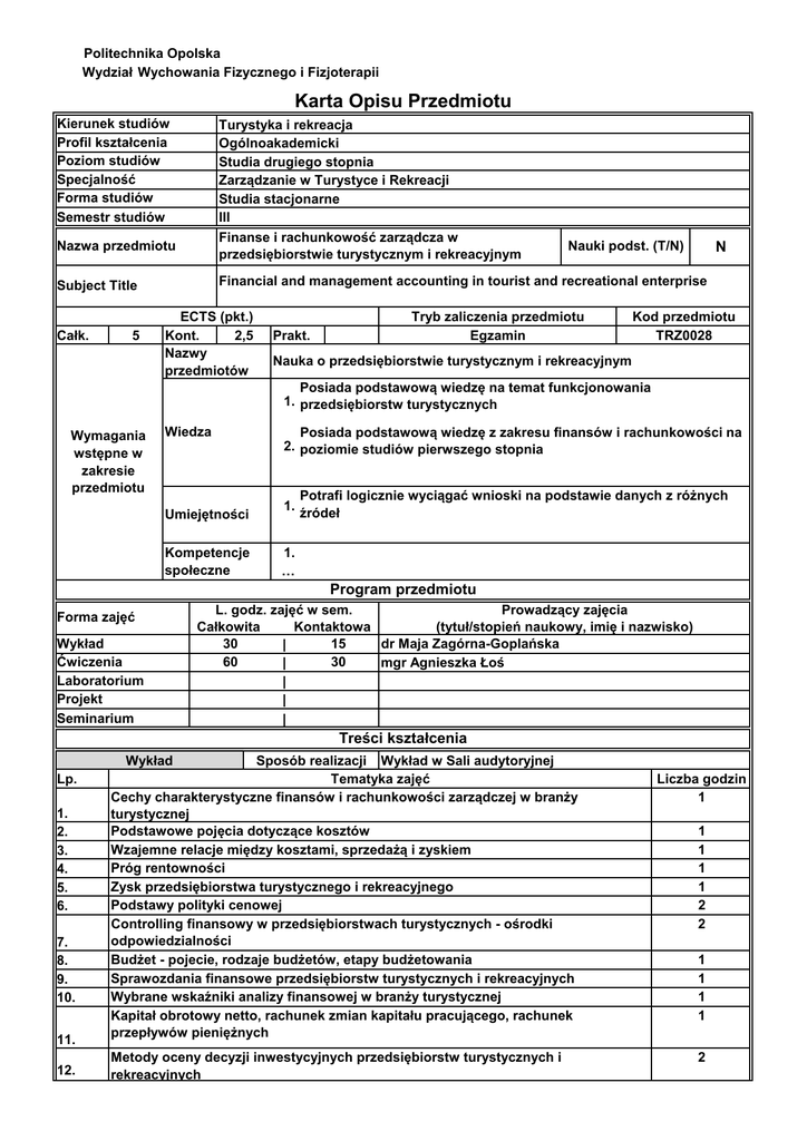 Politechnika Opolska Wydział Wychowania Fizycznego i Fizjoterapii Karta Opisu Przedmiotu Kierunek studiów Profil kształcenia Poziom studiów Specjalność Forma studiów Semestr studiów Turystyka i rekreacja Ogólnoakademicki Studia drugiego stopnia Zarządzanie w Turystyce i Rekreacji Studia stacjonarne III Finanse i rachunkowość zarządcza w przedsiębiorstwie turystycznym i rekreacyjnym Nazwa przedmiotu 5 N Financial and management accounting in tourist and recreational enterprise Subject Title Całk. Nauki podst. (T/N) ECTS (pkt.) Kont. 2,5 Nazwy przedmiotów Prakt. Tryb zaliczenia przedmiotu Egzamin Kod przedmiotu TRZ0028 Nauka o przedsiębiorstwie turystycznym i rekreacyjnym Posiada podstawową wiedzę na temat funkcjonowania 1. przedsiębiorstw turystycznych Wymagania wstępne w zakresie przedmiotu Wiedza Umiejętności Kompetencje społeczne Posiada podstawową wiedzę z zakresu finansów i rachunkowości na 2. poziomie studiów pierwszego stopnia 1. Potrafi logicznie wyciągać wnioski na podstawie danych z różnych źródeł 1. … Program przedmiotu Forma zajęć Wykład Ćwiczenia Laboratorium Projekt Seminarium L. godz. zajęć w sem. Prowadzący zajęcia Całkowita Kontaktowa (tytuł/stopień naukowy, imię i nazwisko) 30 15 dr Maja Zagórna-Goplańska | 60 30 mgr Agnieszka Łoś | | | | Treści kształcenia Wykład Lp. 1. 2. 3. 4. 5. 6. 7. 8. 9. 10. 11. 12. Sposób realizacji Wykład w Sali audytoryjnej Tematyka zajęć Cechy charakterystyczne finansów i rachunkowości zarządczej w branży turystycznej Podstawowe pojęcia dotyczące kosztów Wzajemne relacje między kosztami, sprzedażą i zyskiem Próg rentowności Zysk przedsiębiorstwa turystycznego i rekreacyjnego Podstawy polityki cenowej Controlling finansowy w przedsiębiorstwach turystycznych - ośrodki odpowiedzialności Budżet - pojecie, rodzaje budżetów, etapy budżetowania Sprawozdania finansowe przedsiębiorstw turystycznych i rekreacyjnych Wybrane wskaźniki analizy finansowej w branży turystycznej Kapitał obrotowy netto, rachunek zmian kapitału pracującego, rachunek przepływów pieniężnych Metody oceny decyzji inwestycyjnych przedsiębiorstw turystycznych i rekreacyjnych Liczba godzin 1 1 1 1 1 2 2 1 1 1 1 2 15 L. godz. kontaktowych w sem. Sposoby sprawdzenia zamierzonych Egzamin pisemny efektów kształcenia Sposób realizacji Ćwiczenia w sali ćwiczeniowej Ćwiczenia Lp. Tematyka zajęć Wprowadzenie do finansów i rachunkowości zarządczej i finansów w 1. przedsiębiorstwie turystycznym i rekreacyjnym 2. Koszty i ich klasyfikacja w przedsiębiorstwie turystycznym i rekreacyjnym 3. Metody szacowania kosztów stałych i zmiennych 4. Rentowność przedsiębiorstwa turystycznego i rekreacyjnego 5. Analiza wrażliwości zysku - dźwignia operacyjna, finansowa i połączona 6. Mnożniki zysku i zarządzanie zyskiem Polityka cenowa w przedsiębiorstwie turystycznym i rekreacyjnym - metody 7. stosowane w praktyce gospodarczej 8. Rachunkowość ośrodków odpowiedzialnosci, budżetowanie i analiza odchyleń 9. Analiza sprawozdań finansowych dla celów zarządczych 10. Kapitał pracujący w przedsiębiorstwie turystycznym i rekreacyjnym 11. Ocena decyzji inwestycyjnych w perspektywie finansowej Kolokwium zaliczeniowe 12. 15 L. godz. pracy własnej studenta Liczba godzin 2 2 2 4 2 4 2 4 2 2 2 2 30 L. godz. kontaktowych w sem. 30 Aktywność w rozwiązywaniu zadań podczas zajęć, udział w dyskusji, Sposoby sprawdzenia zamierzonych kolokwium zaliczeniowe efektów kształcenia L. godz. pracy własnej studenta Charakteryzuje finansowe uwarunkowania funkcjonowania 1. przedsiębiorstw turystycznych i rekreacyjnych - K_W04 Wiedza Opisuje metody wykorzystywane w finansach i 2. rachunkowości zarządczej przedsiębiorstw turystycznych i rekreacyjnych - K_W10 Wyjaśnia specyfikę finansów i rachunkwości zarządczej w 3. przedsiębiorstwie turystycznym i rekreacyjnym - K_W04 Interpretuje dane zawarte w sprawozdaniach finansowych 1. przedsiębiorstw turystycznych i rekreacyjnych - K_U01 Efekty kształcenia dla przedmiotu - po zakończonym cyklu kształcenia Umiejętności Potrafi wykorzystać posiadaną wiedzę z finansów i 2. rachunkowości zarządczej do prowadzenia działalności gospodarczej w obszarze turystyki - K_U06 Prowadzi wybrane działania z zakresu planowania 3. finansowego w przedsiębiorstwach turystycznych i rekreacyjnych - K_U06 Kompetencje społeczne 1. Metody dydaktyczne: W: wykładinformacyjny; Ć: rozwiązywanie zadań, analiza sprawozdań finansowych, dyskusja moderowana Forma i warunki zaliczenia przedmiotu: Egzamin pisemny (W), kolokwium zaliczeniowe (ĆW) Literatura podstawowa: [1] Kotaś R., Sojak S., Rachunkowość zarzadcza w hotelarstwie i gastronomii, PWE, Warszawa 2009. Nastaj W., Myjkowska I., Rachunkowość zarządcza w hotelarstwie i gastronomii - zbiór zadań, Wyższa [2] Szkoła Turystyki i Hotelrstwa w Gdańsku, Gdańsk 2008. Nastaj W., Rachunkowość zarządzcza w hotelarstwie i gastronomii, Wyższa Szkoła Turystyki i [3] Hotelarstwa w Gdańsku, Gdańsk 2008. Literatura uzupełniająca: Kiziukiewicz T. [red.], Rachunkowość zarządcza: praca zbiorowa. Cz. 2, Zadania i rozwiązania, Ekspert, [1] Wydawnictwo i Doradztwo, Wrocław 2006. Rachunkowość zarządcza : praca zbiorowa / pod red. Teresy Kiziukiewicz ; [aut. Ksenia Czubakowska [2] et al.]. - Wyd. 5 zm. i rozsz. - Wrocław : Ekspert, Wydawnictwo i Doradztwo, 2005. ______________ * niewłaściwe przekreślić ………………………………………………….. ………………………………………………………. (kierownik jednostki organizacyjnej/bezpośredni przełożony: pieczęć/podpis (Dziekan Wydziału pieczęć/podpis)